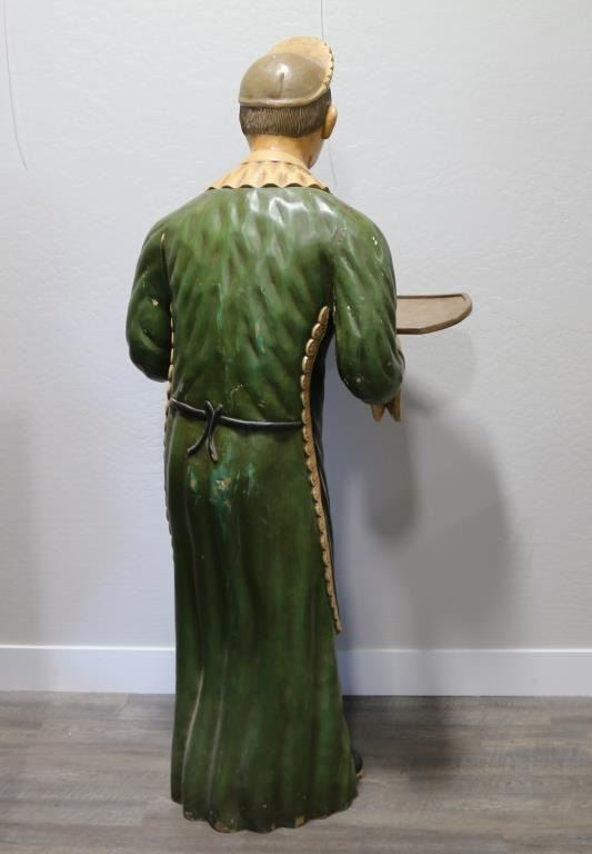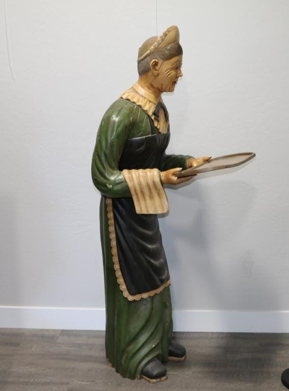 71x26x24 This statue is carved of wood with a plaster overlay, then hand painted and is holding a detachable tray. Small rubs to dress and 18" crack legs shows age.
