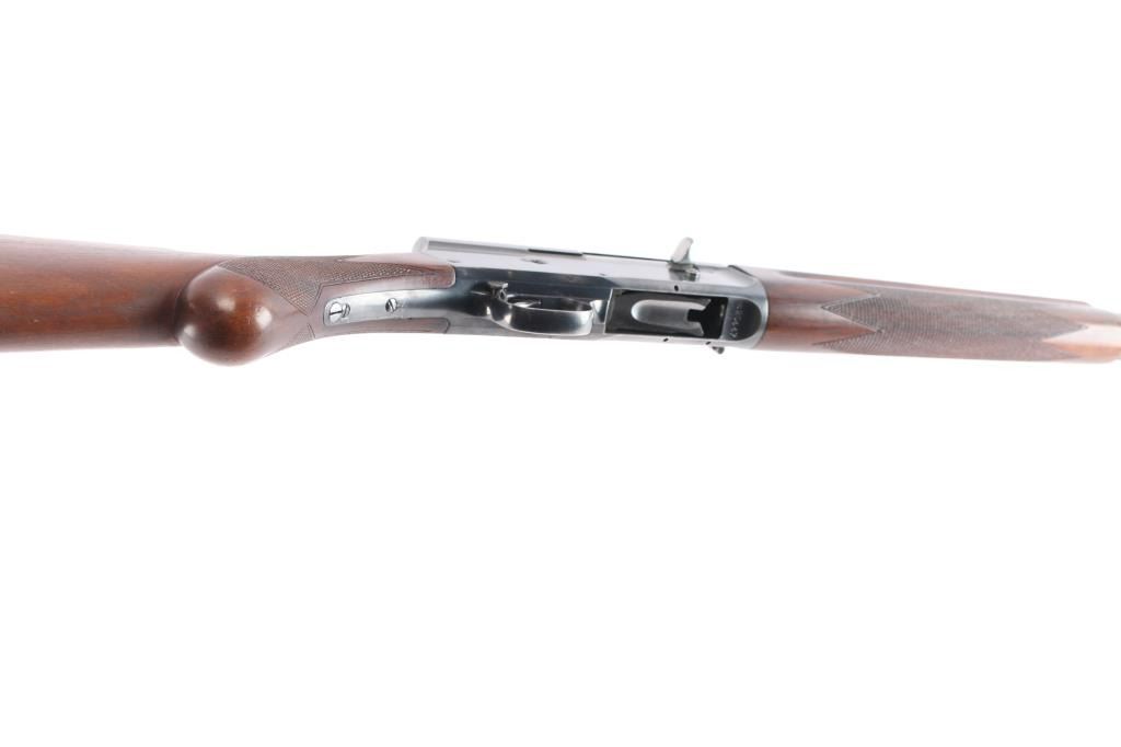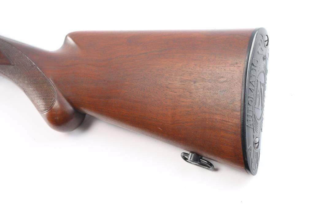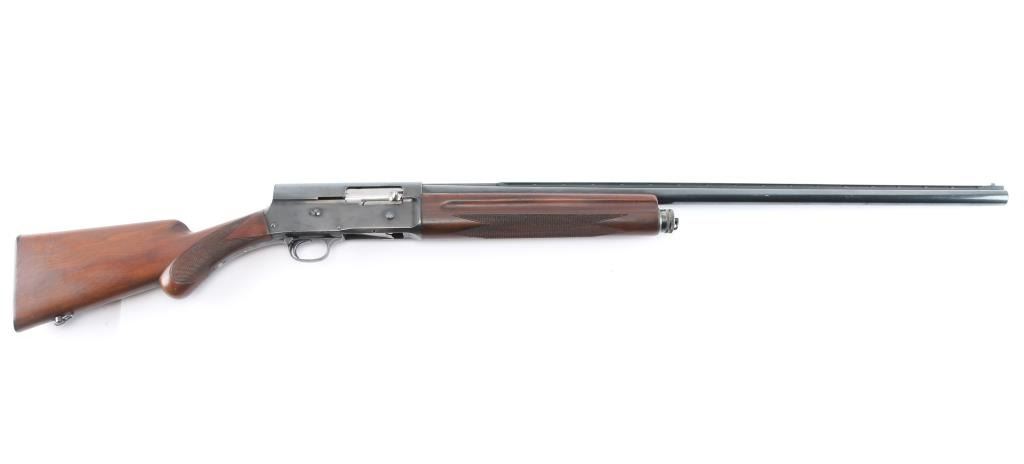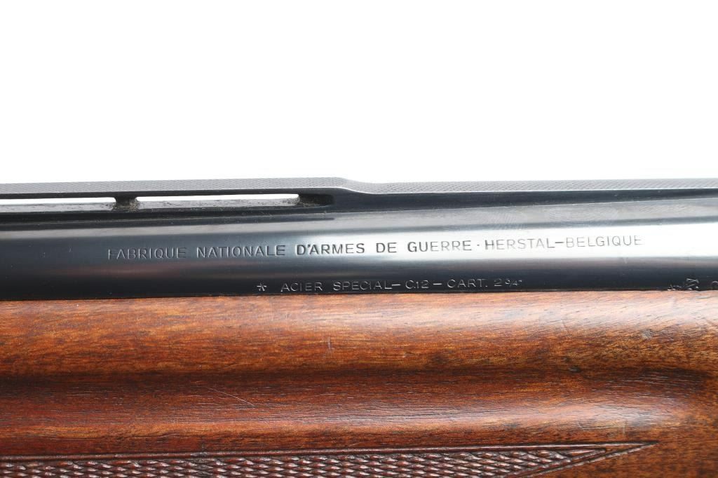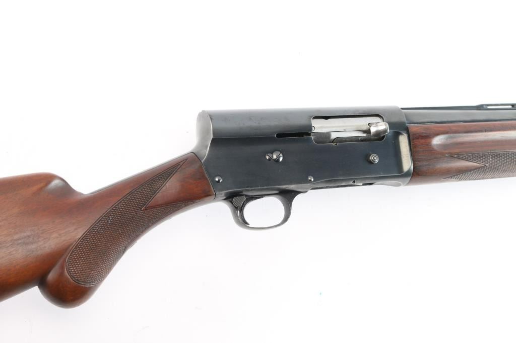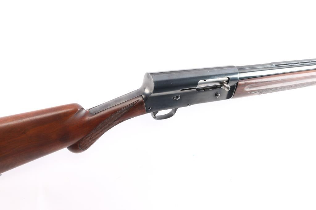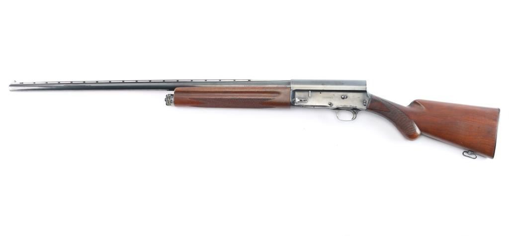 Early pre-war Auto-5 made by Fabrique National in Belgium. No Ogden Utah address, FN address on barrel, left receiver stamped "Browning", barrels marked "Acier Special", (Special Steel). Features blued finish, 29 1/2" barrel, Bradley style white bead front and small brass mid bead sights, manual safety inside triggerguard, mag cut-off on side of receiver, checkered walnut stocks, round knob grip, correct FN hard rubber buttplate and sling swivels. CYL choke. Bore is excellent/bright. Retains about 90% original finish with minor scratches/rubs, handling losses on the bottom metal, there is some light patches of pitting along the bottom of the left receiver with some loss where cleaned. Wood is very good with some normal use and wear.