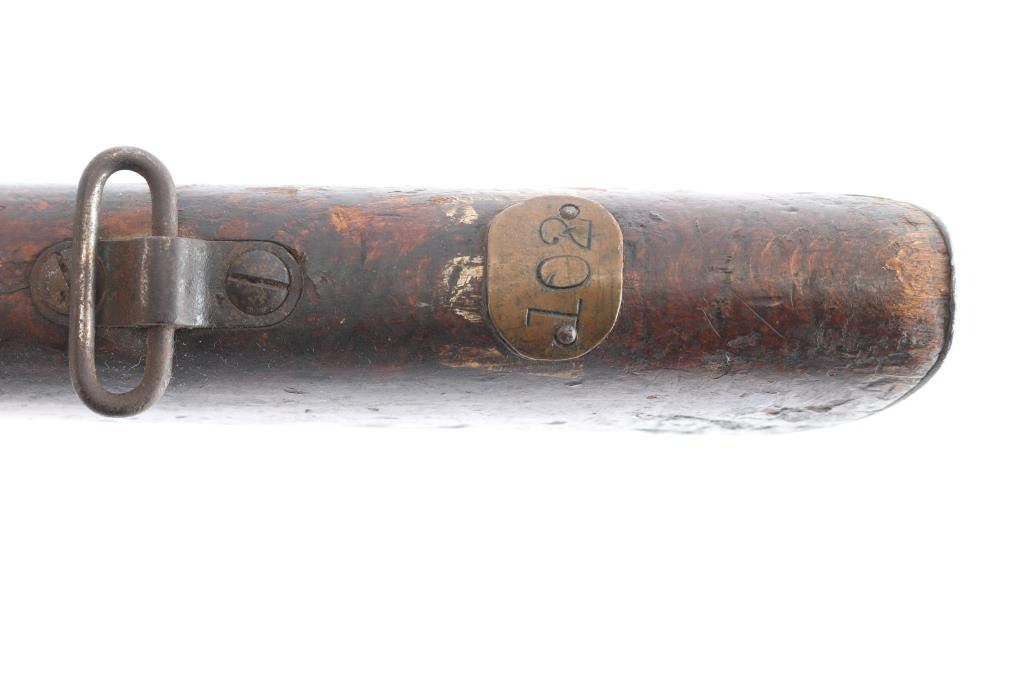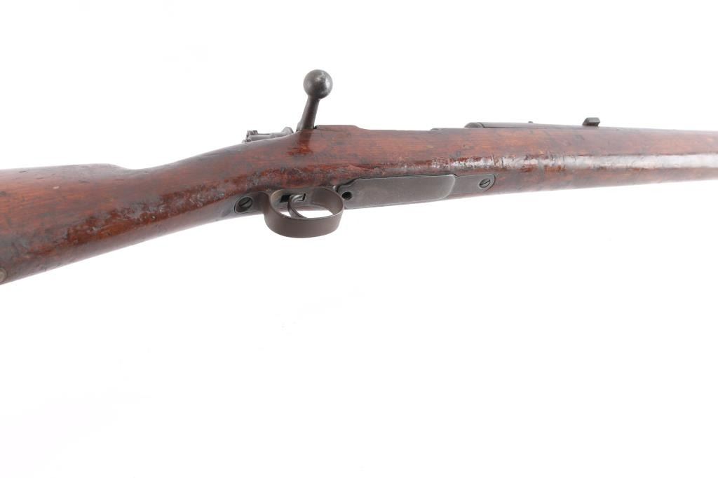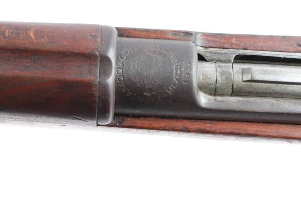 Fabrica Nacional De Armas bolt action rifle chambered in 7x57mm. First domestically manufactured Mexican Military issued rifle. 40,000 Produced between 1910 and 1934. 29" round barrel with inverted "V" blade front sight and adjustable ladder rear sights graduated from 1-18. Straight bolt handle, arsenal markings, Mexican National crest, and "1931" date on receiver ring. Matching serial numbers on receiver and bolt. Smooth straight grip stock, bayonet lug, sling swivels, and flat steel buttplate. Missing cleaning rod. Brass plate with rack number "102" affixed to the underside of buttstock. Imported by CAI, marked on left barrel. Bore is rough with rifling present. Wood is good/sound with many dings, small dents Metal is mostly a brown patina with some dull blue on the barrel. All markings are clear. Action is smooth/tight. A rare rifle.