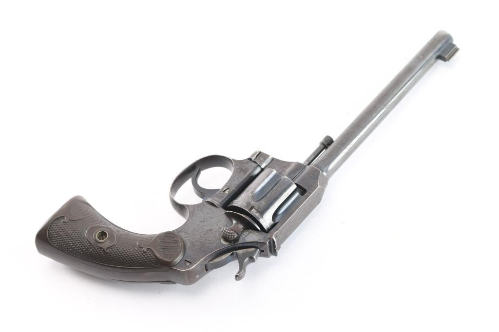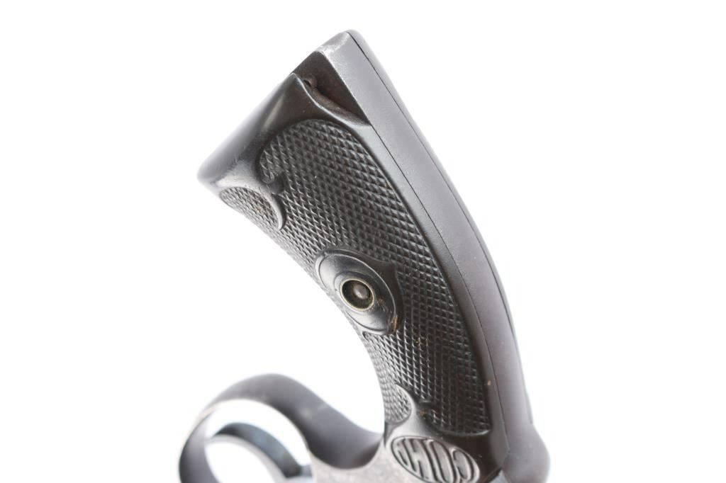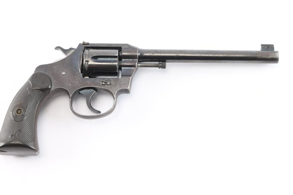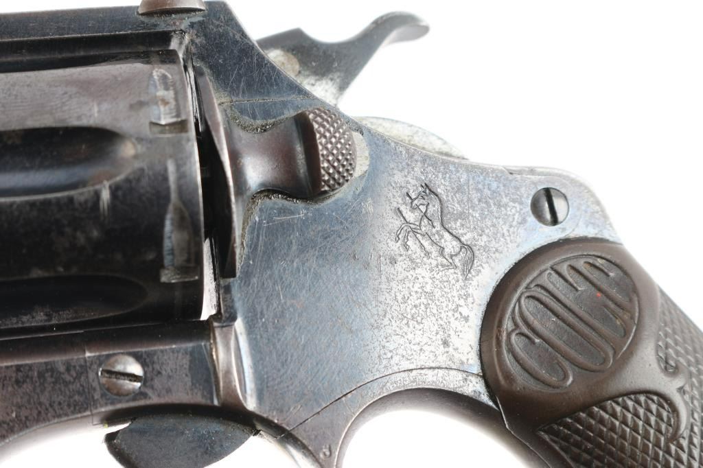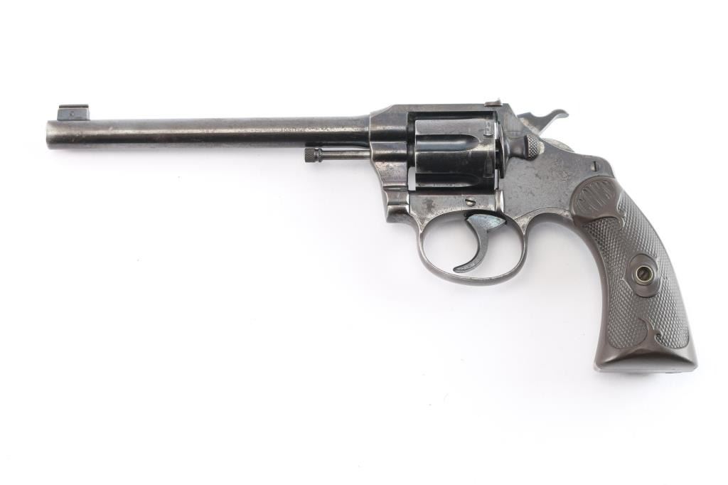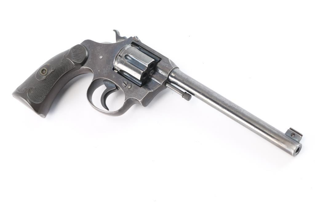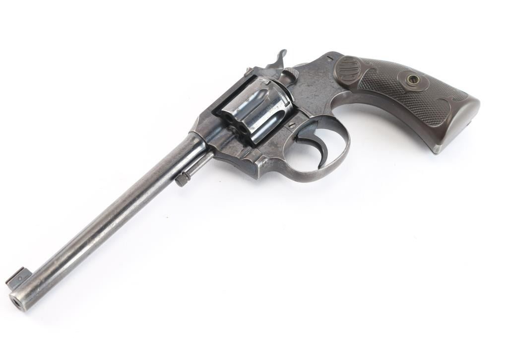 double action target revolver chambered in .22 Winchester Rimfire, circa 1913. Features a blued finish, 6" barrel, blade front sight, fixed notch rear sight, frat top frame, long fluted six-shot cylinder, checkered hammer spur, smooth trigger, and two piece ornate Colt checkered black hard rubber grips. Revolver has about 60% blue finish intact overall with handling wear, edge wear and some scattered light pitting. Action performs as well, bore is good with light pitting, rifling visable, markings are good, and grips are near good with a chip at the heel of the right panel.