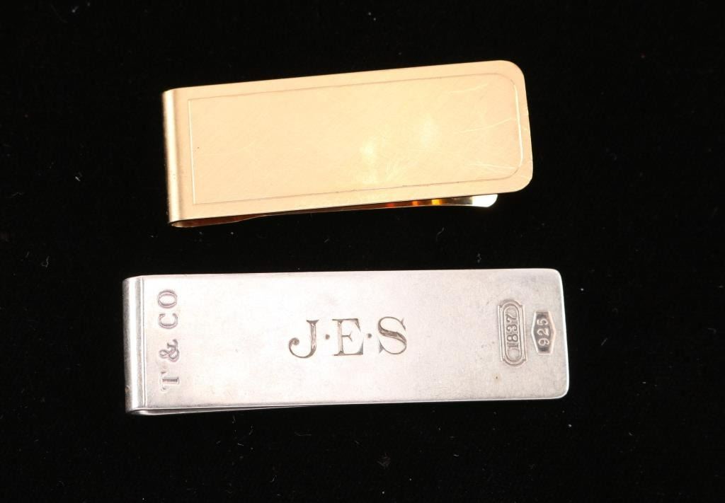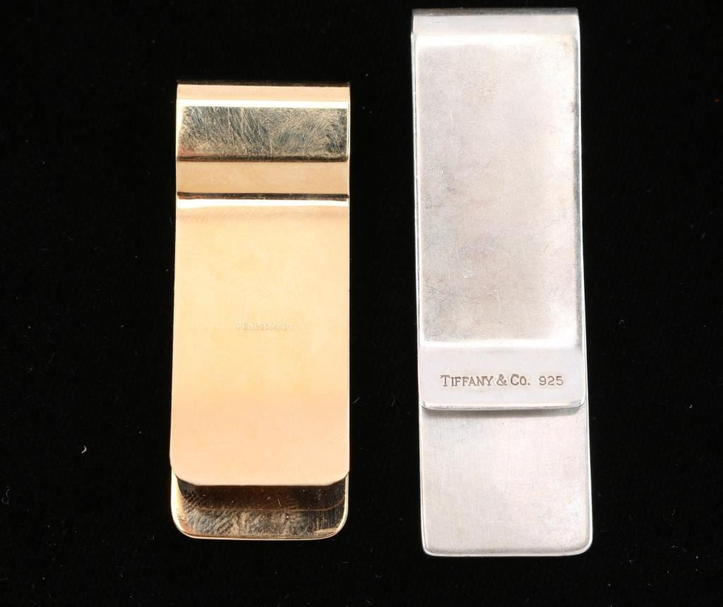 One is 14k gold filled and measures 2. The other is sterling silver by Tiffany & Co., maker marked T&CO, 1837, inscribed with the initials JES.