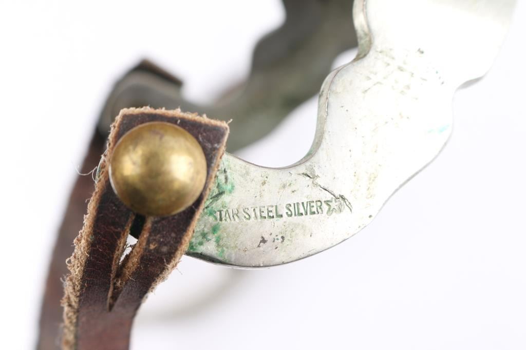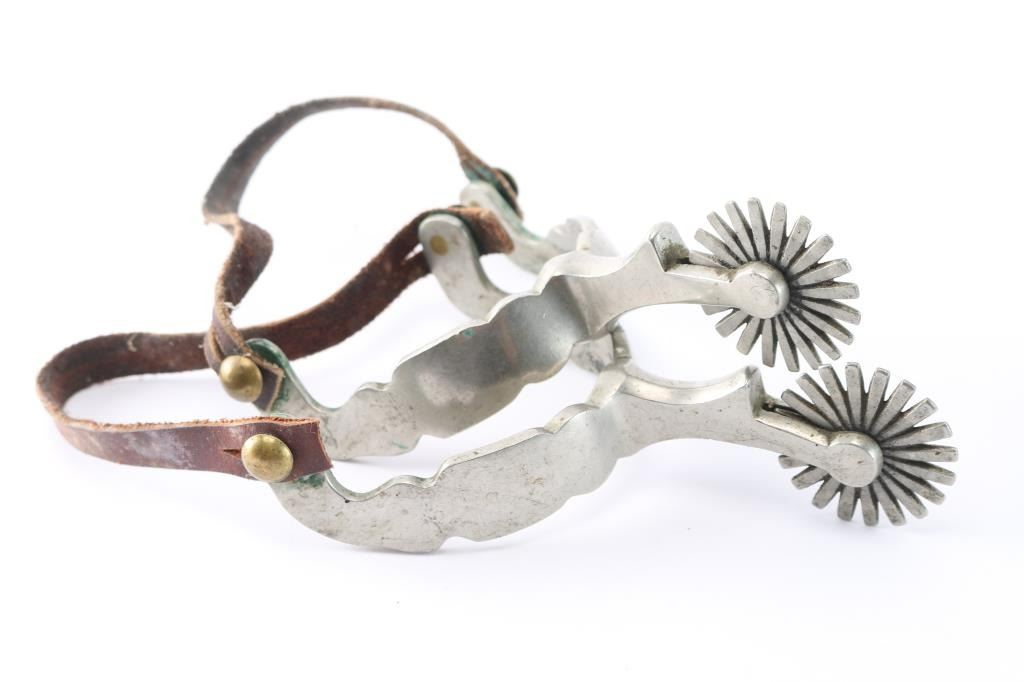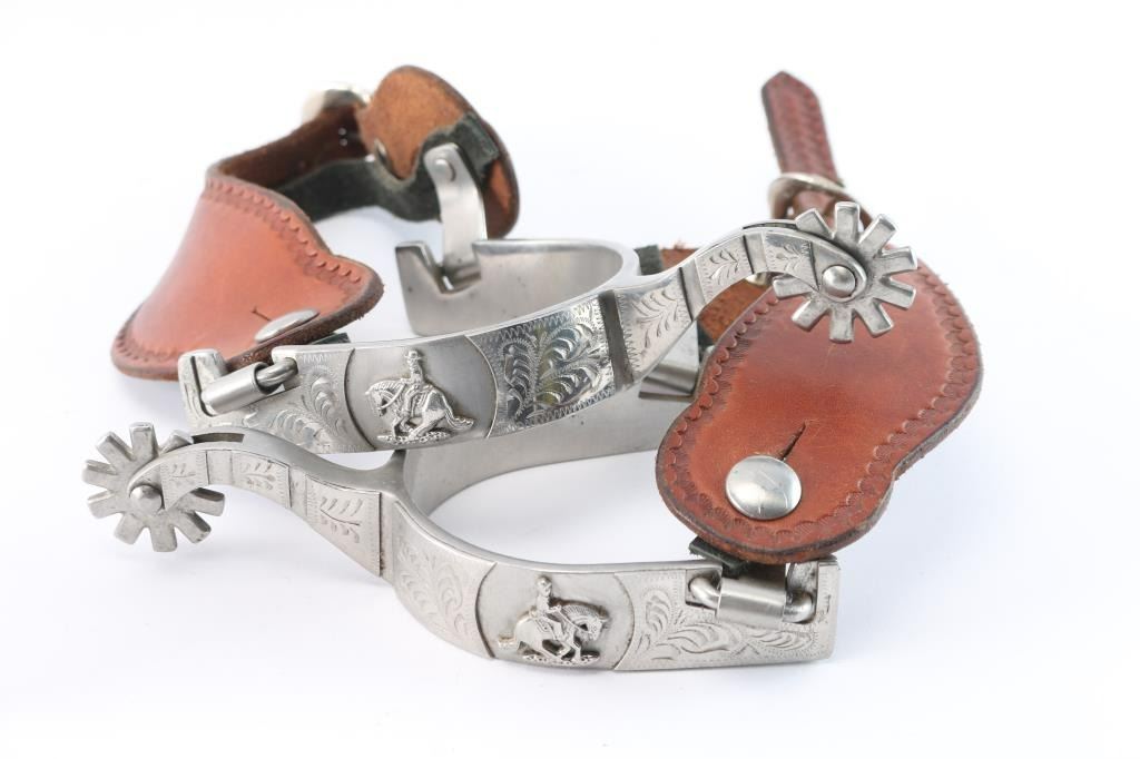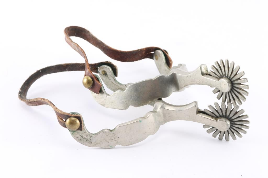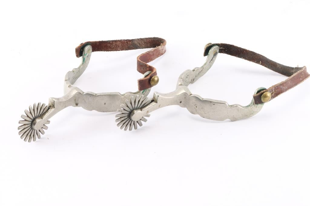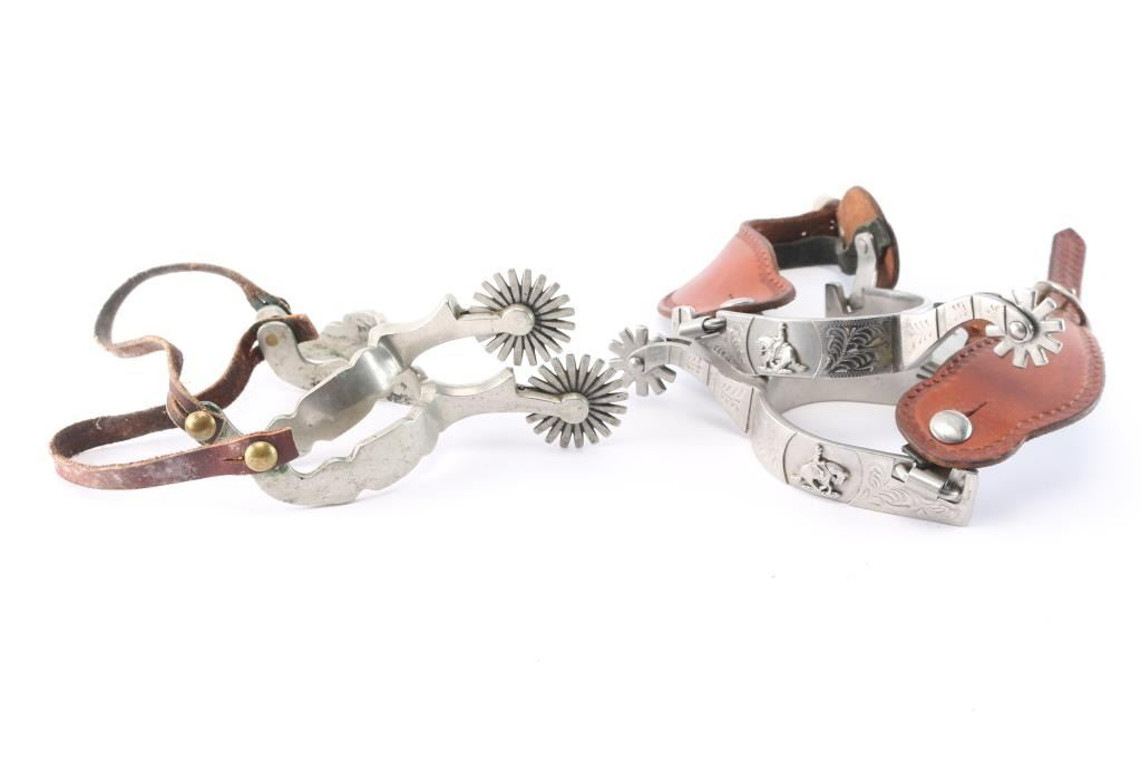 1) Star Steel Spurs With Leather Straps, Plain Aluminum Style Spurs; and 2) unmarked Silver Overlay Spurs.