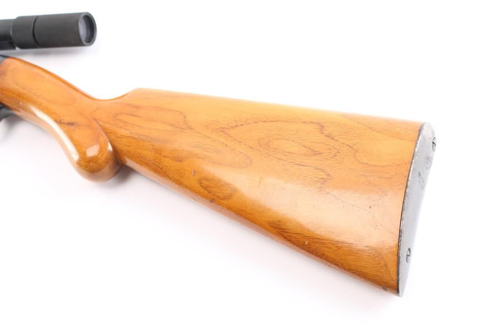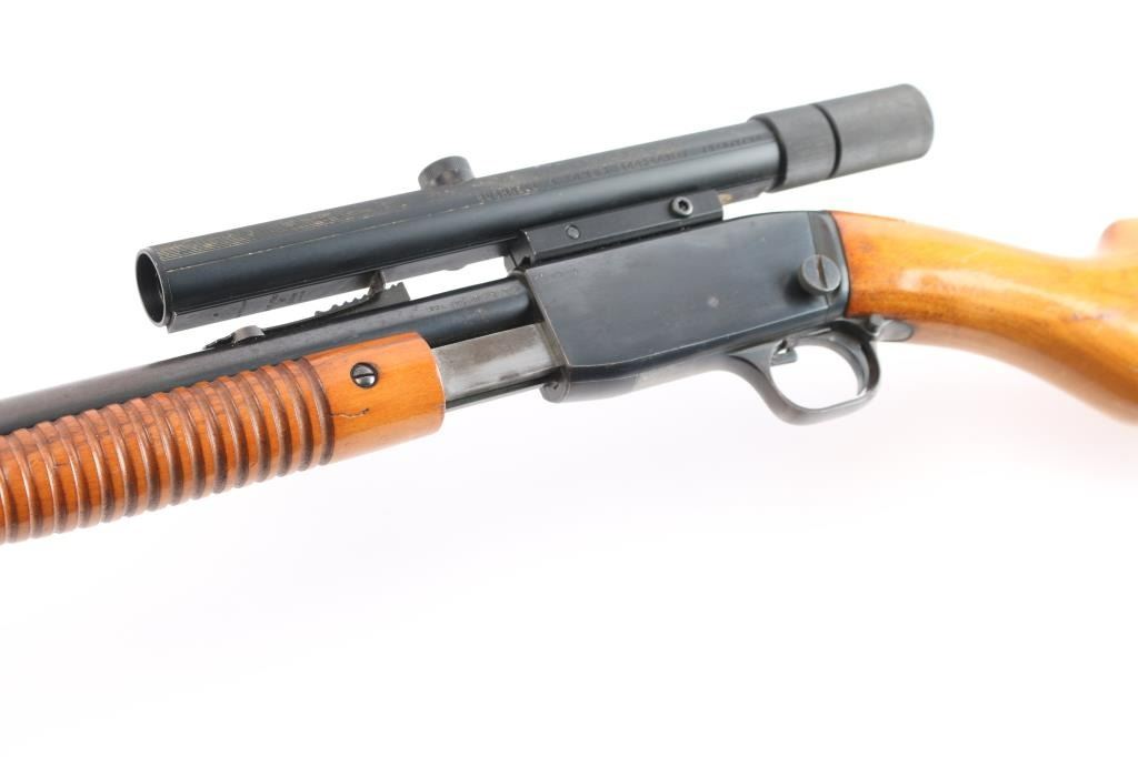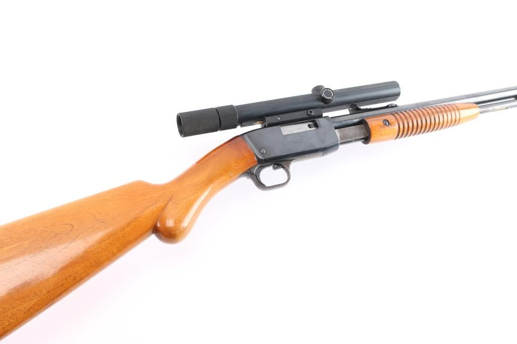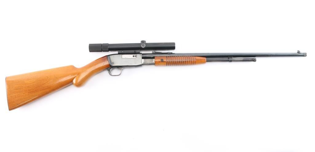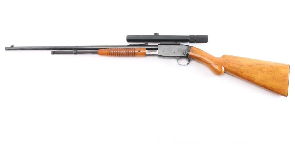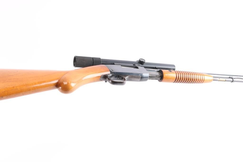 Early production slide action repeating rifle chambered for .22 Long. Manufactured in Belgium by Fabrique Nationale circa 1920s-1940s, imported by LCL Inc. Scottsdale, AZ. It features a blued finish, 22" round tapered barrel, tube magazine, dovetailed bead top blade front sight, adjustable sporter rear sight, Bushnell Scopechief Twentytwo 4x scope, take-down steel receiver with round tang, smooth curved trigger, slide release inside the triggerguard, knurled cross-bolt safety, grooved wood slide handle and smooth semi-pistol grip shoulder stock with smooth metal buttplate. Rifle retains approximately 85% original bluing showing scattered rust/pitting with most of the missing bluing on the trigger guard, buttplate, and magazine tube. Action is mechanically sound, the bore is very good, the optics are slightly hazy with a fine crosshair reticle, the slide handle is very good with light blemishes, and the shoulder stock is good with minor handling wear.