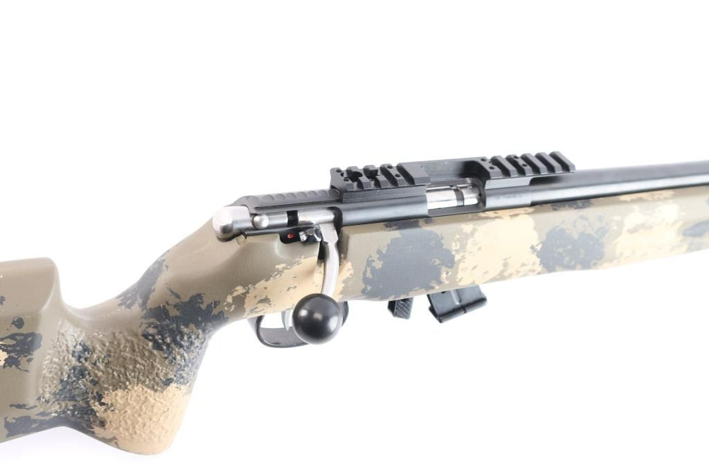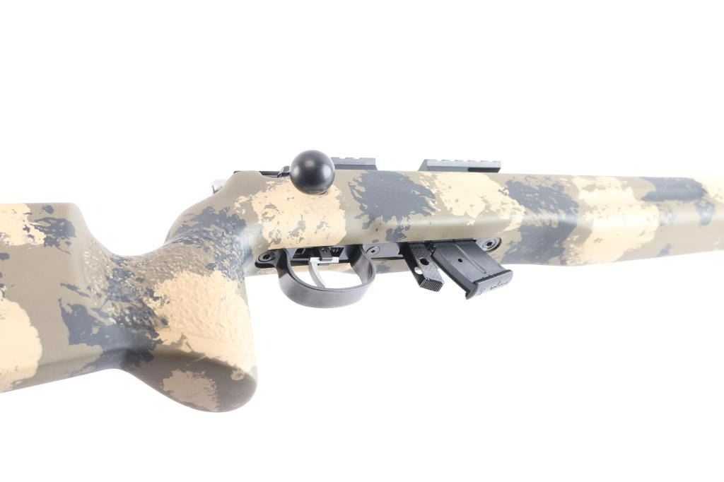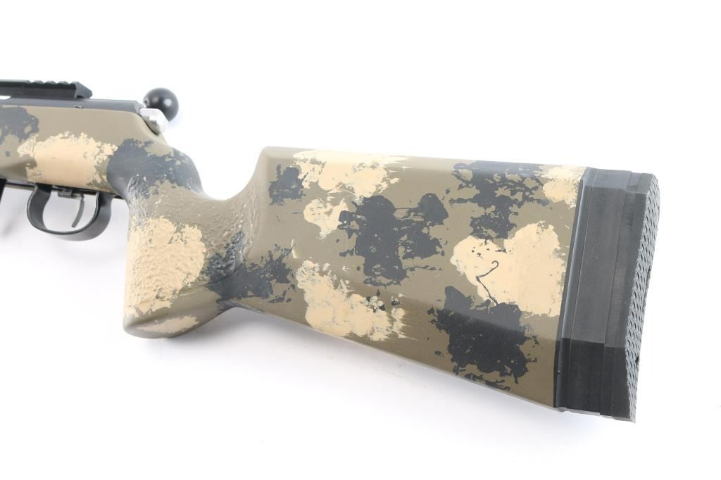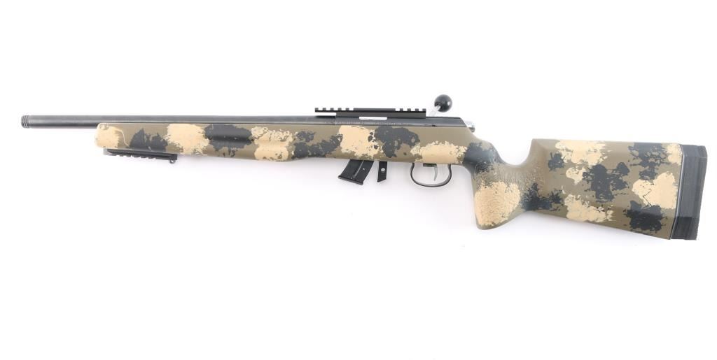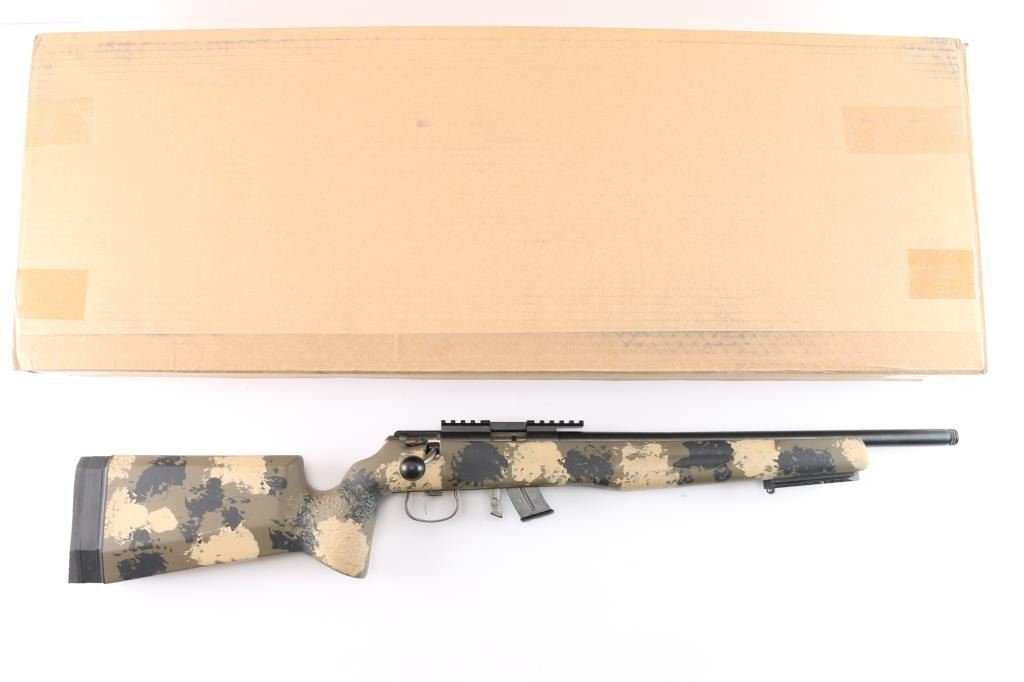 German made .22 caliber magazine fed bolt action sporting rifle by J. G. Anschutz Ulm, Germany, imported by GSI Trussville, AL. Optics ready. 18" medium-weight barrel with threaded muzzle/cap, no provisions for sights. Multi-slot one piece scope base installed on receiver, : 64 bolt action repeater, 5098 two-stage trigger, T6M Manners Stock with 35% aircraft grade carbon fiber and 65% fiberglass in multiple layers. Adjustable butt-plate for length of pull. GAP Molded in camo color, textured grip. Stainless steel bolt with swept-back handle, oversized round polymer knob, manual thumb safety and oversized magazine release. Accessory rail/sling stud installed on underside of fore stock. Bore is pristine, finish and stock are excellent. Date code BG on barrel indicates the rifle was proof tested in 1996. Comes in factory box with spare 5-rd magazine. (2) Total.