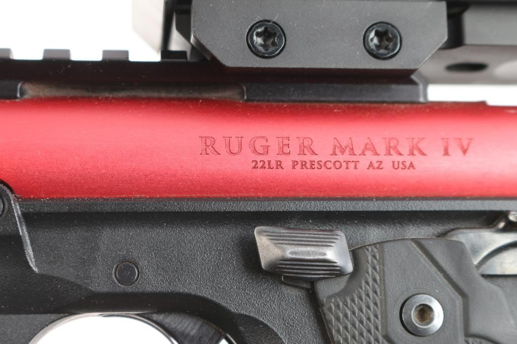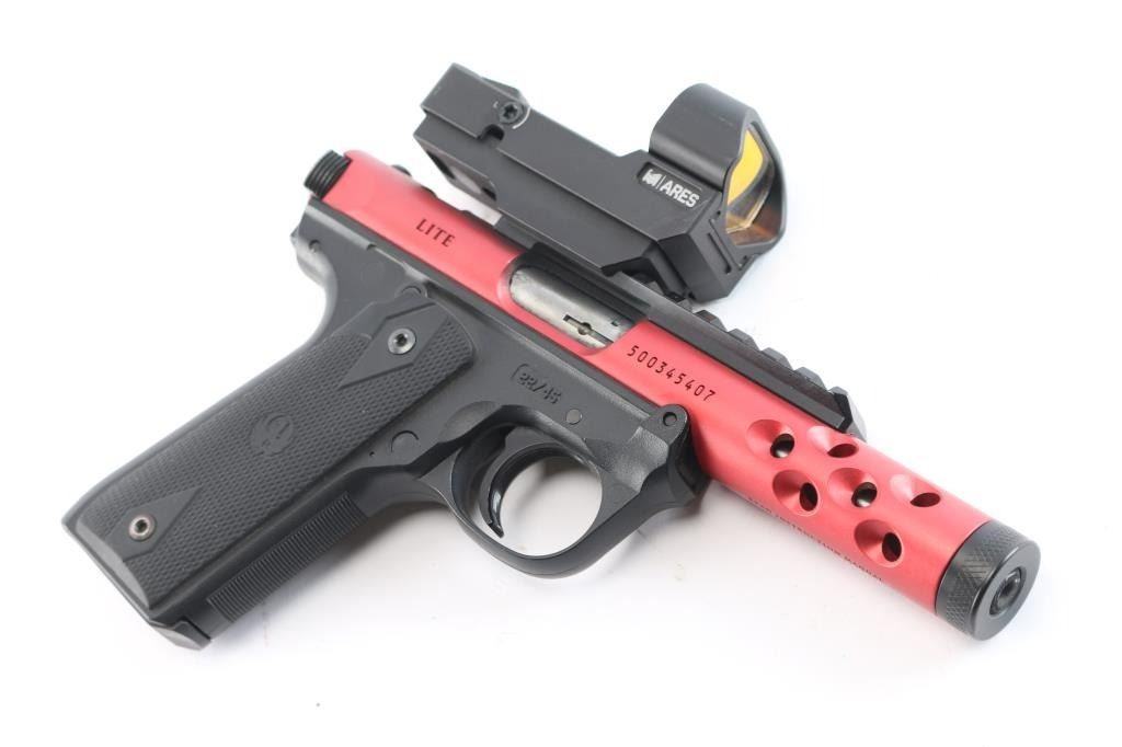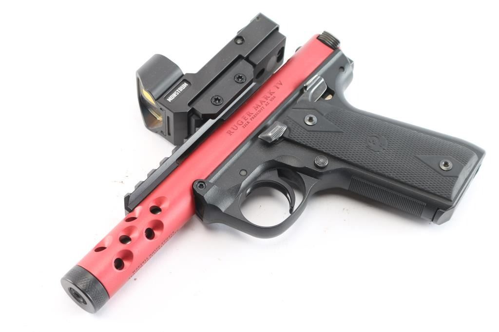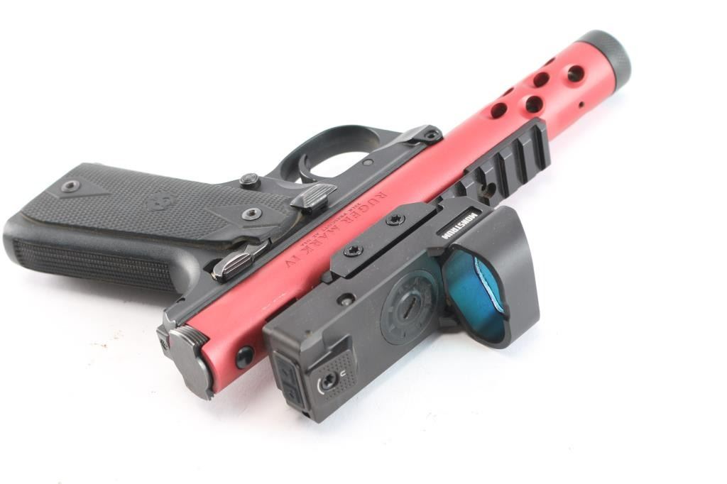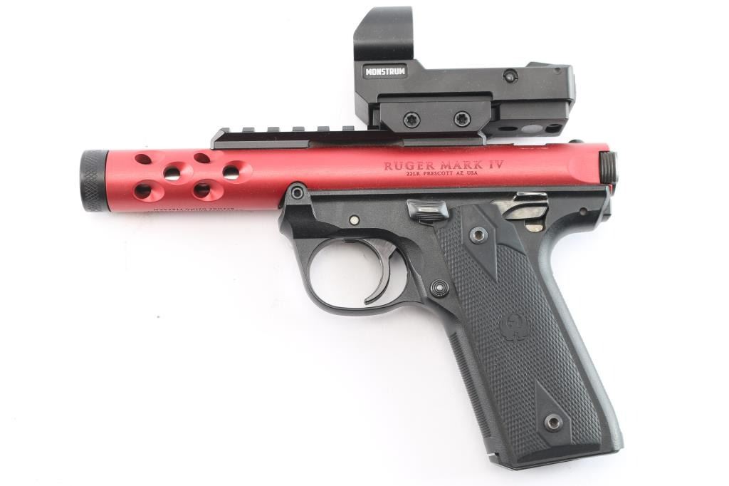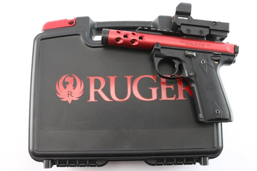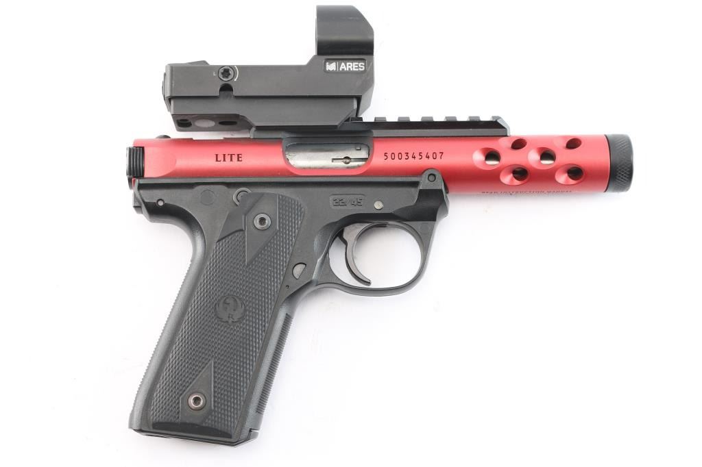 '22/45' Light weight single action semi-automatic target pistol chambered in .22 Long Rifle, manufactured in Prescott, AZ circa 2022. Simple one-button takedown for field-stripping and cleaning. Features a red anodized aluminum receiver with lightening cuts over the barrel, black finished 4.4” cold hammer forged stainless steel barrel with threaded muzzle, knurled thread protector, sights removed and mounted with a Monstrum ARES red dot sight, serrated trigger, concealed hammer, ambidextrous thumb safety mounted on the grip frame, magazine disconnect safety, enlarged slide catch on the left side of the grip frame, push button magazine release, factory 10 round magazine, 1911 profile black polymer grip frame with textured grip straps and two-piece double diamond checkered black rubber grips with molded Ruger insignias. Includes the original factory hard case with documents, factory sights, spare magazine. (2) total. Pistol exhibits no signs of use or wear. Bore is pristine. Sight in good working order.
