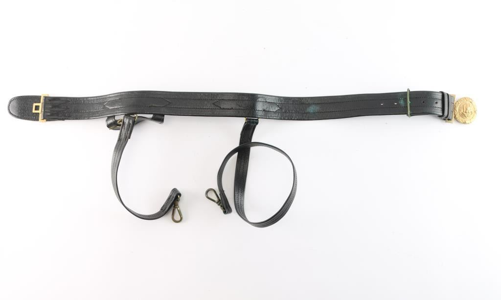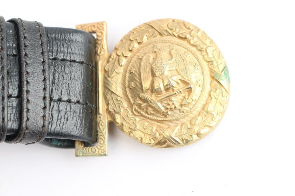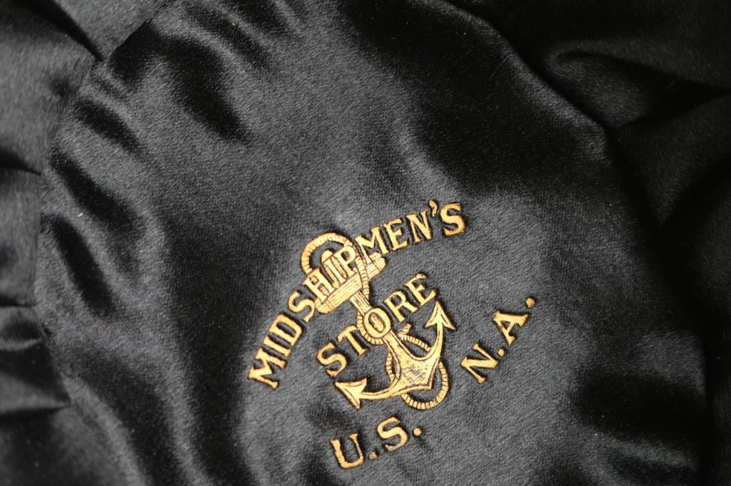 With dress belt in tin and cardboard cases. Hat is French style with gold brocade and beaver felt body. Marked mid-shipman's store U.S.N.A. (Naval Academy). Gold brocade lieutenant's epaulettes with silver anchors. In Japanned finished tin case. Very good plus to near fine condition. Very little use if at all. Circa 1880-1900's early. Along with near mint gold plated navy officer's buckle with sword handguns in H. H. Marked original cardboard box marked Navy undress sword belt size 34.