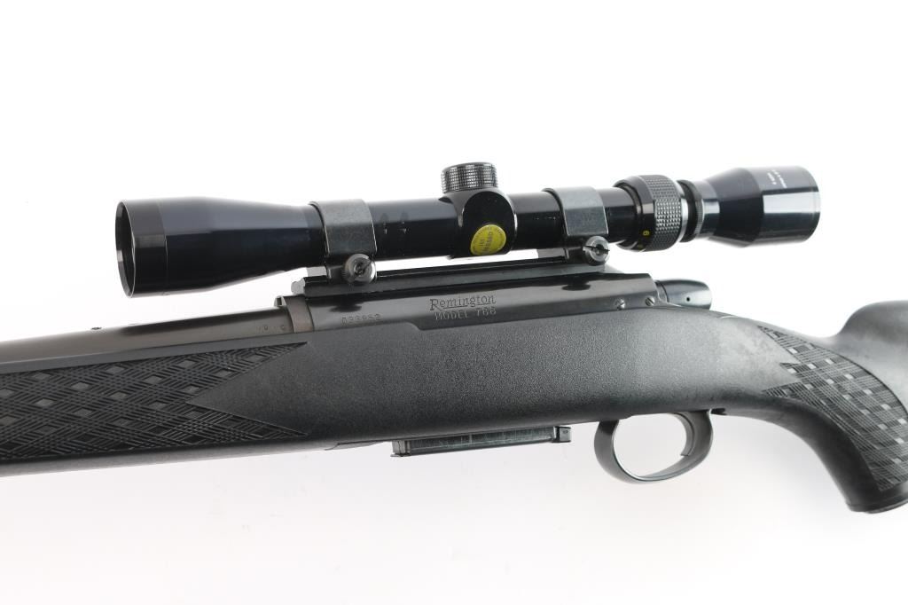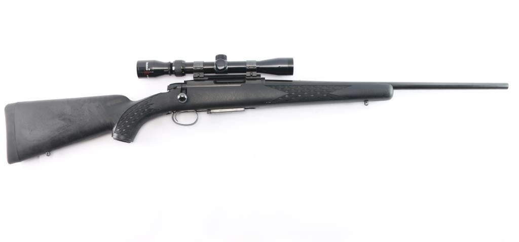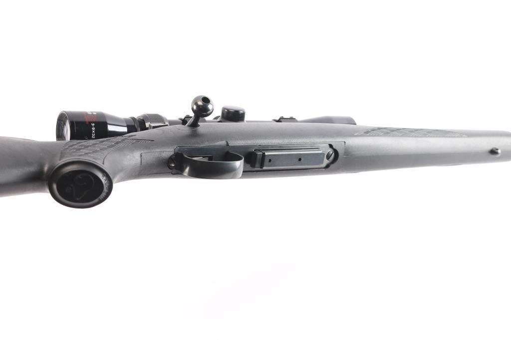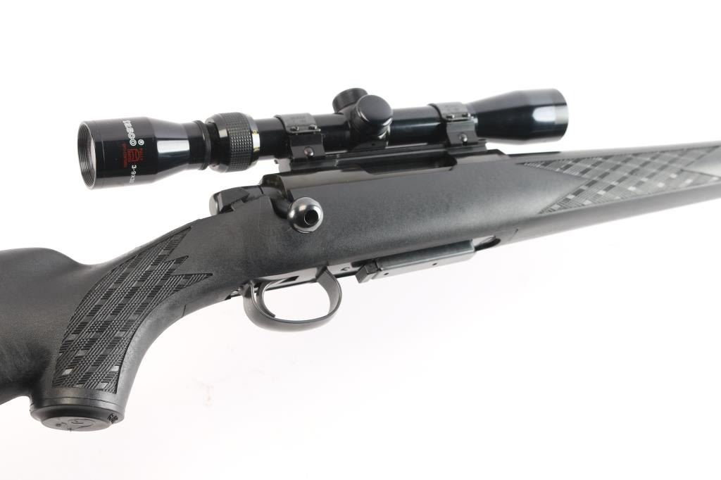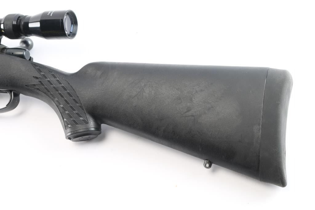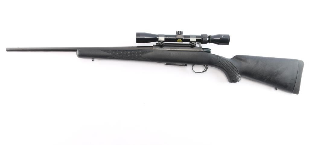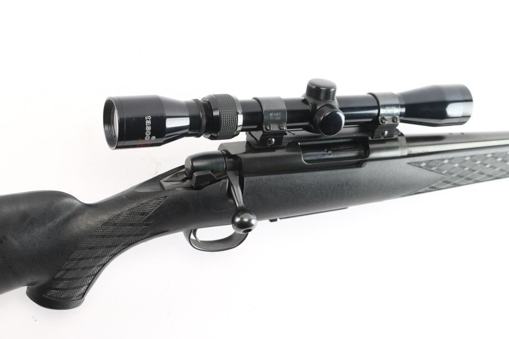 Bolt action magazine repeating rifle. Features blued finish, 22" barrel, sights removed, has filler screws, manual thumb safety, one piece mount with Weaver rings mounted with a Tasco 3-9x32 scope, duplex reticle, clear optics, black polymer stock with impressed checkering, solid rubber recoil pad, sling studs. Bore is excellent/bright. Very good overall showing light use, some dried grease. Includes one detachable 3-rd magazine. 1982 date code.