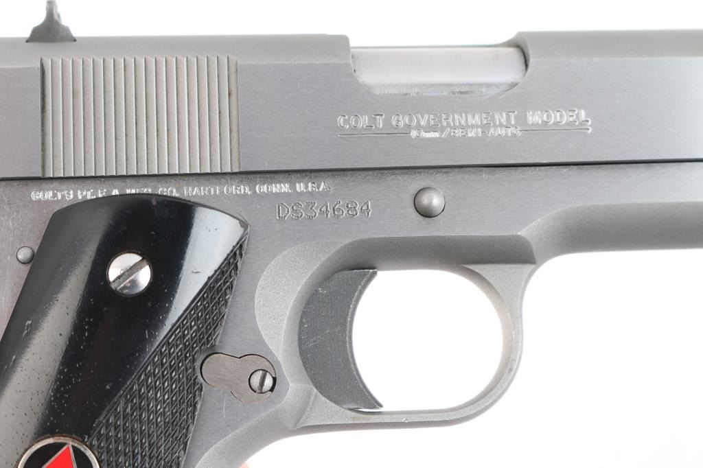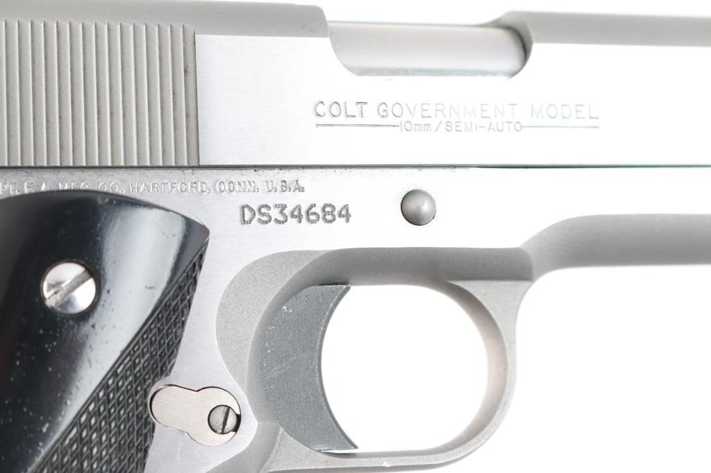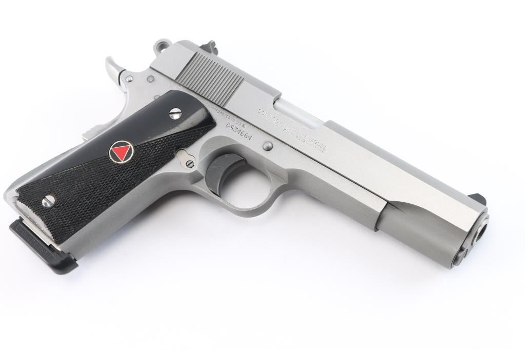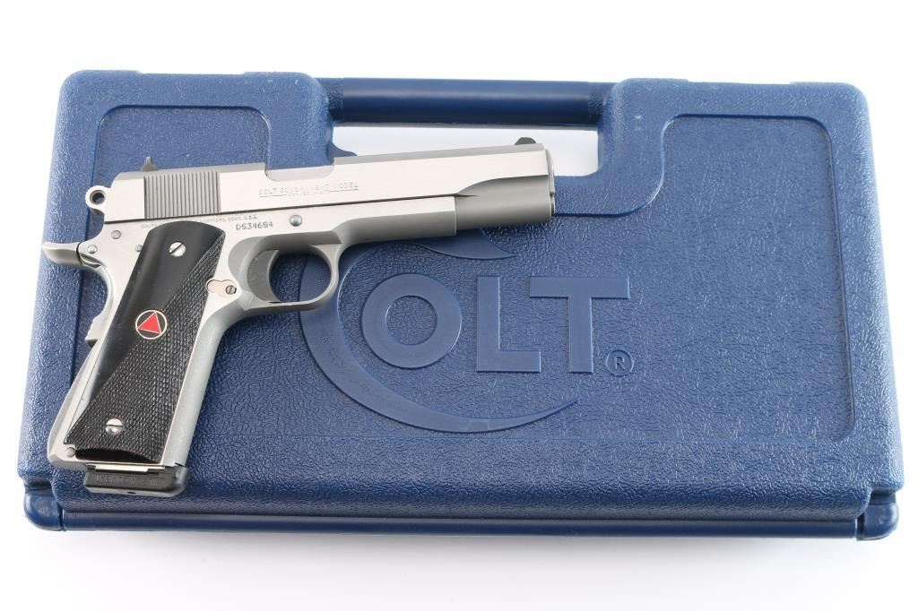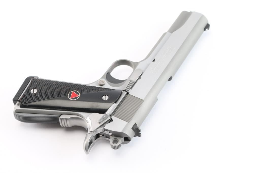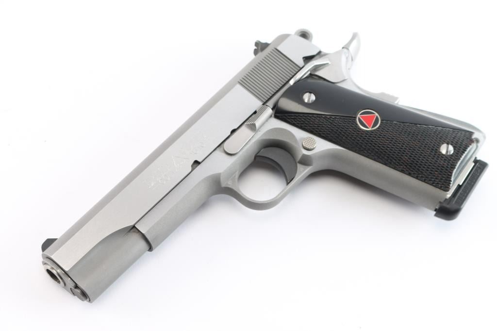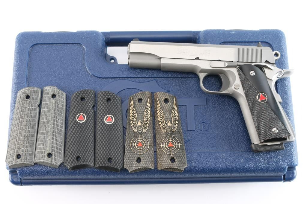 'Pre-Enhanced' Stainless steel 1911-A1 style single action semi-automatic pistol chambered in 10mm Automatic, circa 1988-1992. Features a gray matte finish with polished sides, 5" barrel, dovetailed white dot front, square notch rear sights, smooth trigger, thumb safety, beavertail grip safety with memory bump, serrated round hammer spur, push button magazine release, Wilson combat 8 round magazine, serrated arched mainspring housing and two-piece checkered/smooth grips with Delta medallions. Includes a factory hard case with matching label, manual, spare recoil spring, firing pin stop and three additional grip sets, checkered black rubber grips with Delta medallion, gray square checkered grips and and a very nice set of hard maple grips with American eagle and Delta motifs . Pistols finish is very good with some minor scratches, action is strong, bore is pristine and grips are fine.