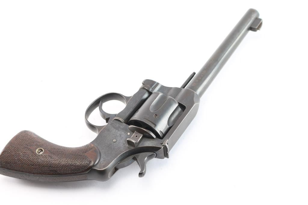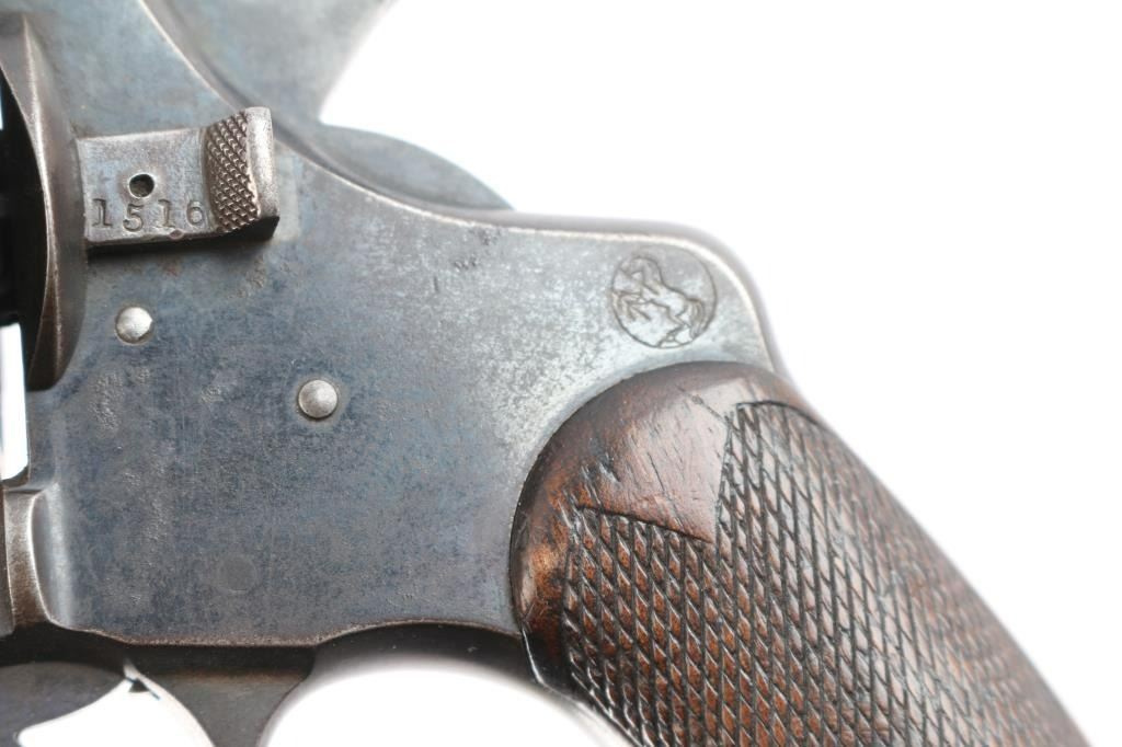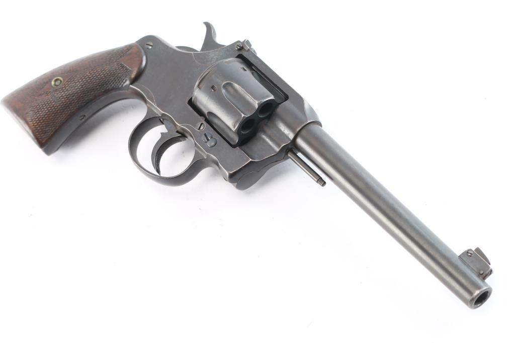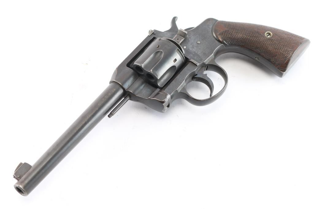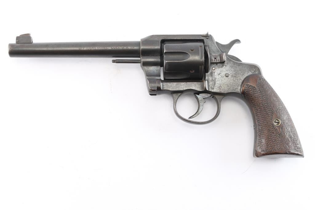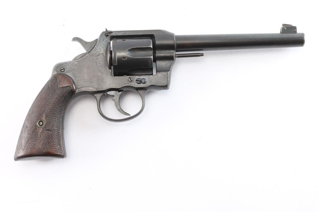 Vintage Colt double action revolver chambered in .38 Special manufactured in 1905 in Hartford, CT. It features a blued refinish, 6" barrel, pinned blade front sight with elevation adjustment, flat top frame, low-profile drift-adjustable rear sight, fluted six-shot cylinder, non-shrouded ejector rod (missing ejector rod head), checkered curved trigger, checkered hammer spur & backstrap. Checkered diamond two-piece wood grips. Stamped "1516" on the crane, yolk, & cylinder release latch. Revolver exhibits approximately 90% of its blued refinish showing edge wear, the bluing is starting to turn brown, and there is a small amount of scattered pin prick pitting around the frame. The barrel has what looks to be hammering marks by the front sight probably from removing/reinstalling the sight blade. Action is mechanically sound, bore is sound with strong rifling, and wood grips are good and fit nicely to the frame.