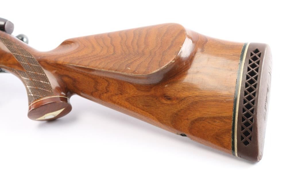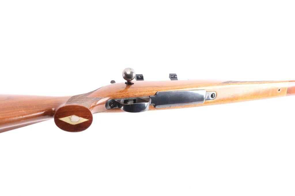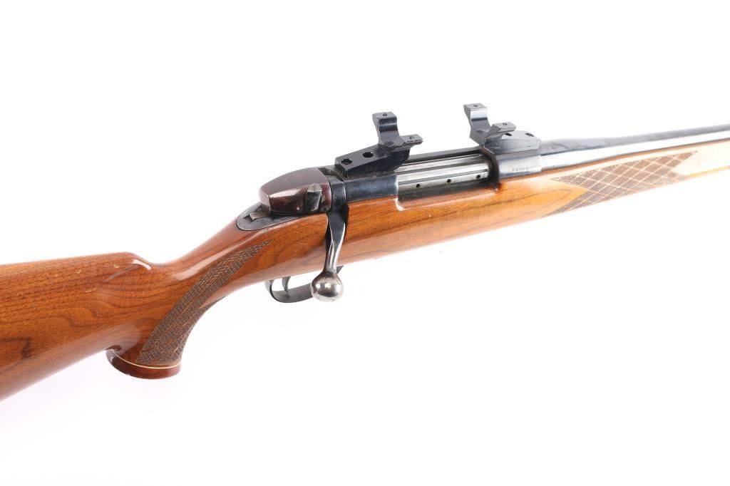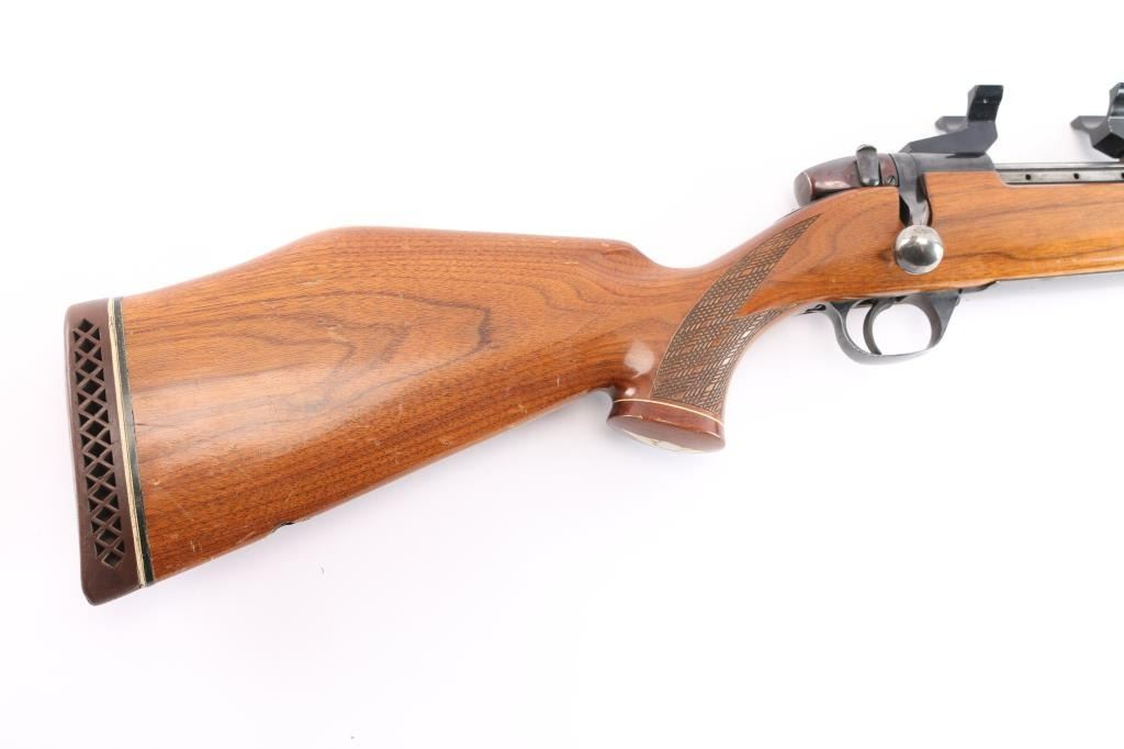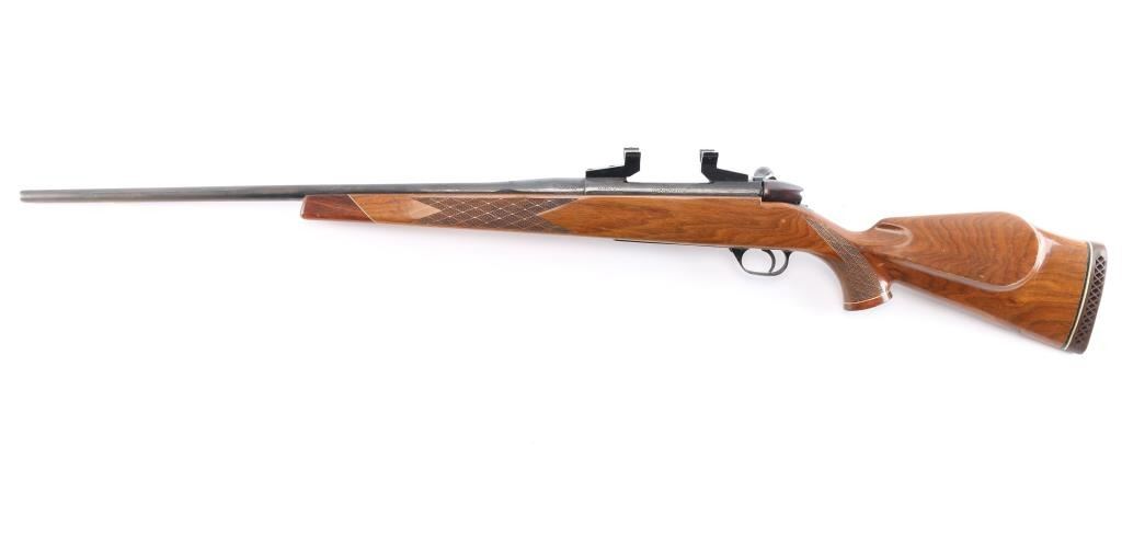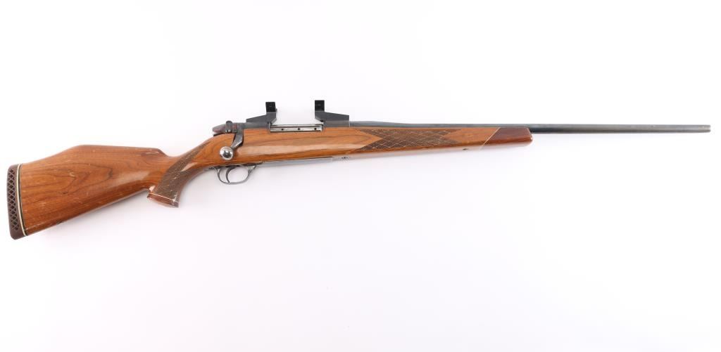 High quality bolt action rifle manufactured by J.P Sauer, West Germany in 1964. Features a blued finish, fancy figured walnut stock, 24" barrel, no provisions for sights, hinged floorplate, 3 lug bolt, manual safety, plum colored bolt shroud. Monte Carlo pattern stock features right handed shadow line cheek piece with tall comb, checkered panels at wrist & forend, contrasting wood forend tip & grip cap, sling stud holes (No studs), ventilated rubber recoil pad. Bore is excellent/bright. Blue has dulled somewhat about 85% finish with signs of use & handling, there are a couple of very minor patches of pitting on the barrel, handling wear on the bolt knob. Wood is overall very good/sound with some minor scratches/dings, there is a chip out of the white diamond insert n the bottom of the grip cap. Two piece scope bases with the bottom rings installed on the receiver.