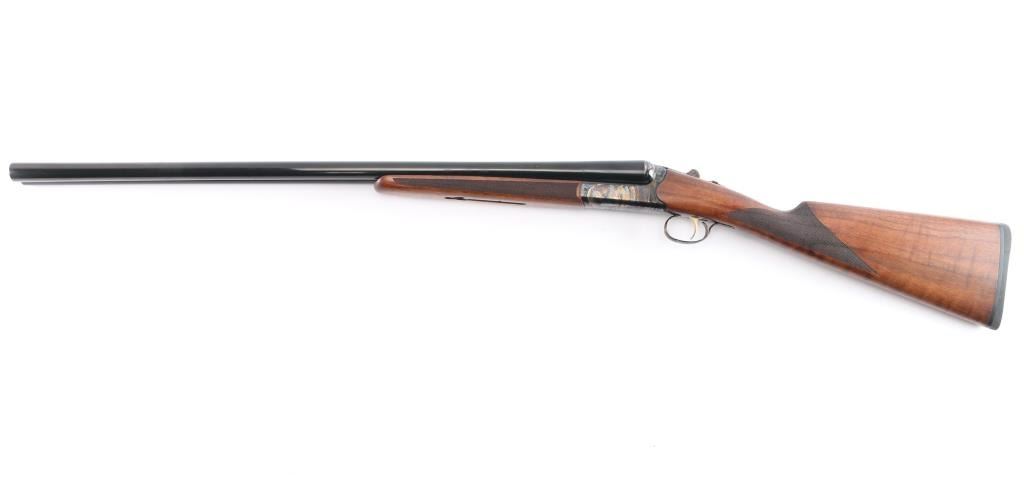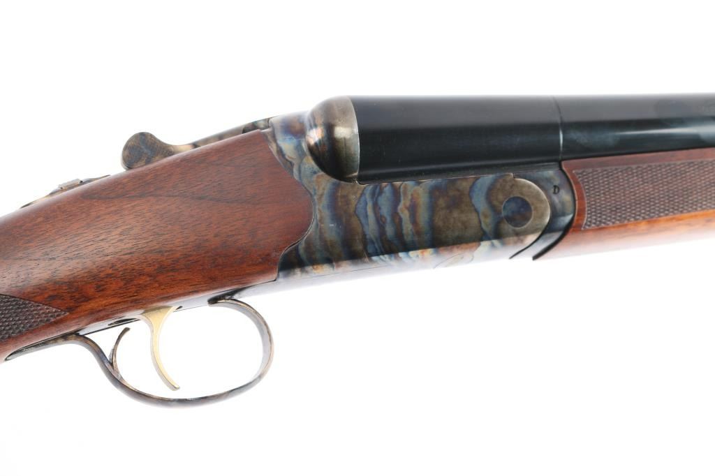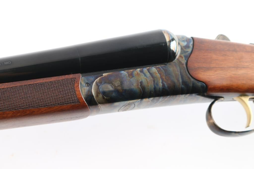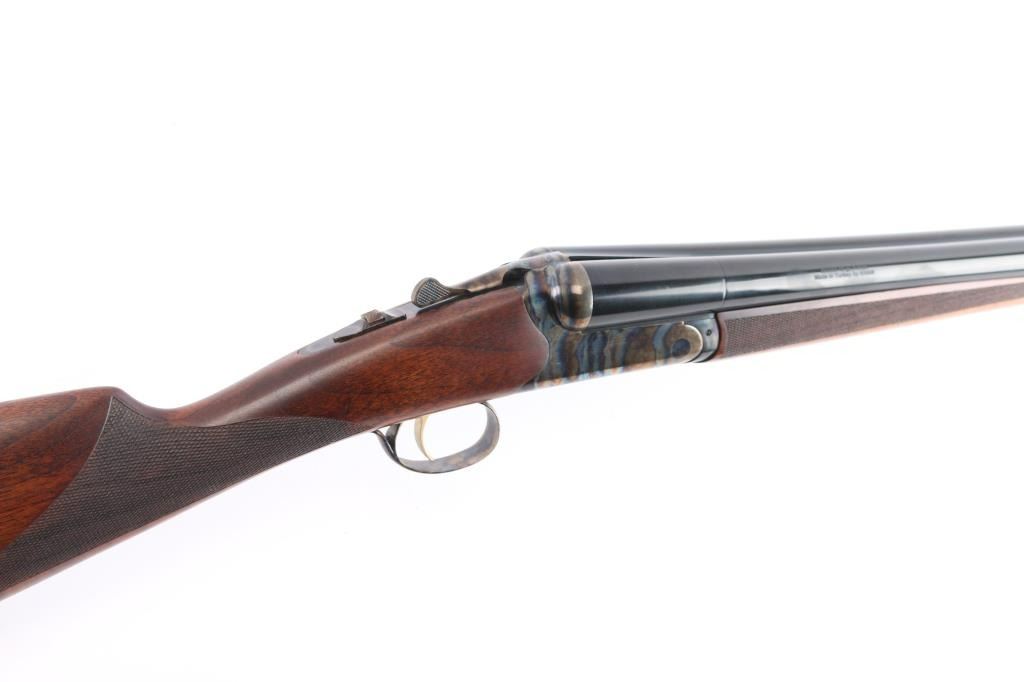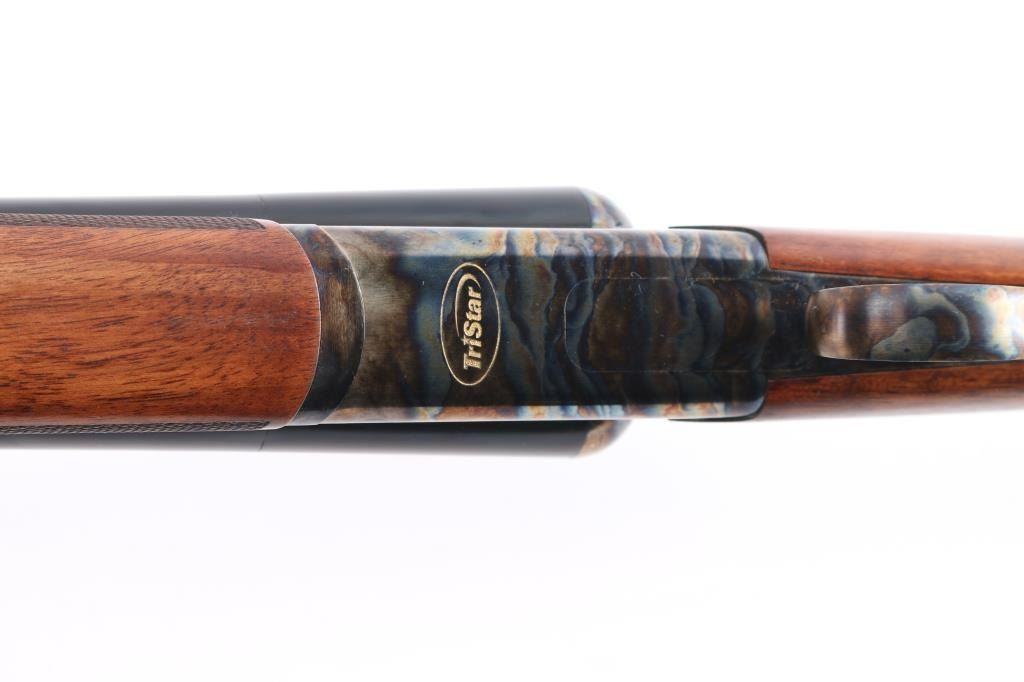 Side-by-side double barrel boxlock 12 Gauge shotgun chambered for 3” shells. Manufactured in Turkey by Khan and imported by TriStar, NKC MO. Features a blued finish with case hardened receiver, top lever and trigger guard, 28” barrels with concave sighting rib with a red fiber optic front sight, accepts choke tubes both marked "PB-SK-SP" (Skeet/Cylinder) installed, case hardened receiver with gold colored accent "TriStar" emblem, smooth curved single trigger with gold color accent, selective ejectors, sliding tang safety with barrel selector, case hardened knurled top lever, point checkered walnut forend with case hardened parts and semi-pistol grip shoulder stock with checkering at wrist, thin rubber butt pad. Stock measurements: drop at comb 1-3/4”, drop at heel 2-1/2” and length of pull 14-3/4". Bores are pristine. Retains 98% finish with one small scratch on top of the back end of the right barrel and minor handling marks. Wood is excellent, fancy figured with fiddle grain. Forend hanger & barrels numbered to receiver. Condition is NRA Excellent. *** Modern Firearm ***