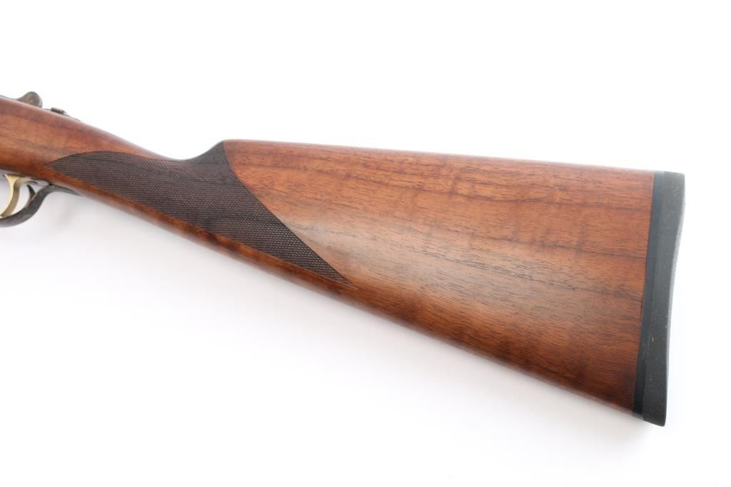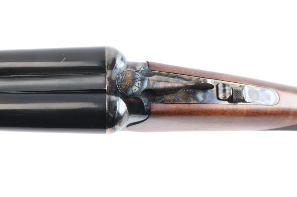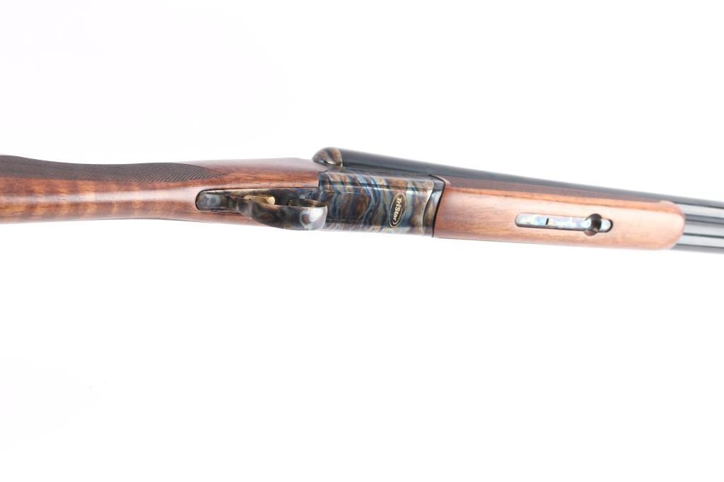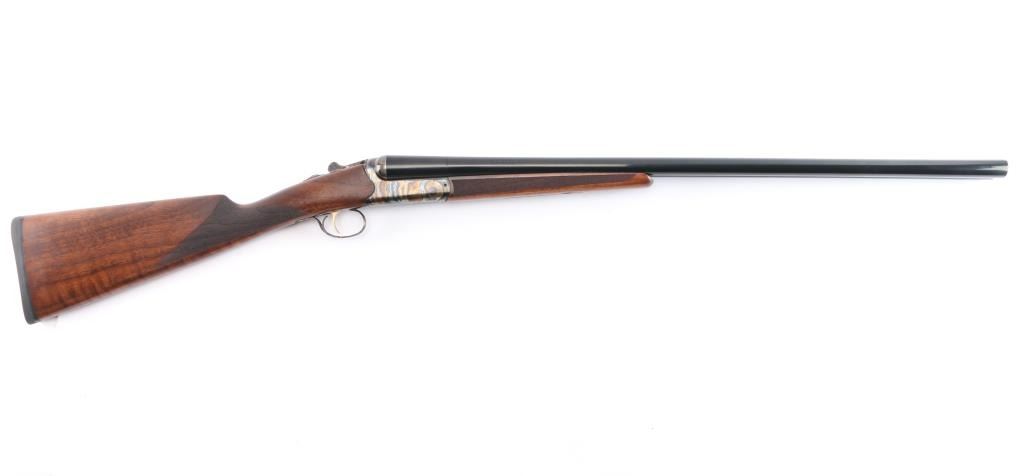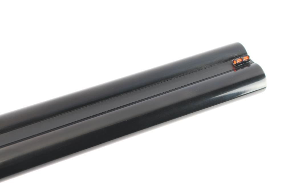Side-by-side double barrel boxlock 12 Gauge shotgun chambered for 3” shells. Manufactured in Turkey by Khan and imported by TriStar, NKC MO. Features a blued finish with case hardened receiver, top lever and trigger guard, 28” barrels with concave sighting rib with a red fiber optic front sight, accepts choke tubes both marked "PB-SK-SP" (Skeet/Cylinder) installed, case hardened receiver with gold colored accent "TriStar" emblem, smooth curved single trigger with gold color accent, selective ejectors, sliding tang safety with barrel selector, case hardened knurled top lever, point checkered walnut forend with case hardened parts and semi-pistol grip shoulder stock with checkering at wrist, thin rubber butt pad. Stock measurements: drop at comb 1-3/4”, drop at heel 2-1/2” and length of pull 14-3/4". Bores are pristine. Retains 98% finish with one small scratch on top of the back end of the right barrel and minor handling marks. Wood is excellent, fancy figured with fiddle grain. Forend hanger & barrels numbered to receiver. Condition is NRA Excellent. *** Modern Firearm ***