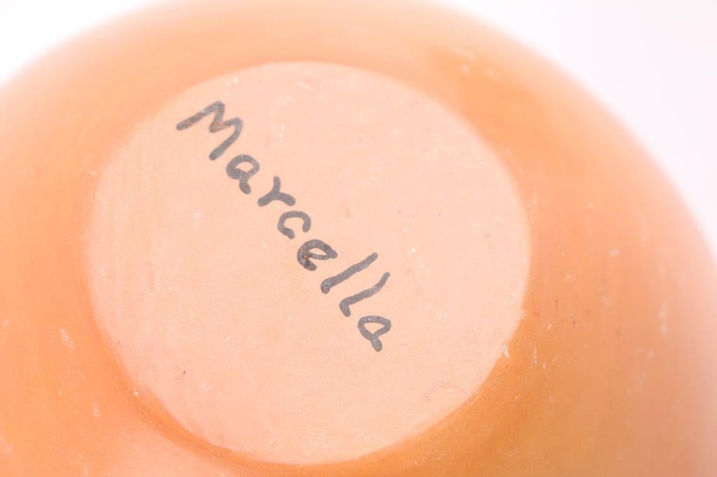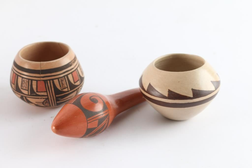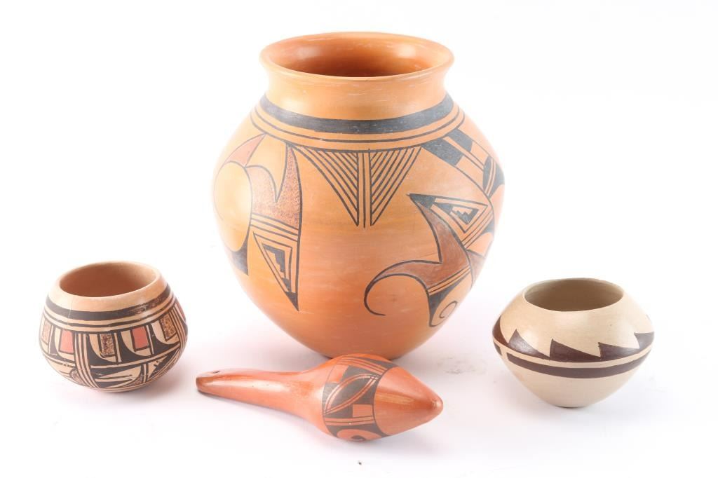 Includes pot signed Marcella (Kahe, First Mesa) on bottom, in excellent condition, measuring 7" tall by 6" wide; a Hopi clay rattle in excellent condition measuring 6" long by 2" at widest; a small Hopi pot, signed on bottom, measuring 2 1/4" tall by 3 1/4" wide; and a small pot signed Neva Reyna, 1st Mesa, with some surface cracks, measuring 2 1/2" tall by 3" wide.