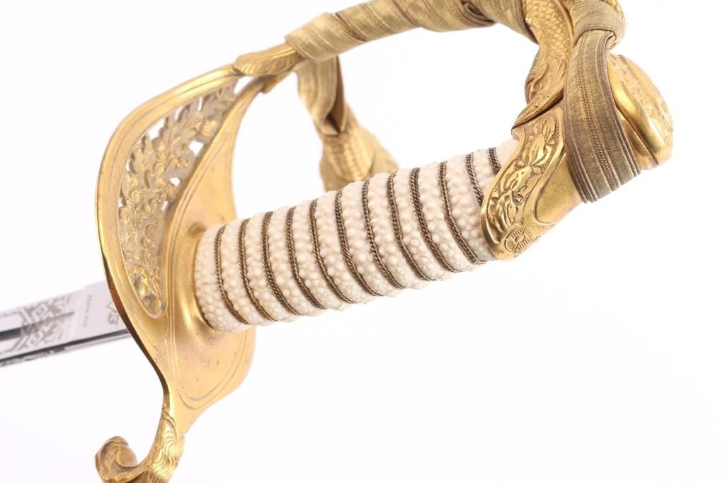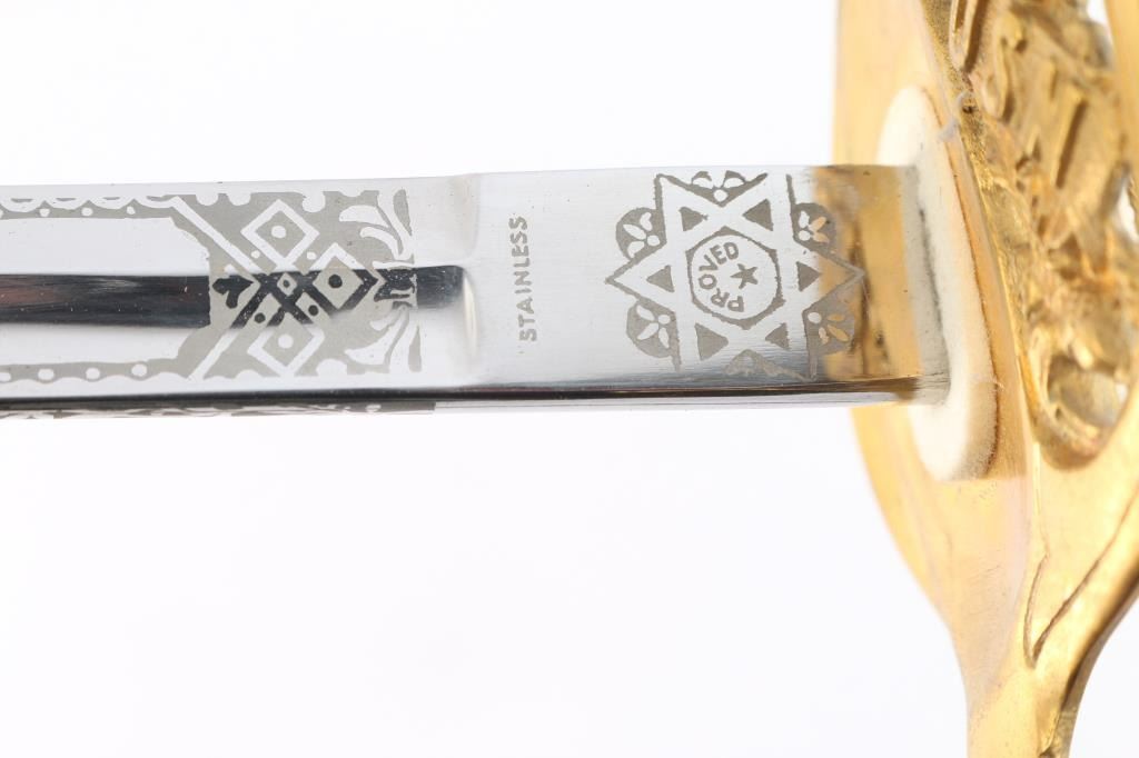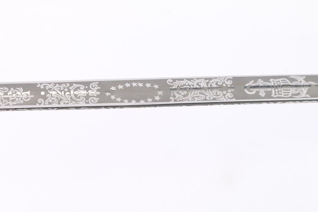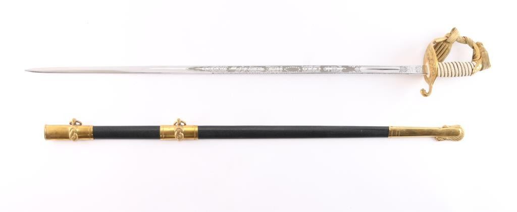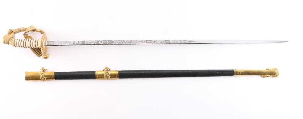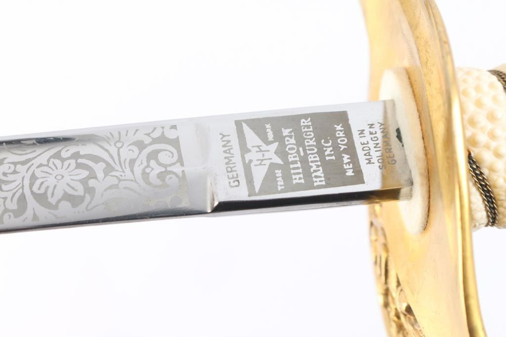 High quality German made, stainless steel, straight, single edged, fullered, triple etched, 31"blade. The acid etched panels provide a beautiful display of anchors, stars, Navy images, a mast, a “USN” marked flag, an eagle, rope and a bannered “USN”. The spine displays laurel leaf and berry motif. The riccaso is marked: “Germany”, above the H-H Eagle Trademark, “Hilborn - Hamburger Inc. New York” and above “Made in Germany Solingen”. The white felt buffer pad remains intact. The scabbard body is made out of a non-magnetic base that has been covered in a textured blackened tanned leather. It features dual decorative lines running lengthways to the front and back. There are three gilded brass fittings which feature; a drag with a decorative sea creature to the base, a mid-band which has a knotted rope design, holding a ring, bordered in a zig-zag line pattern and a top-fitting with a knotted rope design holding a ring and a zig-zag lined edge. They are each secured with two side screw. The integral throat is marked: “Germany”. The multi-piece cast brass gilded partial basket hilt features a decorative design of oak leaf and acorns and a bannered “USN”. The basket and handguard are one piece and the pommel cap and oval pommel top are separate pieces. The pommel top features an American eagle perched on a wrapped-up rope surrounded by stars. The grip is white faux ray skin, that is wrapped in a decorative dual twisted brass wire wrap. The correct gold bullion portepee is attached. Excellent, like new condition. The H-H company had a New York address 1943-50.