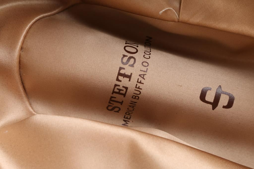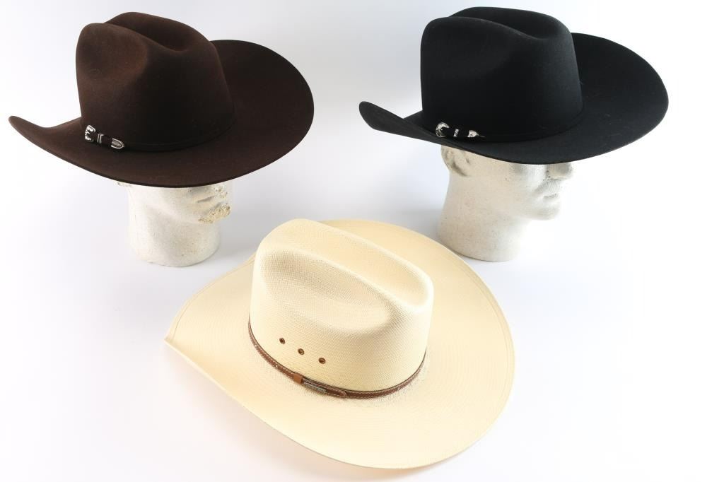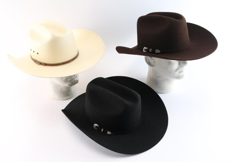 1) Stetson, straw, natural color, with brown hatband (some discoloration around parts of band), size 59, 7 3/8. 2) Stetson Chocolate felt/fur, size 7 3/8. 3) Stetson black felt/fur, from the Buffalo collection, size 60, 7 1/2.