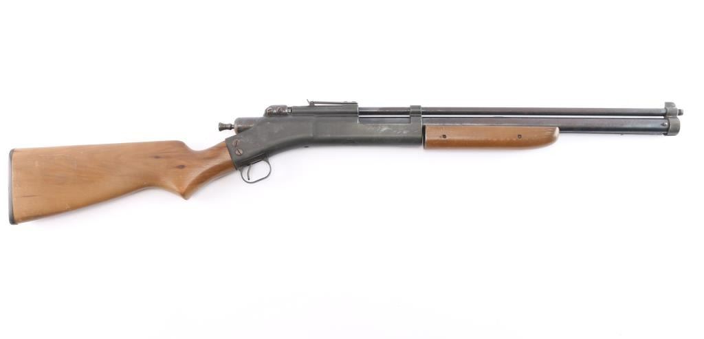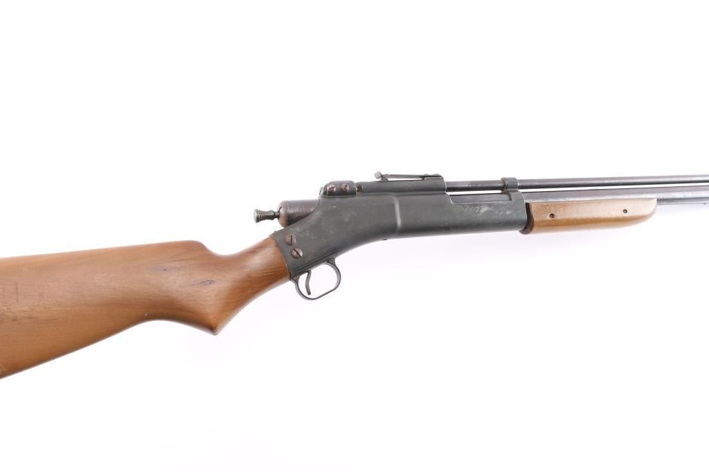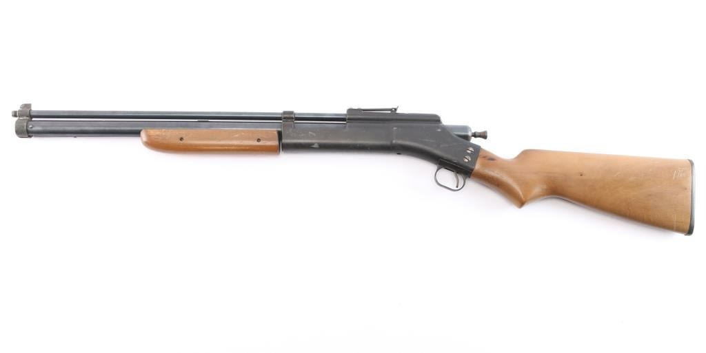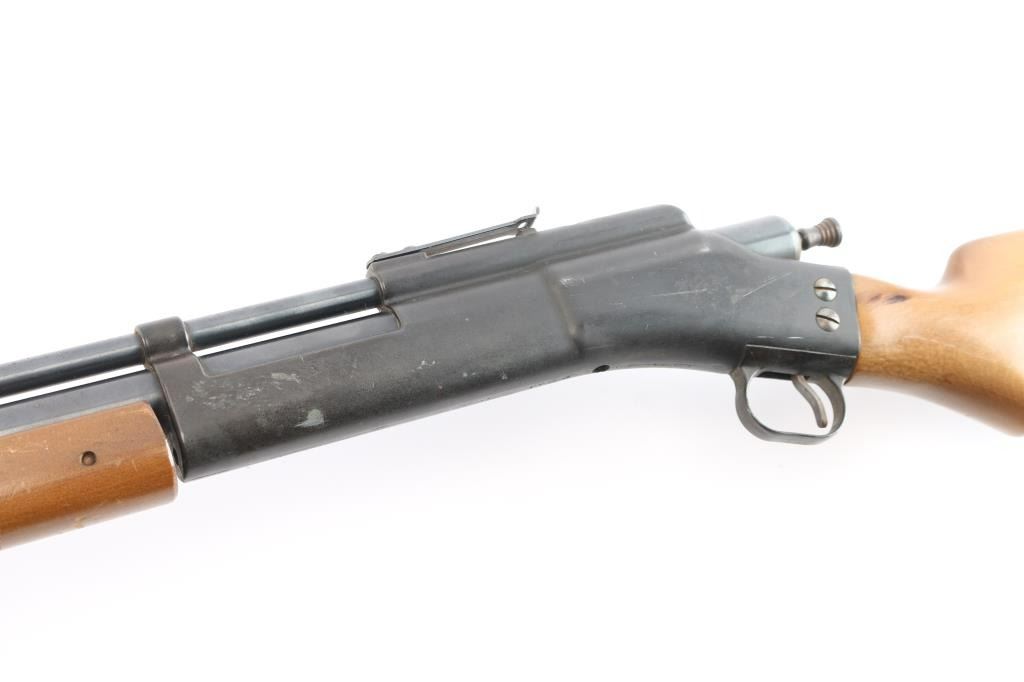 Air rifle made in the late 1940's. Dual-Caliber Status: The "Fireball" was unique for being able to shoot .25 caliber lead balls (#4 buckshot) and featuring a removable brass insert for .177 caliber pellets, installed. Blade front sight, wood stock and forearm. rust on finish. *Missing bolt handle*.
