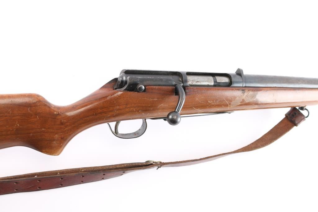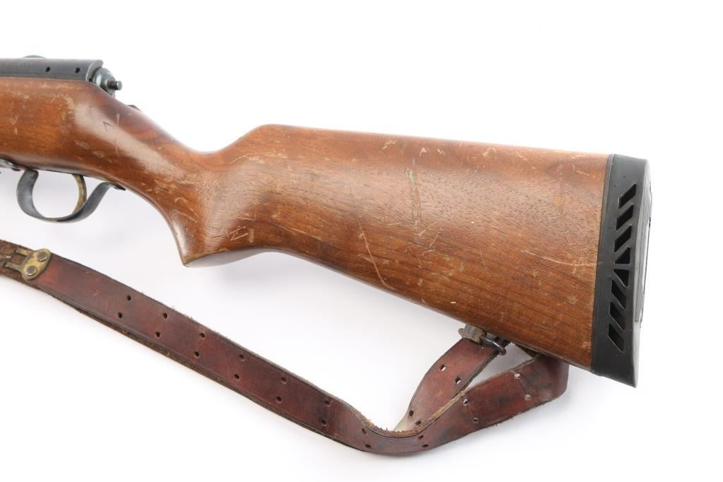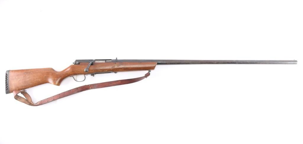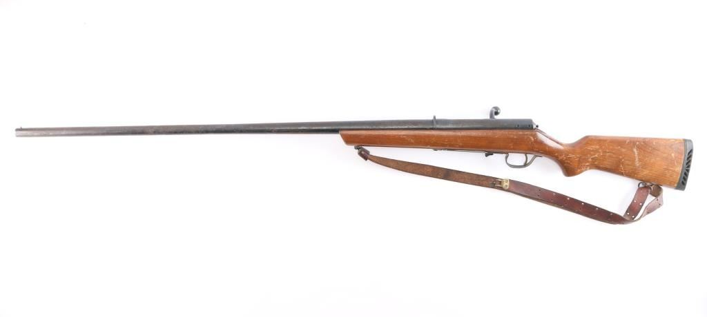 "The Original Marlin Goose Gun" (Model 55) Bolt action shotgun features 36" Cyl choke barrel, brass bead front sight, notch rear sight, manual safety, wood stock, ventilated rubber recoil pad, sling swivels. left receiver drilled/tapped. Bore is very good/bright. Dull blue finish is mostly covered in patches of brown patina, light pitting. Wood is overall good with many scratches and scuffs. Missing magazine. Brown leather sling attached.