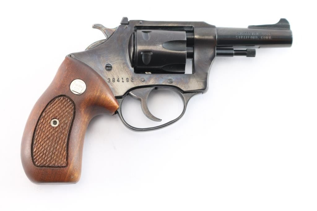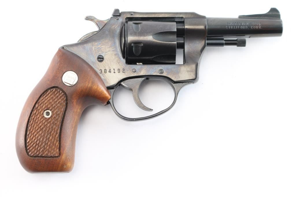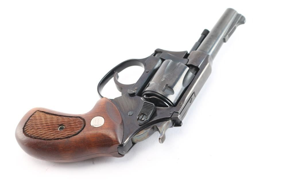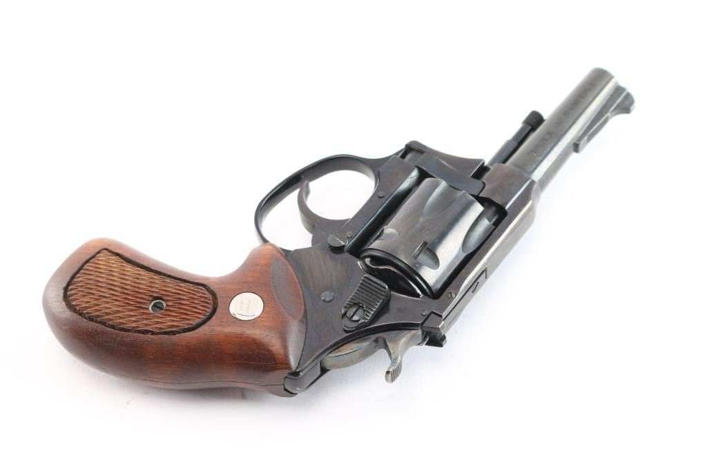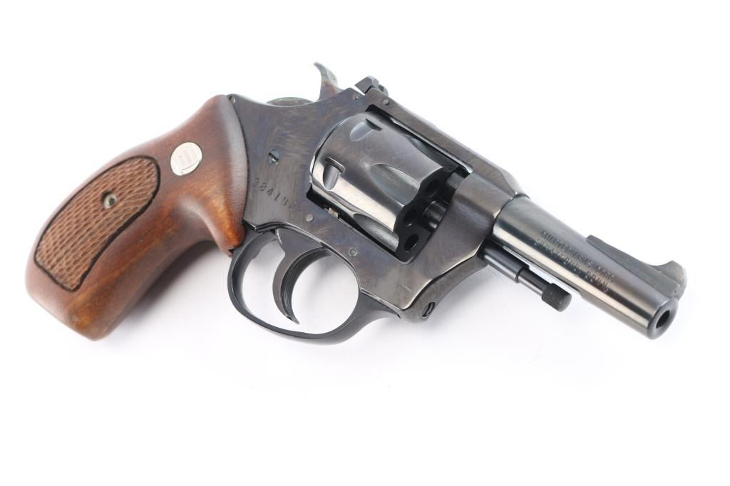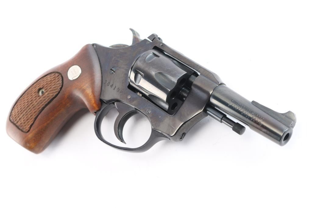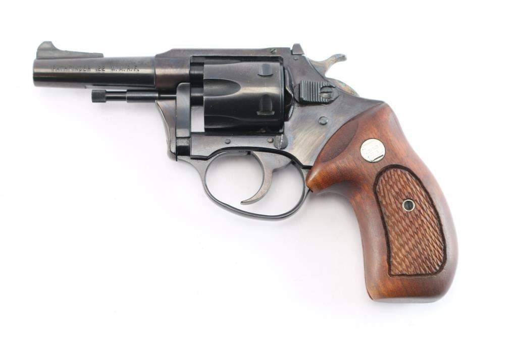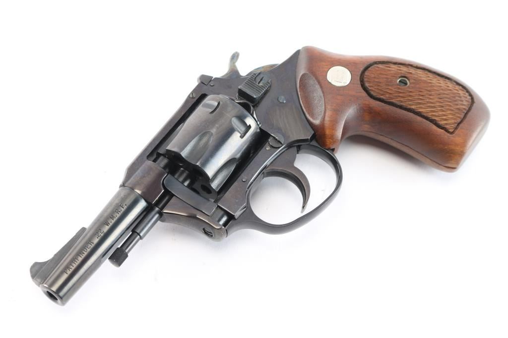 Charter Arms six shot .22 magnum single/double action revolver. It features a blued finish, radiused crown, fluted cylinder, serrated curved trigger, serrated cylinder release, unprotected ejector rod, adjustable rear sight, ramped blade front sight, and 3” barrel. The revolver retains approximately 98% of the blue finish with very light handling marks. The hammer is beautifully case colored with a serrated hammer spur and passive firing pin. The checkered wood medallion grips are in excellent condition. The bore and cylinder are excellent, the action is crisp, and the markings are sharp.