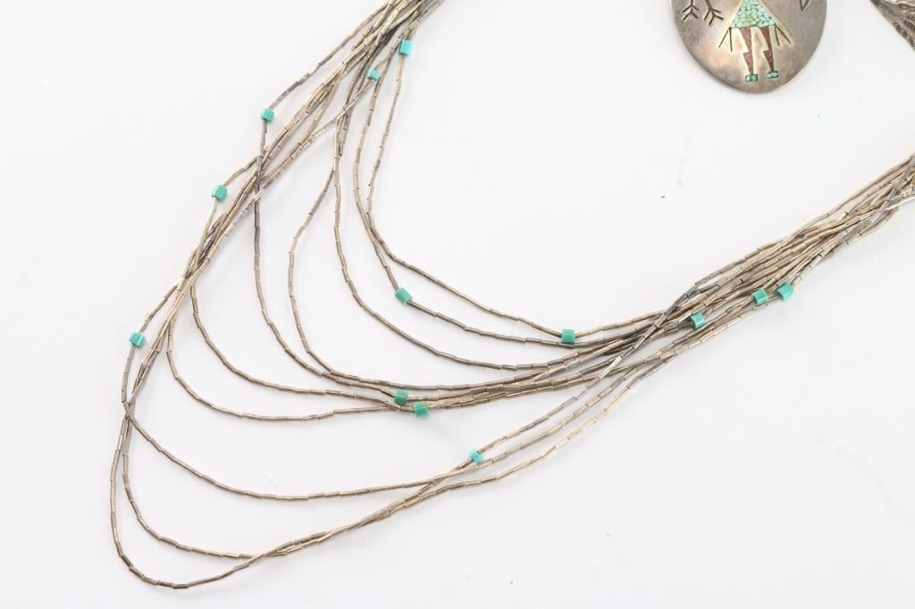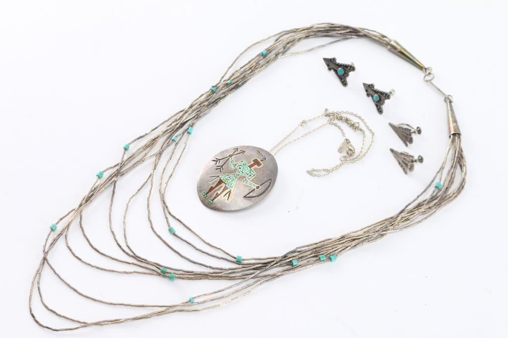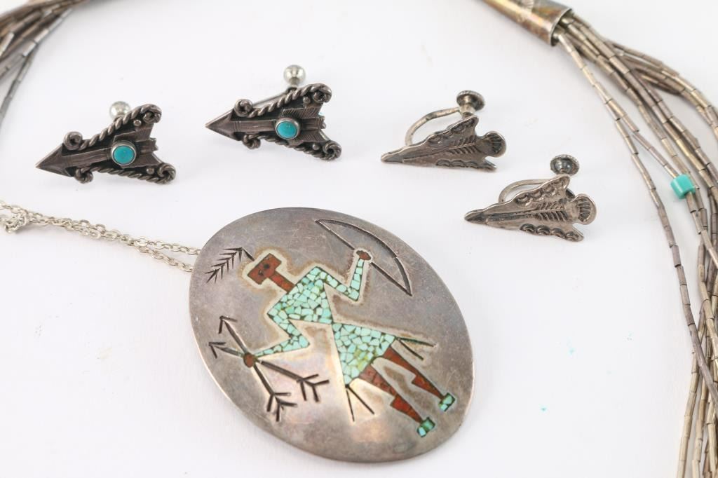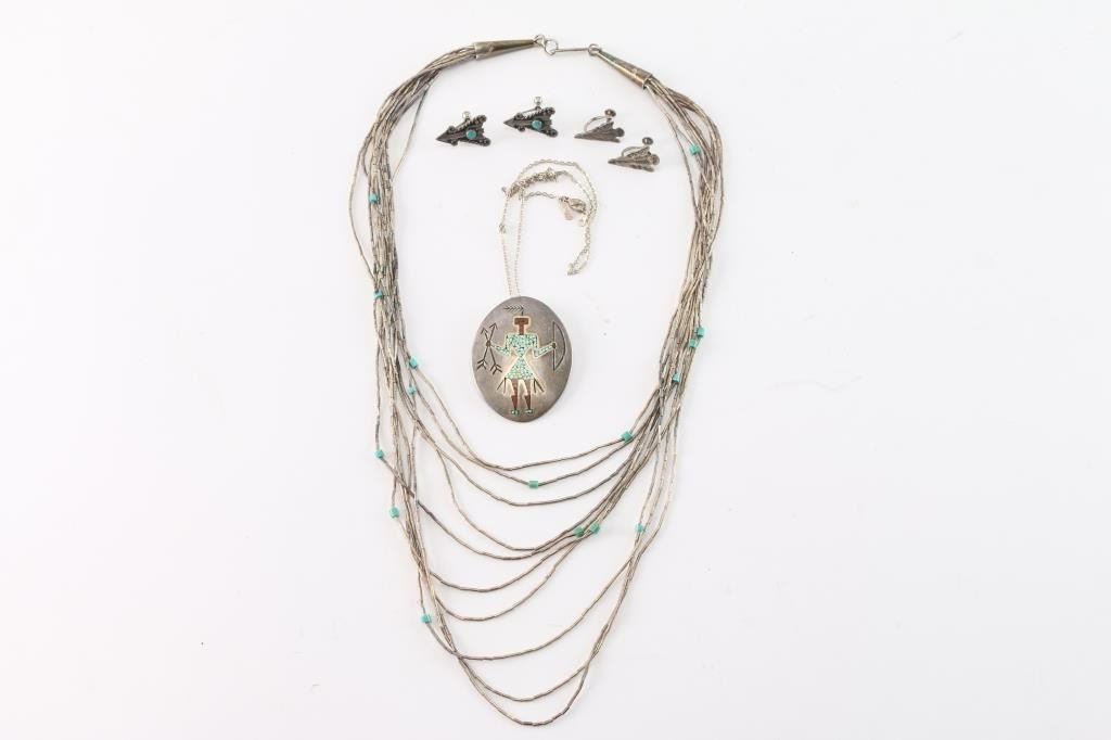 Includes two necklace and two pair of screw back earrings. One necklace is 10 graduated strands of liquid silver and turquoise beads. Measures 13" from drop at longest point. The other necklace is an oval silver (looks sterling but unmarked) pendant with chipped turquoise and coral inlay into etched kachina design, on broken China sterling silver chain (fix would be easy). Measures approximately 11" from drop. Both earrings are arrowhead design, one has a dot of turquoise in each. Both are screw back. and measure just under an inch long.