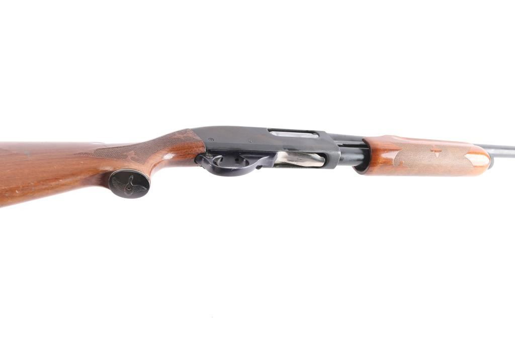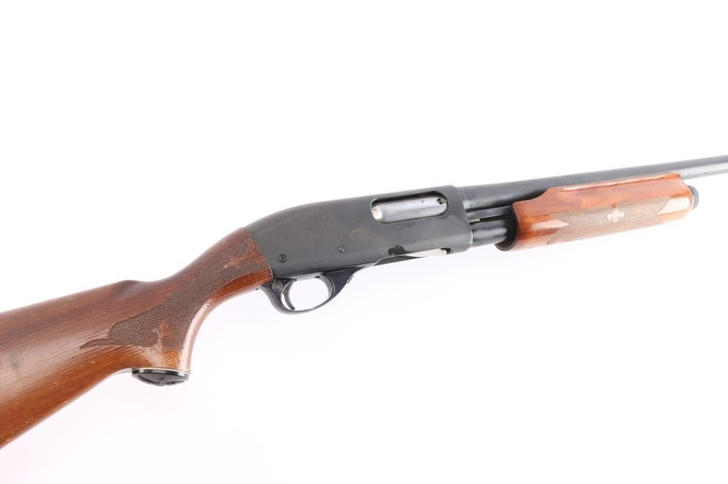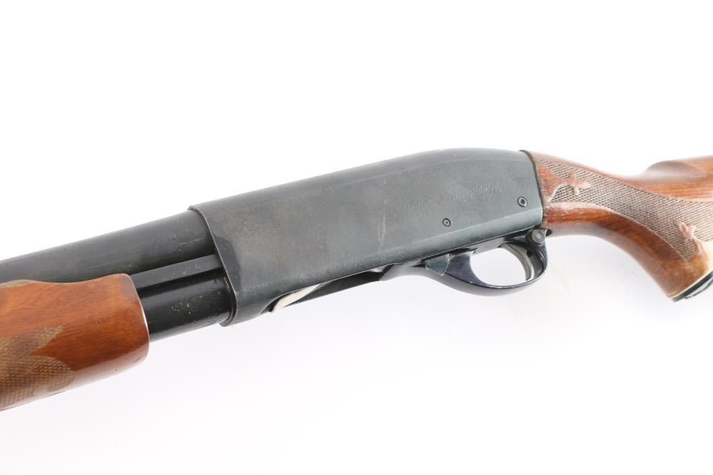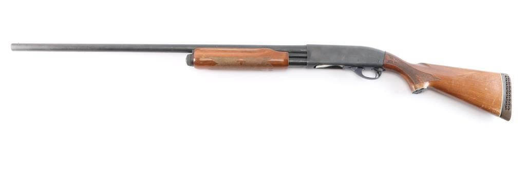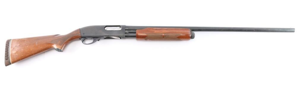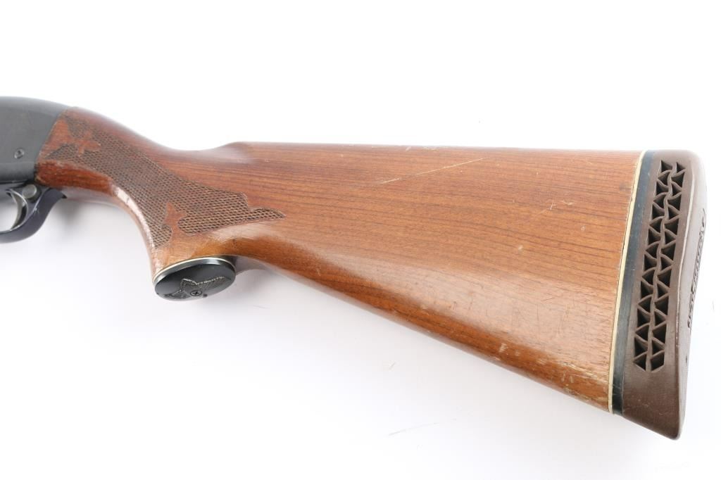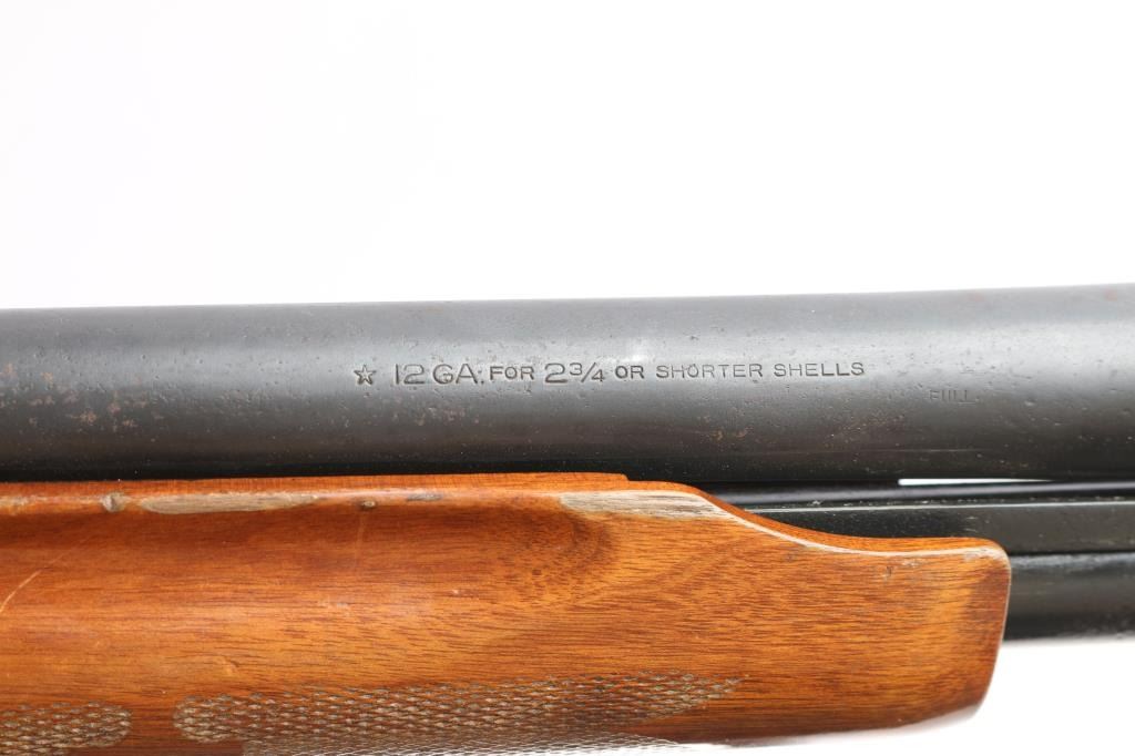 Pump-action 12 Gauge shotgun for 2 3/4" or shorter shotshells. Features a 30" barrel with fixed FULL choke, steel front bead, push button safety, blued refinish, urethane finished wood buttstock & forend w/checkered panels at wrist and forend, factory ventilated rubber recoil pad and grip cap with white spacers. Bore is good/dirty. Retains approx. 80% finish with pitting throughout, a few scratches, edge wear and friction wear on mag tube. Wood is good with dents/scrapes, scratches, and water damage on the buttstock. A few very minor scratches/dents on forend. Condition is NRA Fair. ***Modern Firearm***.