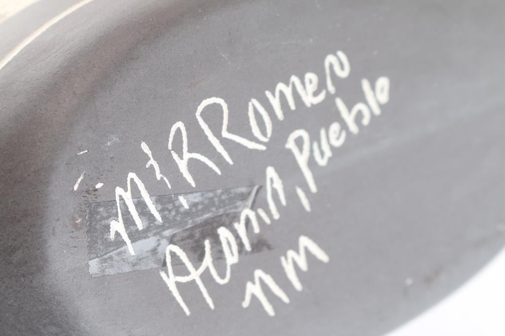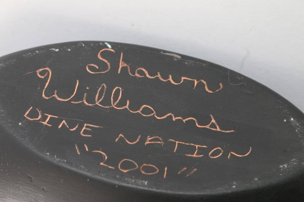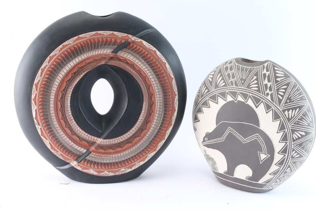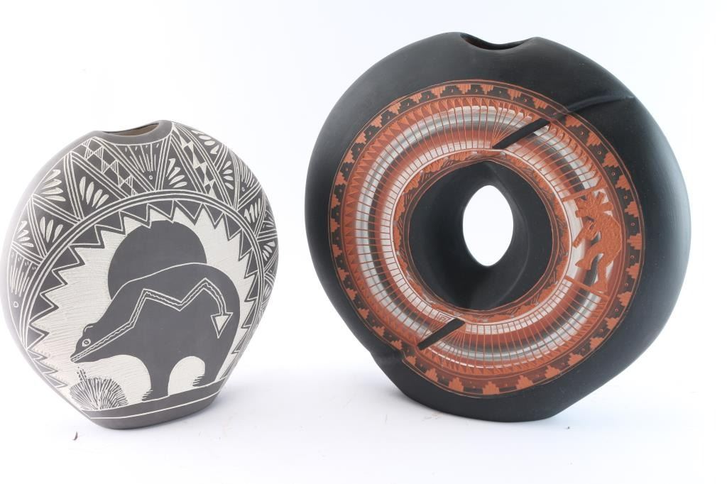(1) Navajo window vase, signed Shawn Williams, Dine Nation, with Kokopelli design, 15" x 14". (1) Acoma incised carved pot with bear design, signed Mnr Romero, 12" x 11"