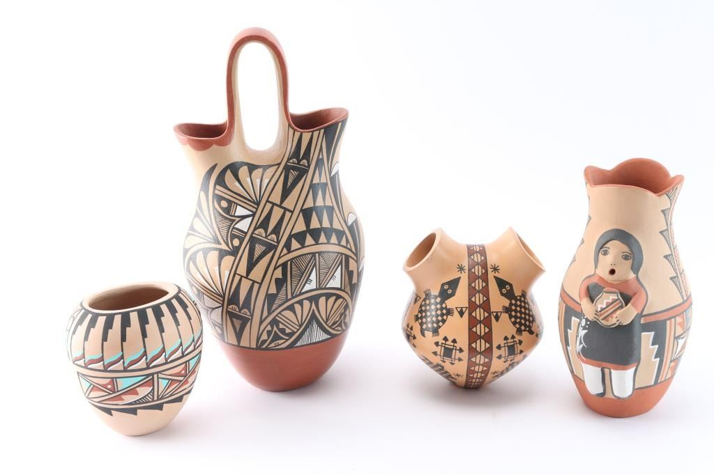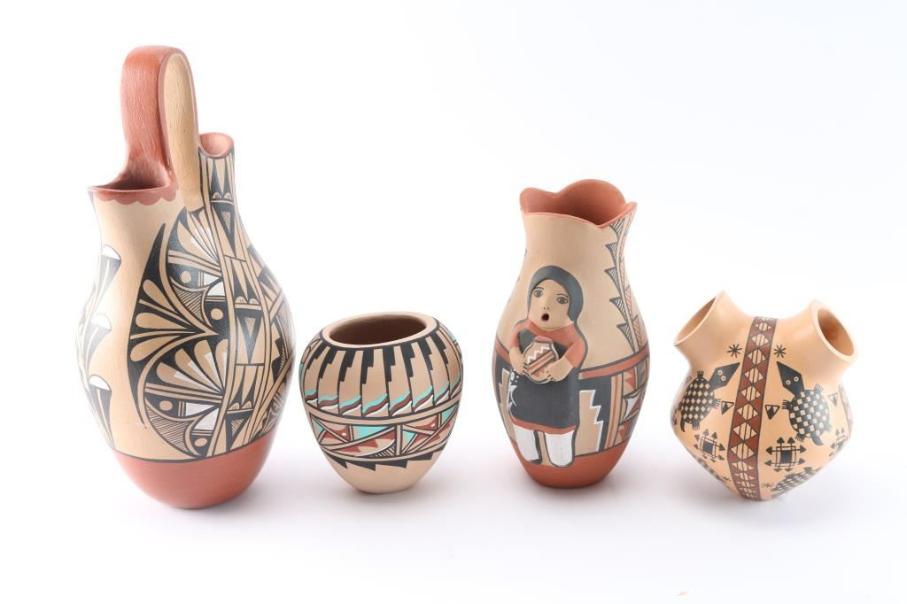 Jemez pot, signed B. Tosa, 12" x 5". Jemez singing woman pot, by Toya, 8" x 5". Jemez pot, by Chinana, 5" x 3-1/2". Turtle pot, by Juanita Ledezma, 5" x 4-1/2"