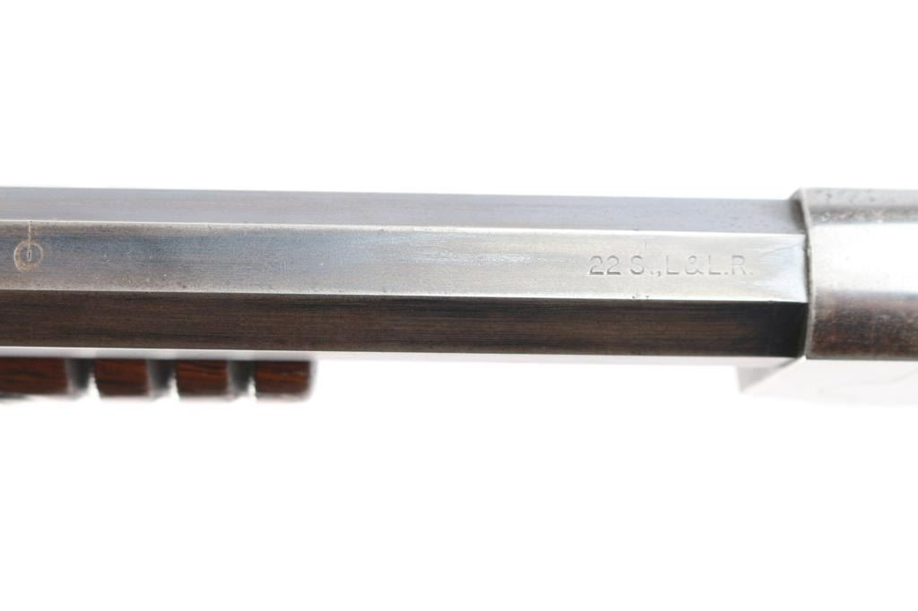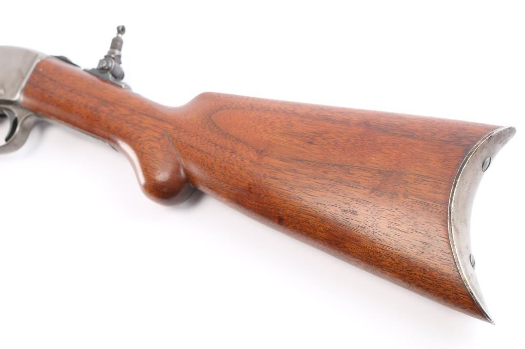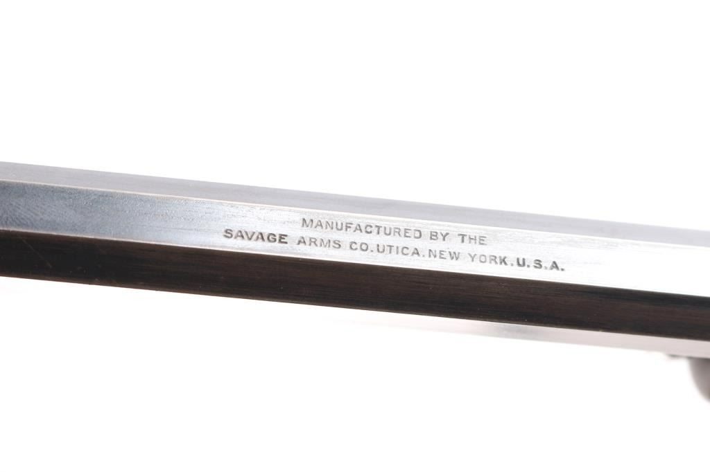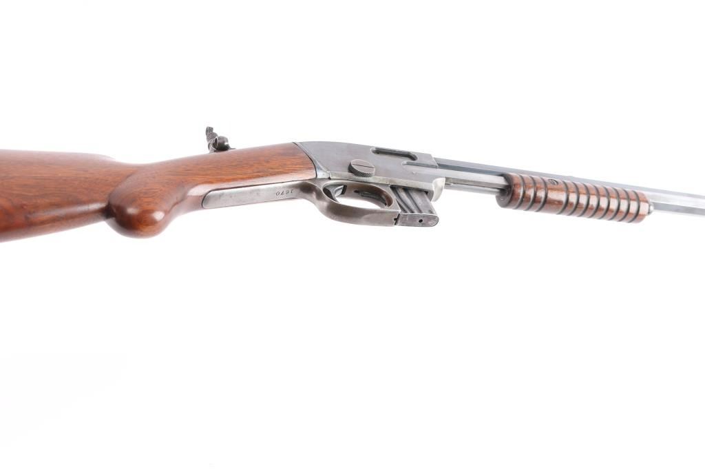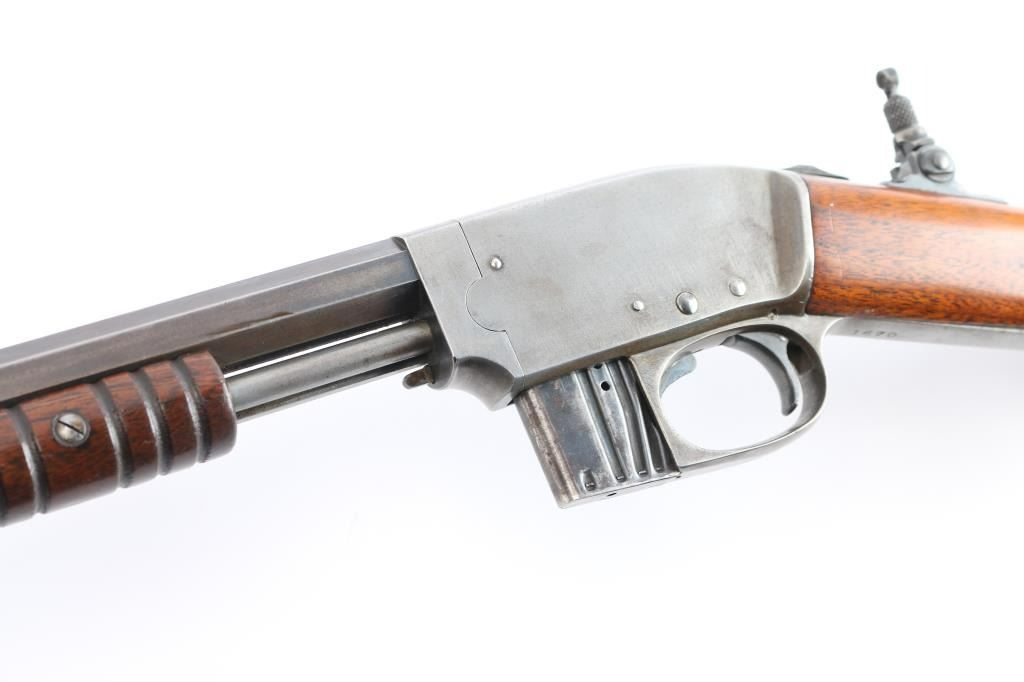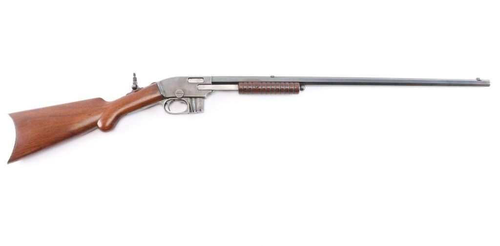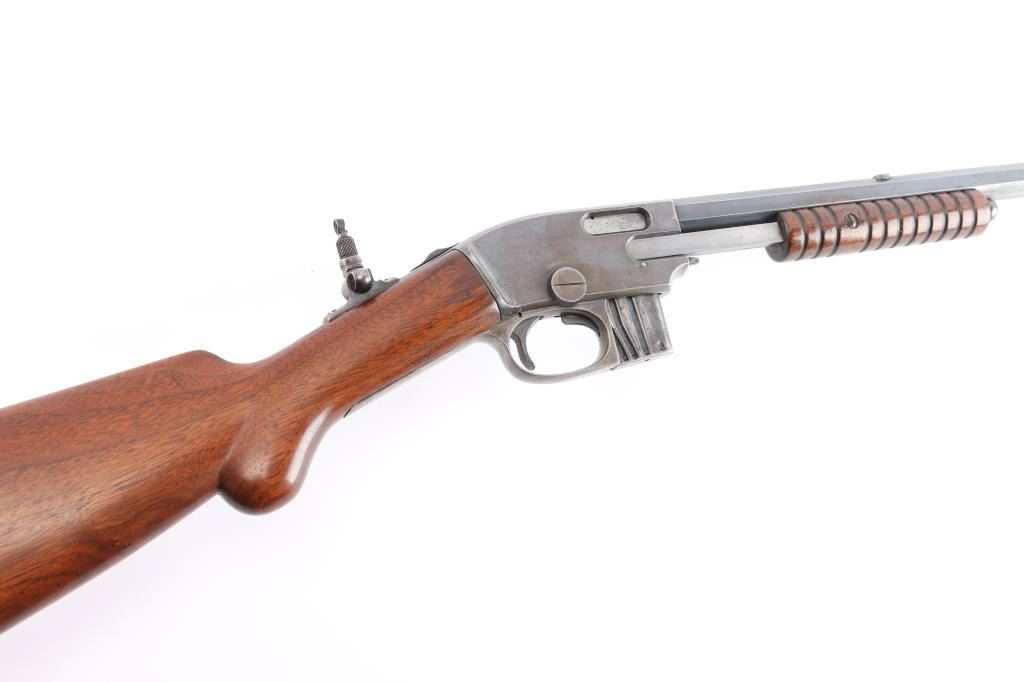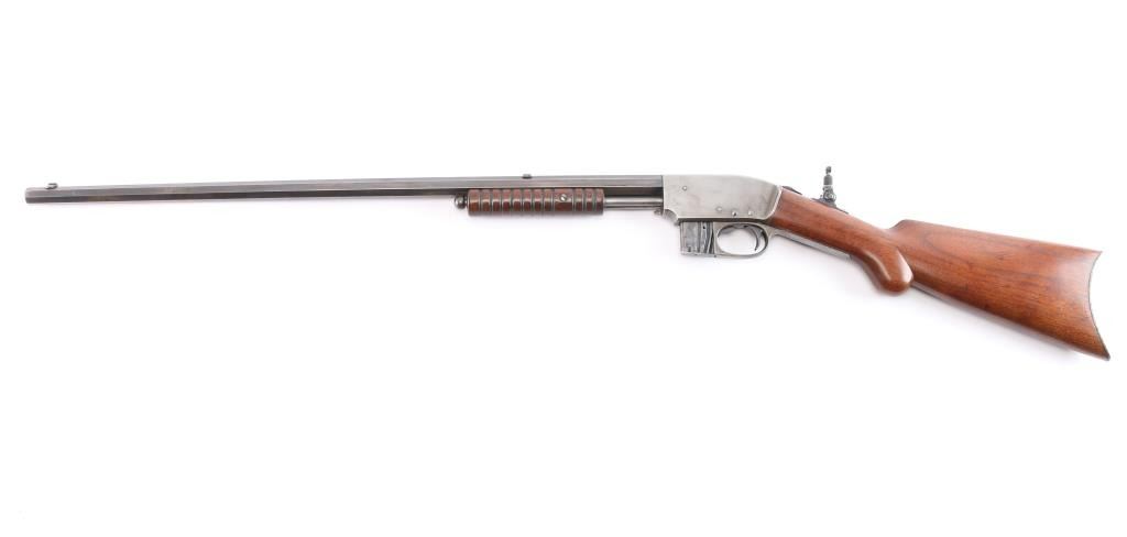 Slide action magazine-fed repeating rifle chambered in .22 caliber, circa 1903-1906. Manufactured by Savage Arms Co. from Utica, NY. It features a fully blued finish, 24" octagonal barrel, post/bead front sight, sporting rear sight, take-down receiver, smooth curved trigger, safety switch on tang, folding tang peep sight, 10 rd savage marked magazine, grooved pump handle, plain rounded pistol grip walnut stock and metal crescent buttplate. Blued finish is about 30% with some rust on the buttplate, and patina on the barrel and receiver. There is minimal edge wear, and handling wear mostly on the receiver. Markings are good, action is smooth, bore is bright with good rifling, and wood is very good.