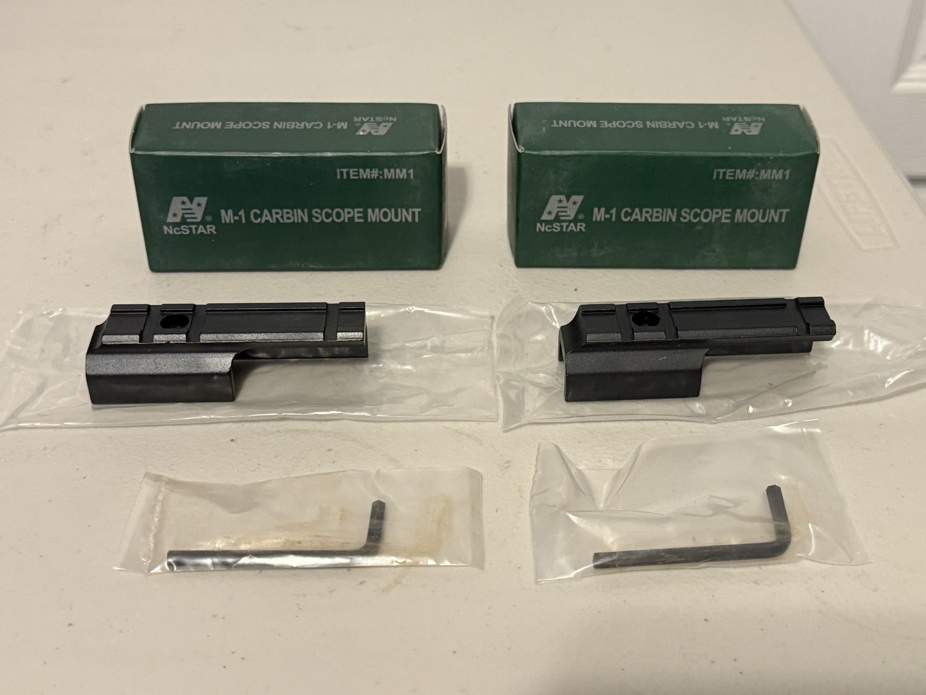 Pair of NcSTAR M1 Carbine scope mounts, model MM1. Includes mounts with original boxes and hardware as shown. Ideal for adding optics to an M1 Carbine. Condition appears good. Sold as one lot.
