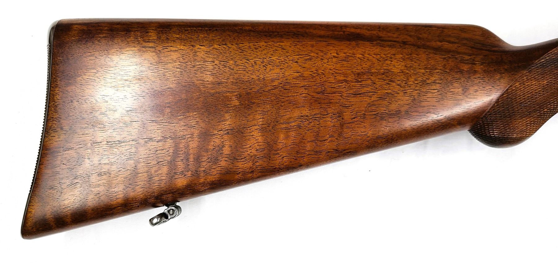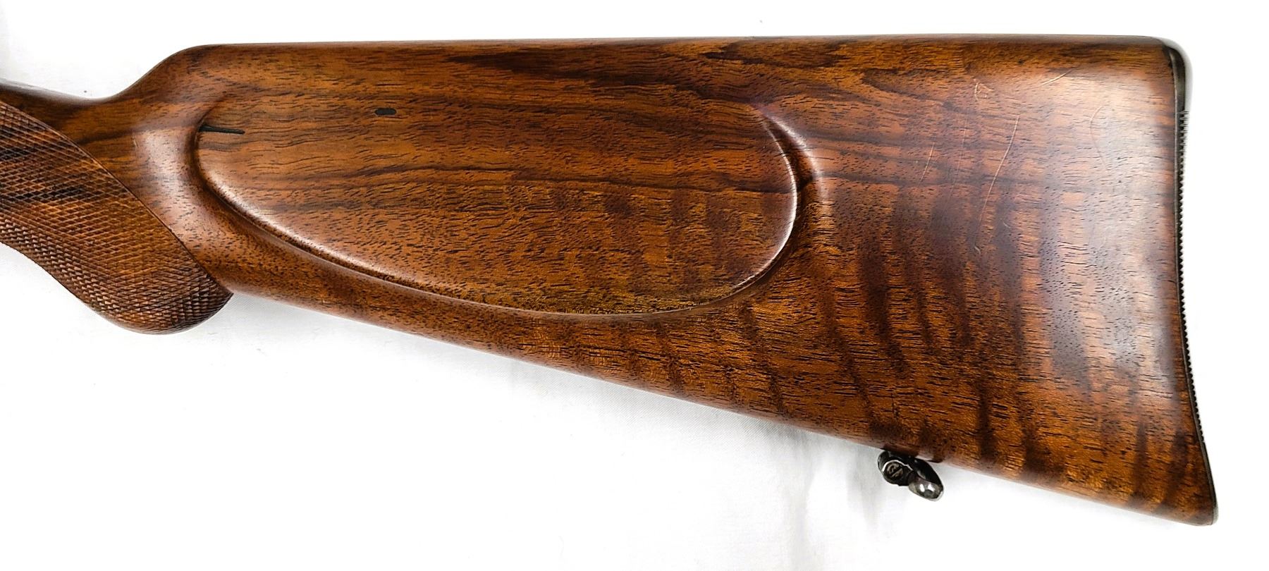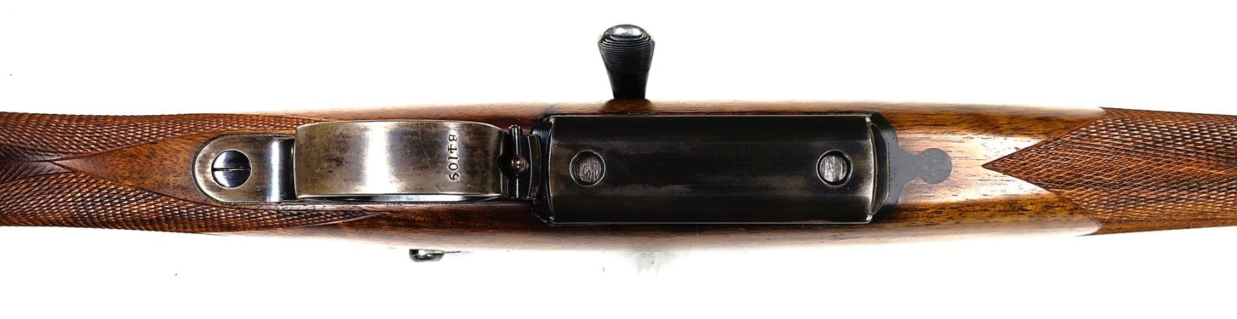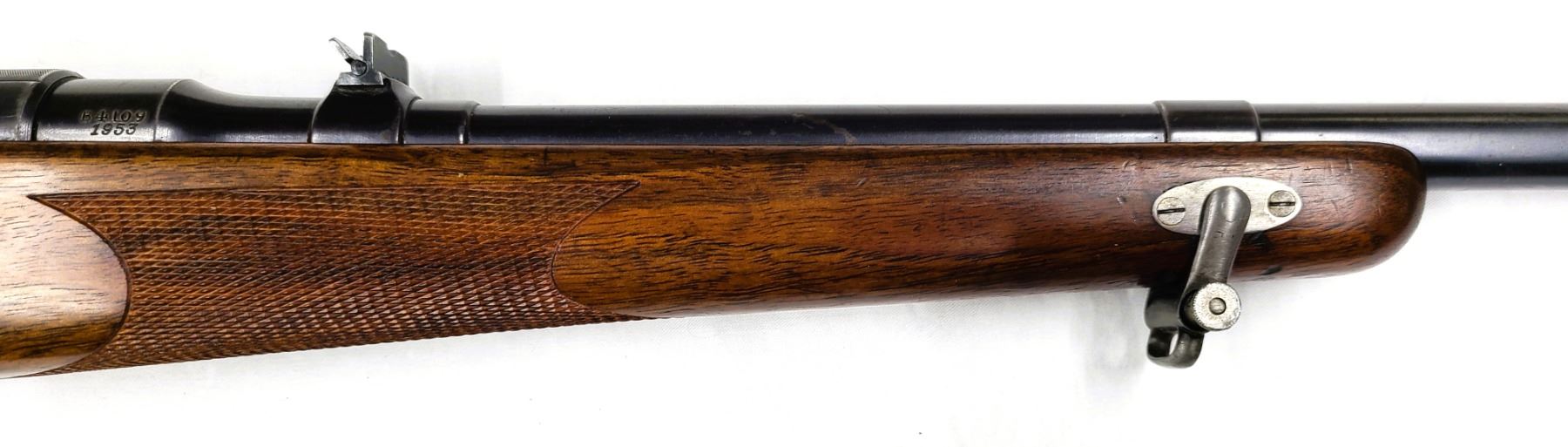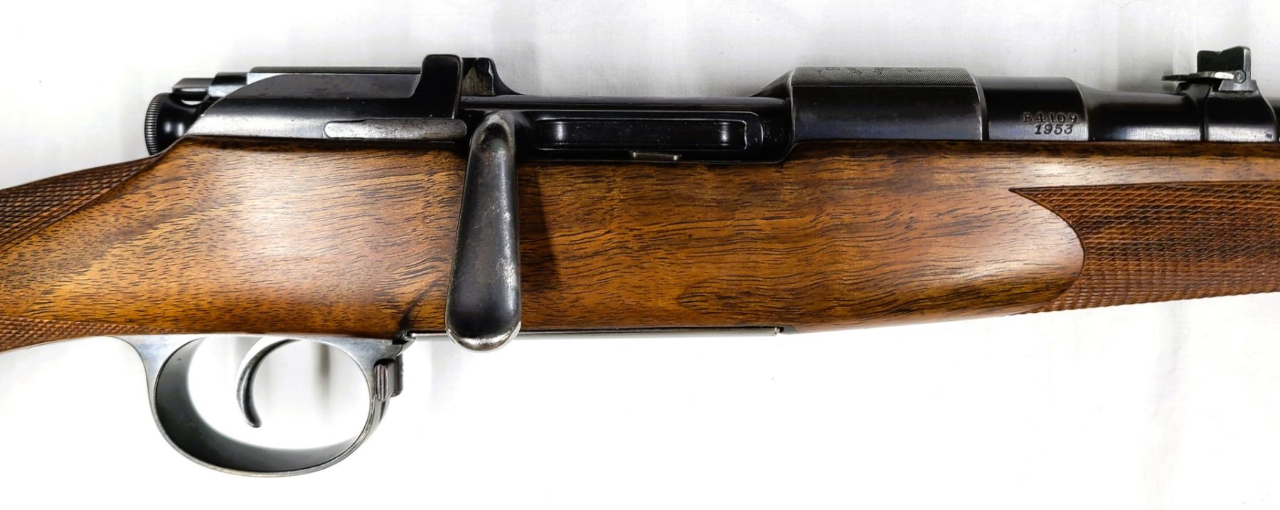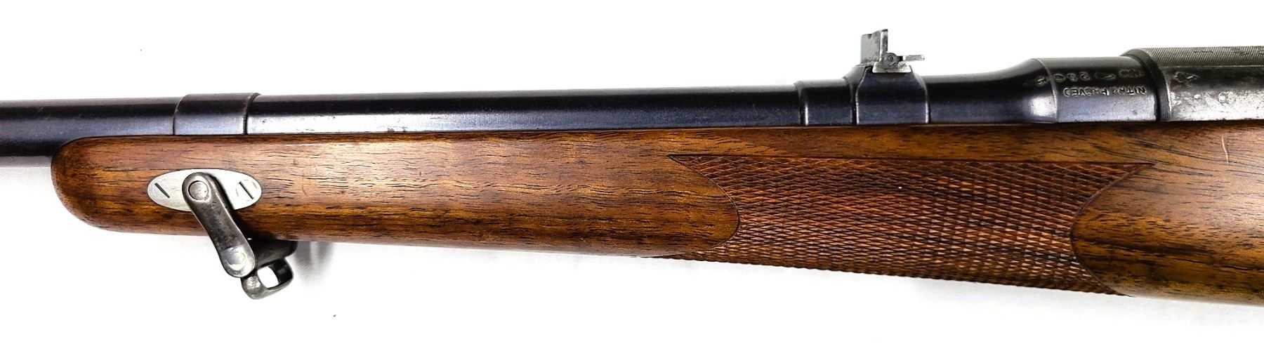 This model is fitted with a 22.5 inch barrel equipped with a two leaf wide V express rear sight regulated on the traditional German front sight. Serial numbers match on Bolt & Receiver.