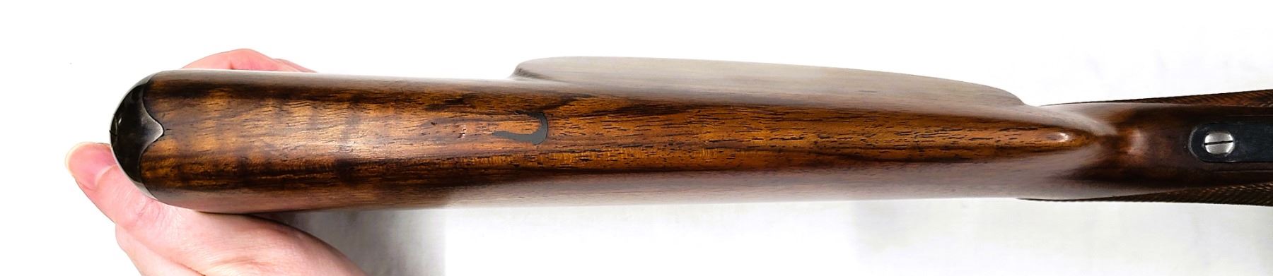The European walnut stock has a shortened forend and a more upright grip, a remarkably well