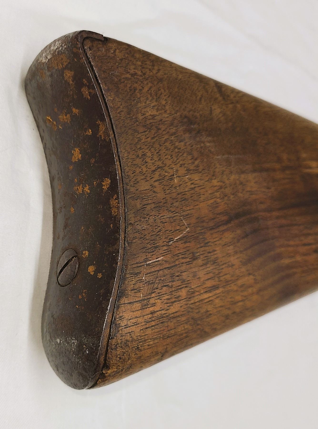 Rear stock is good with tiny crack by tang. Finish is worn and wood is dark.