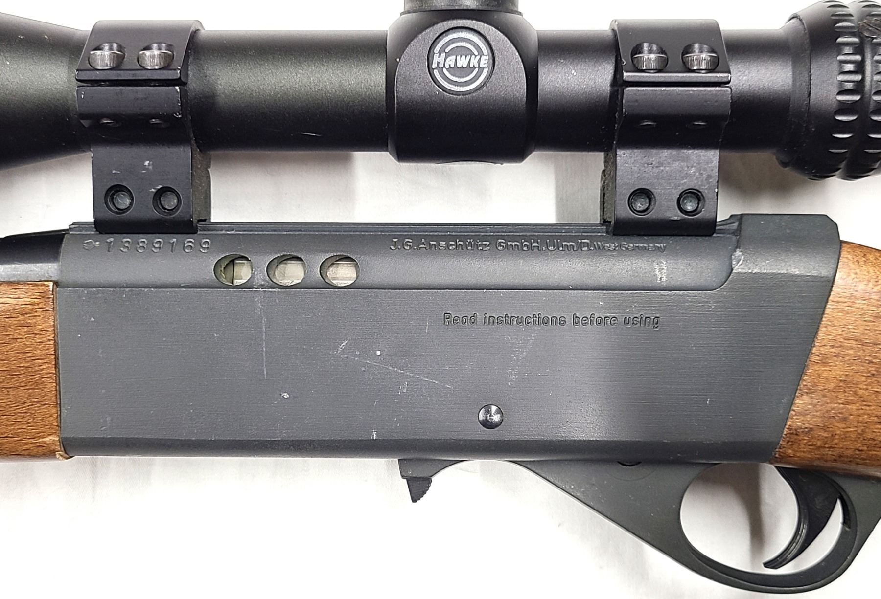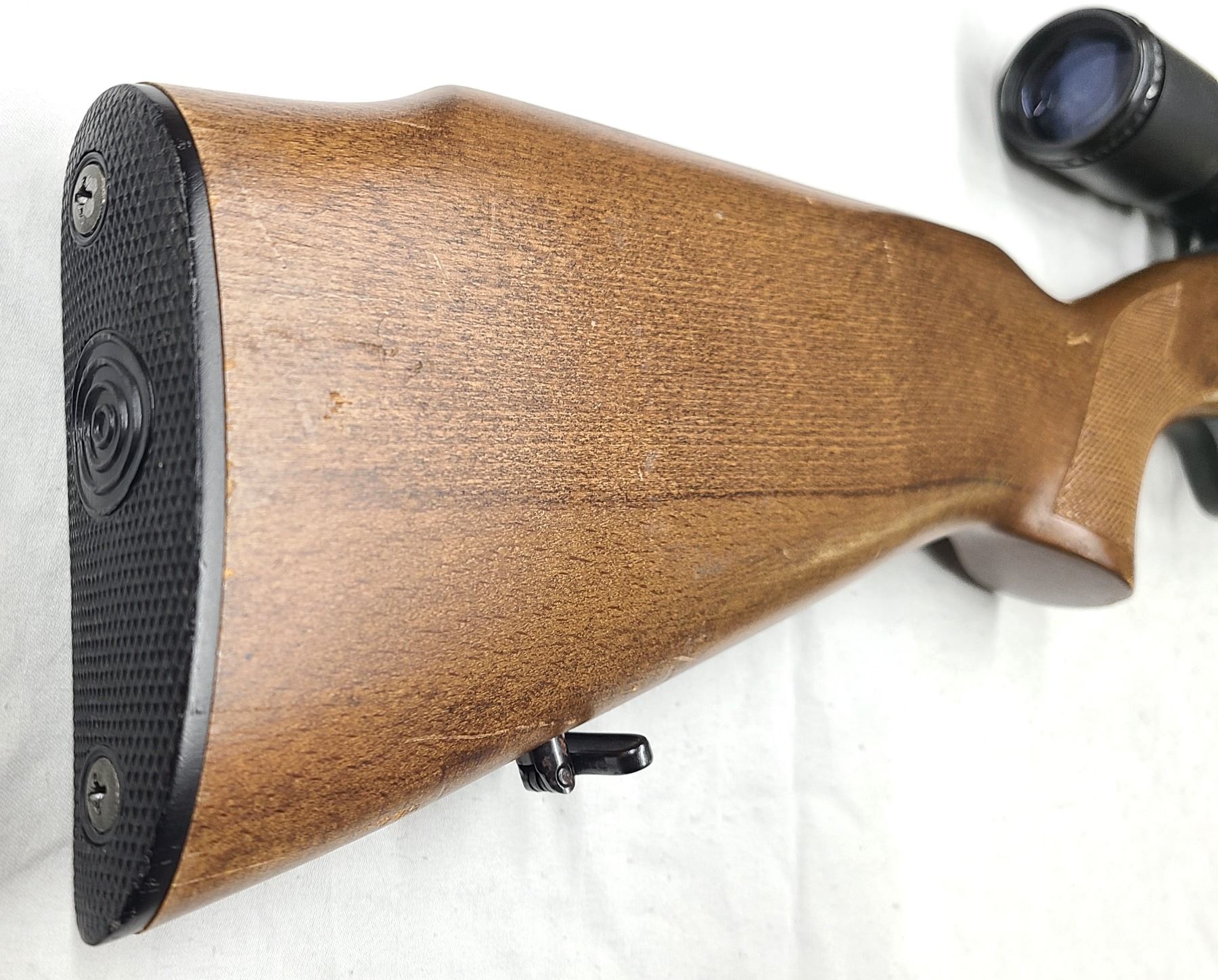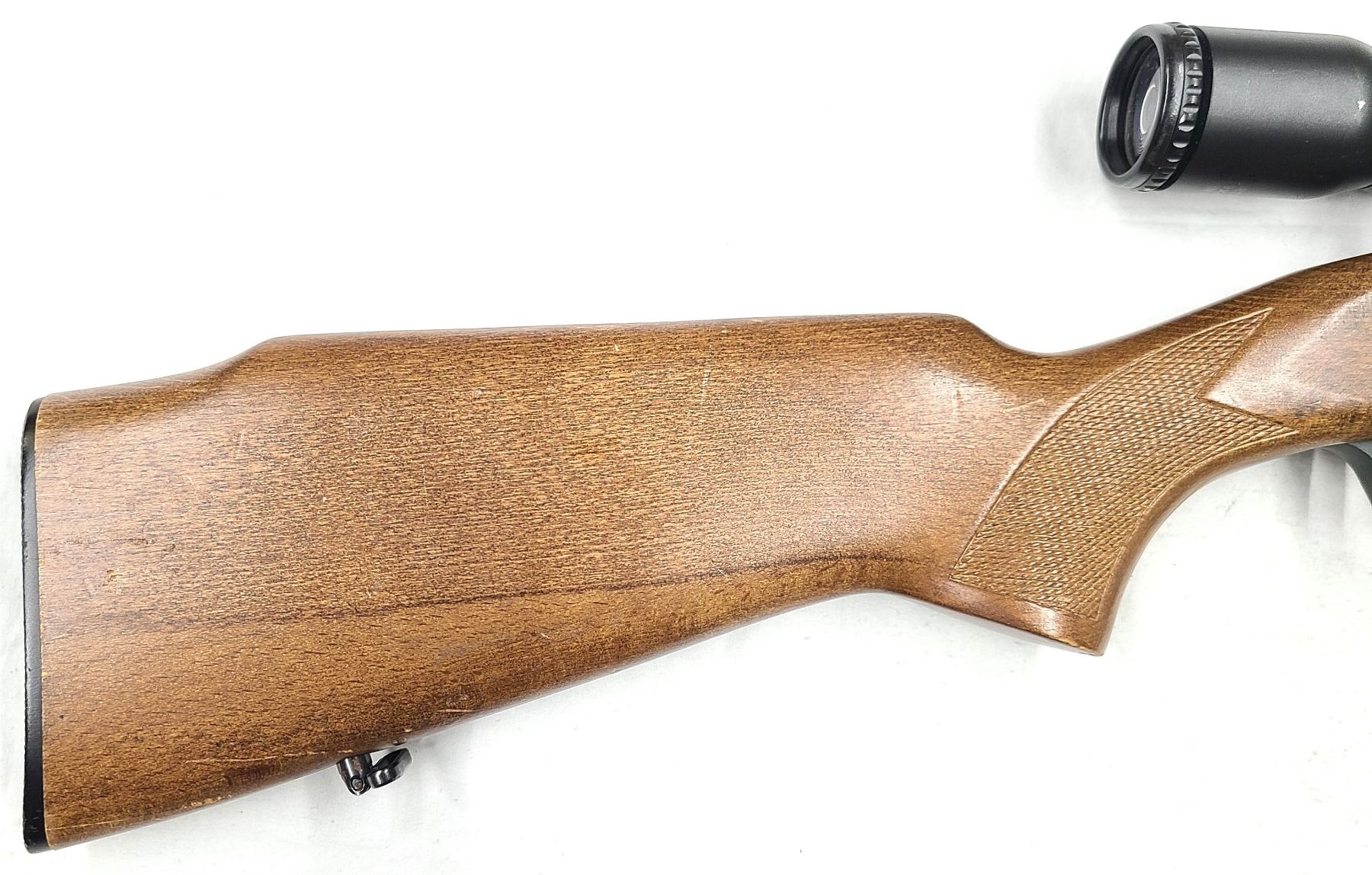 Factory grooved receiver for scope mounting has a older steel bodied Hawke 3-9 x 40 Scope installed. Scope still clear.