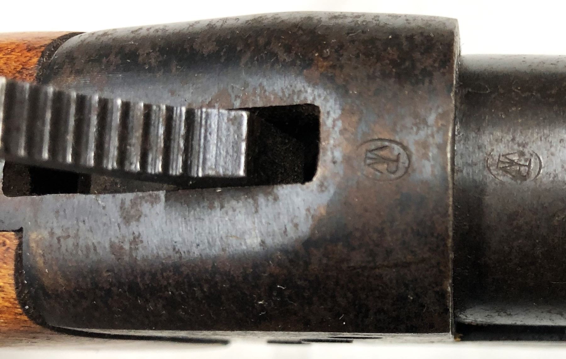 The receiver has roll engraved pattern. The bluing is at about 40% with patches of pitting.