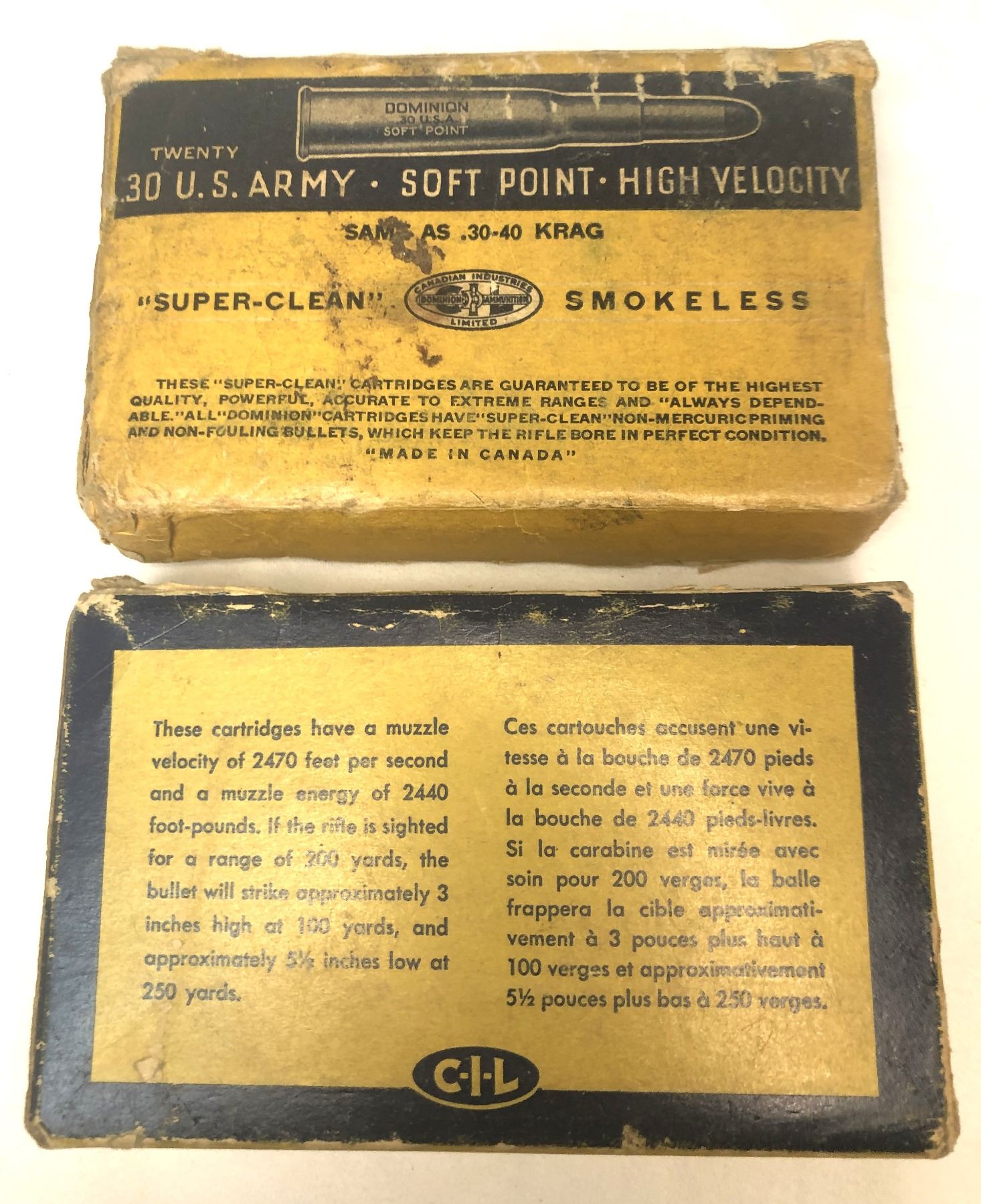 Box of 30 Cal (same as .30-40 Krag) has 18 rounds stamped 30 US Caliber