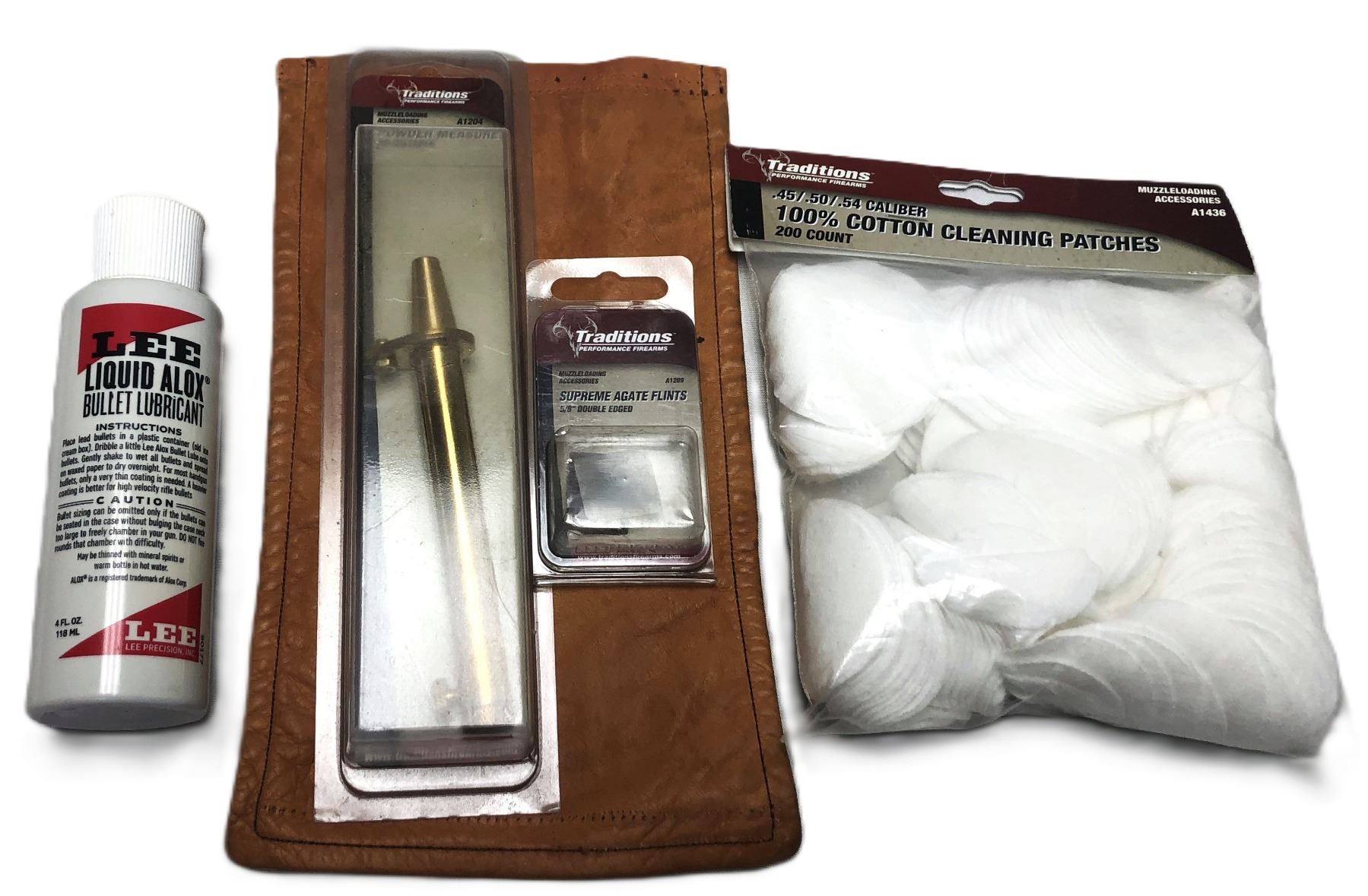 Lube, Powder measure, supreme agate flints, patches and leather pouch