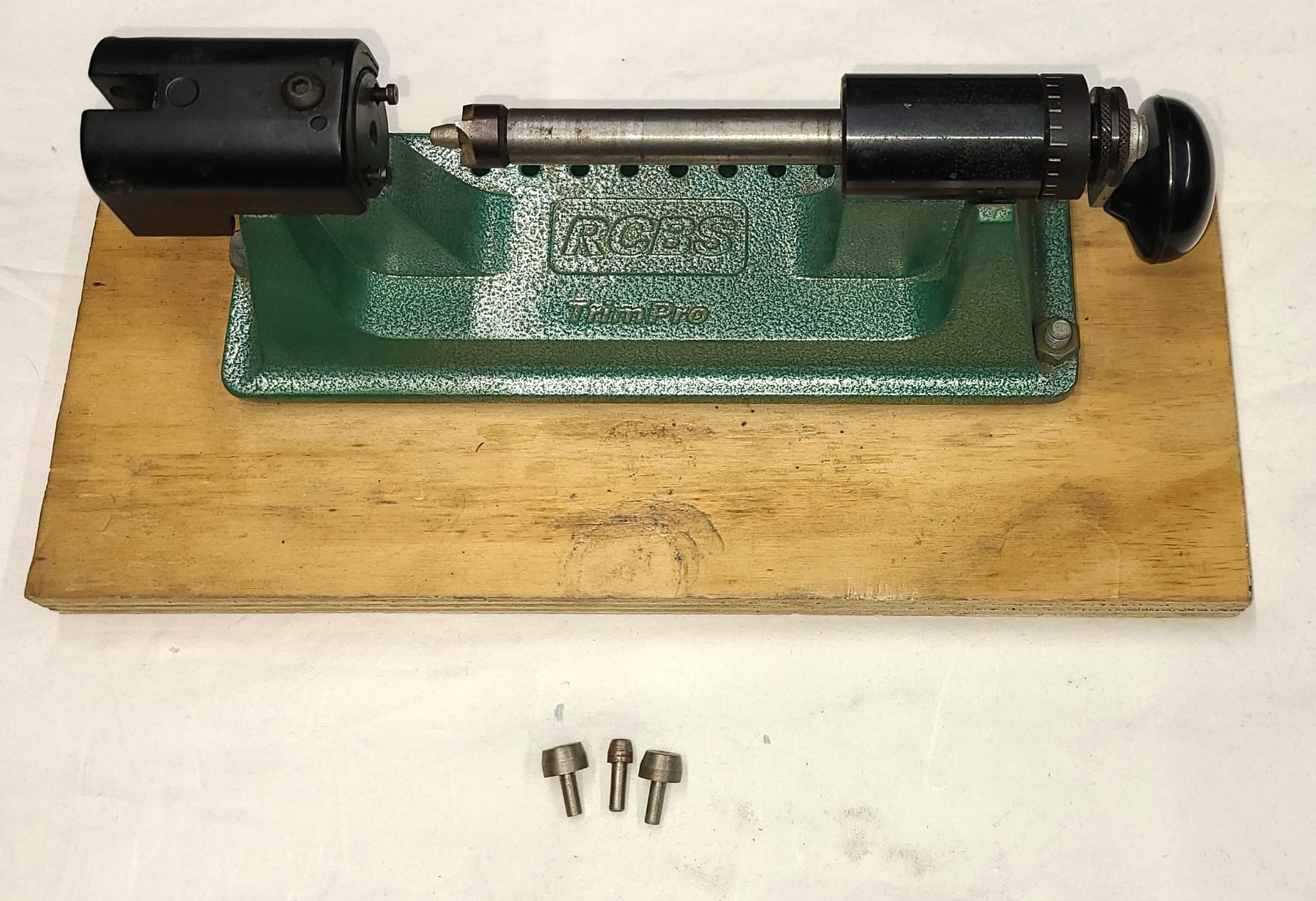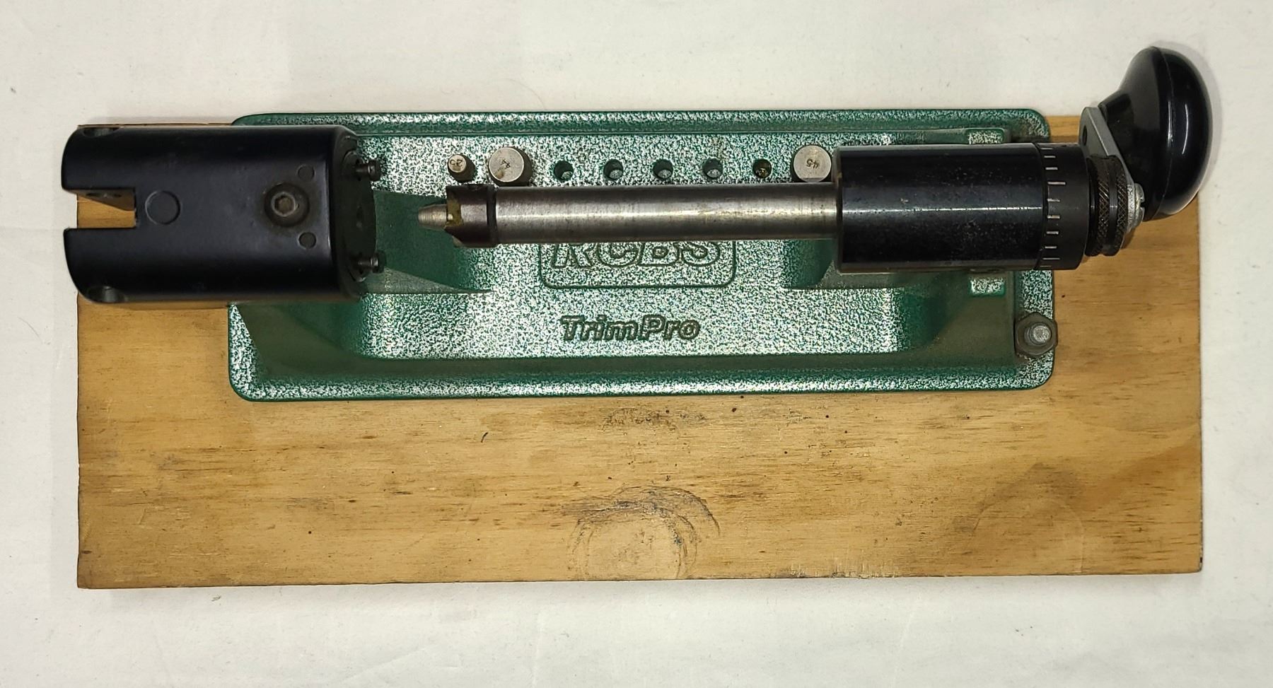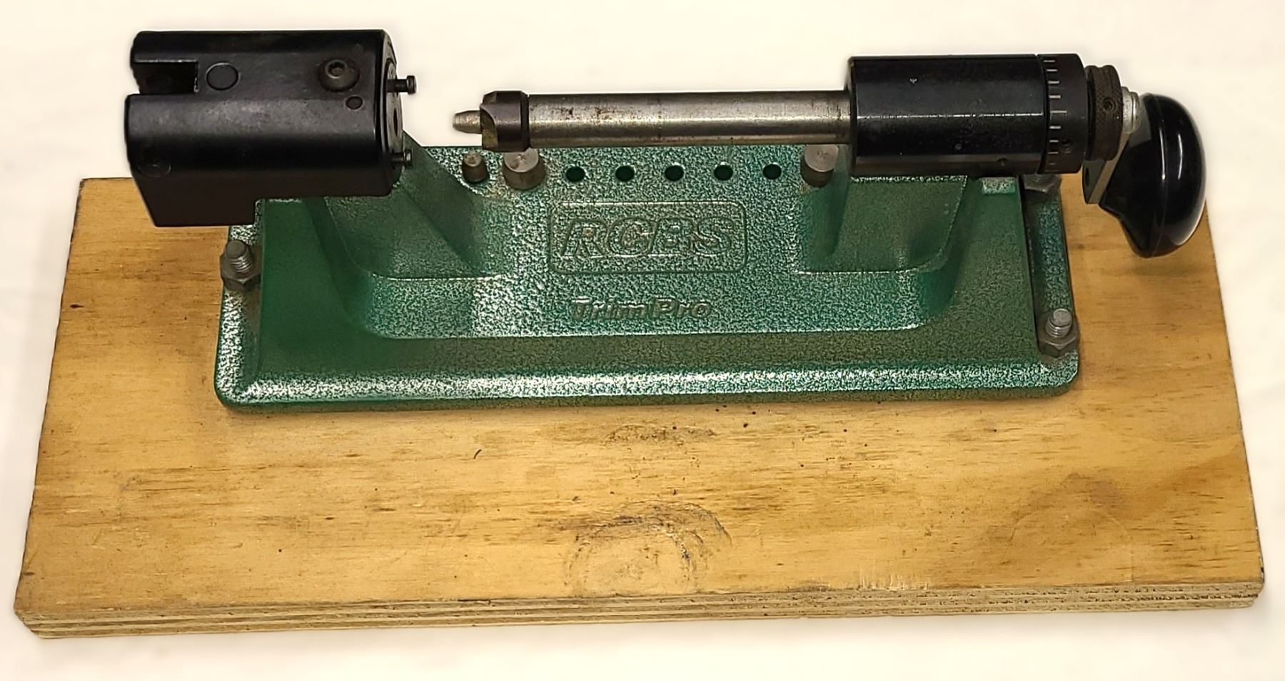 RCBS case trimmer mounted on a wood board as shown