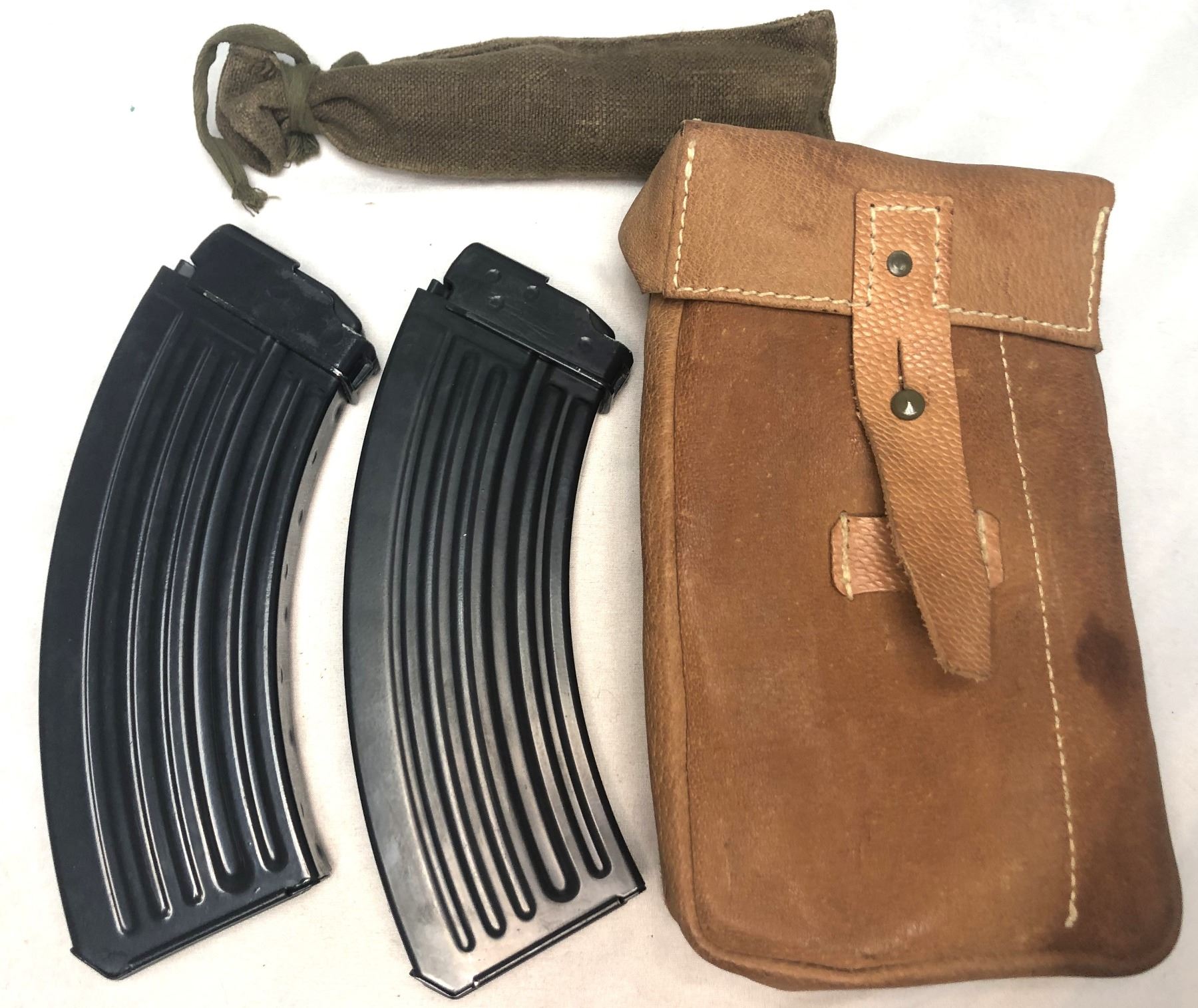 Lot of 2 metal Czech VZ58 magazines with a leather pouch that can hold 2 mags