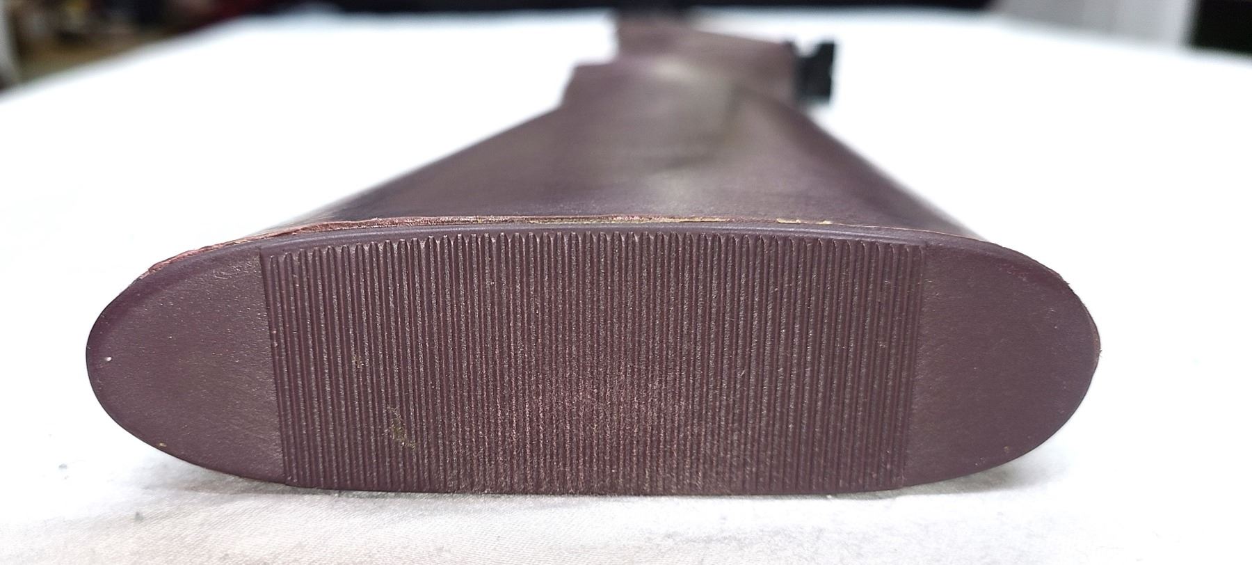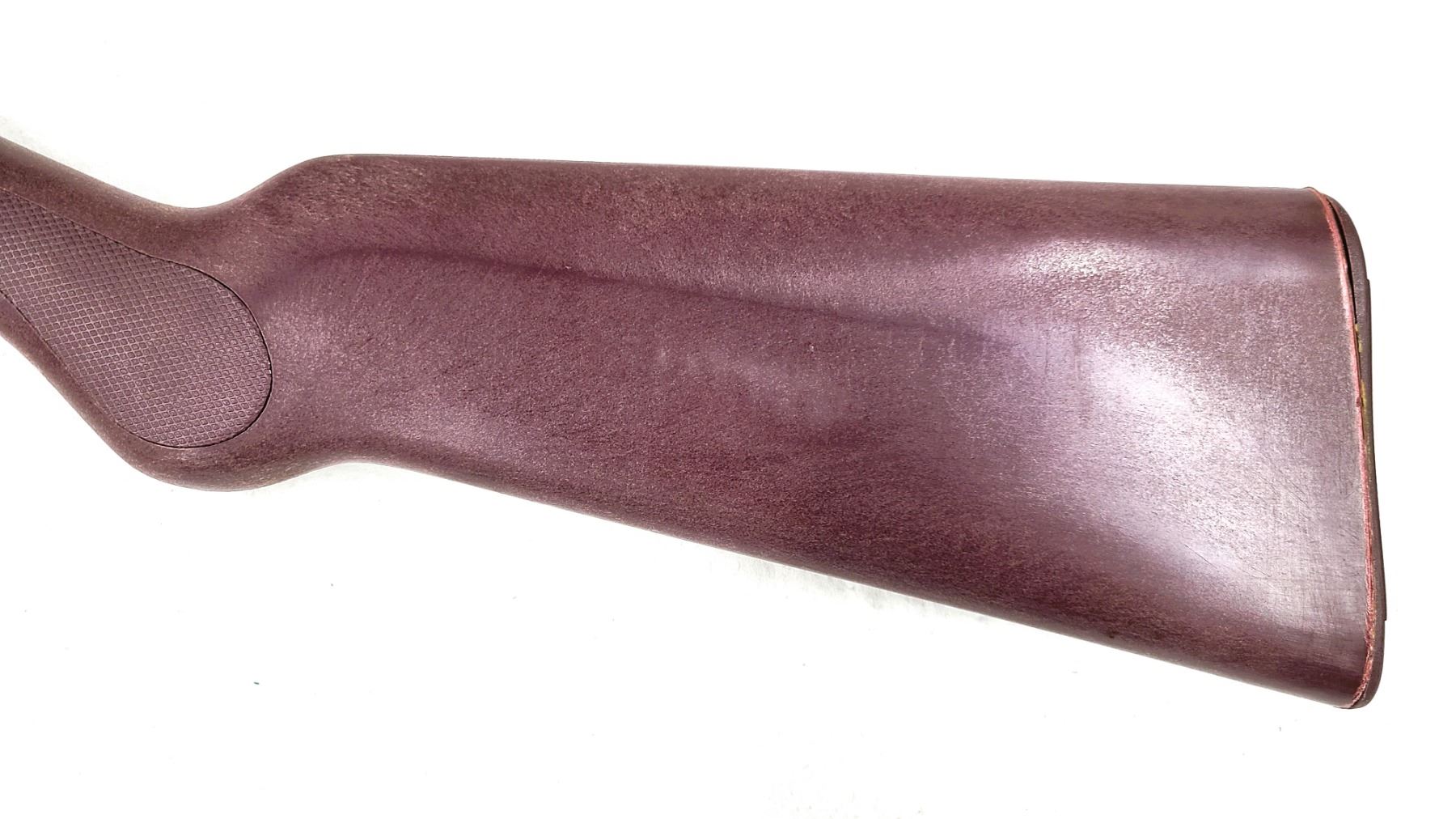 Synthetic checkered round pistol grip stock, matt maroon in color.