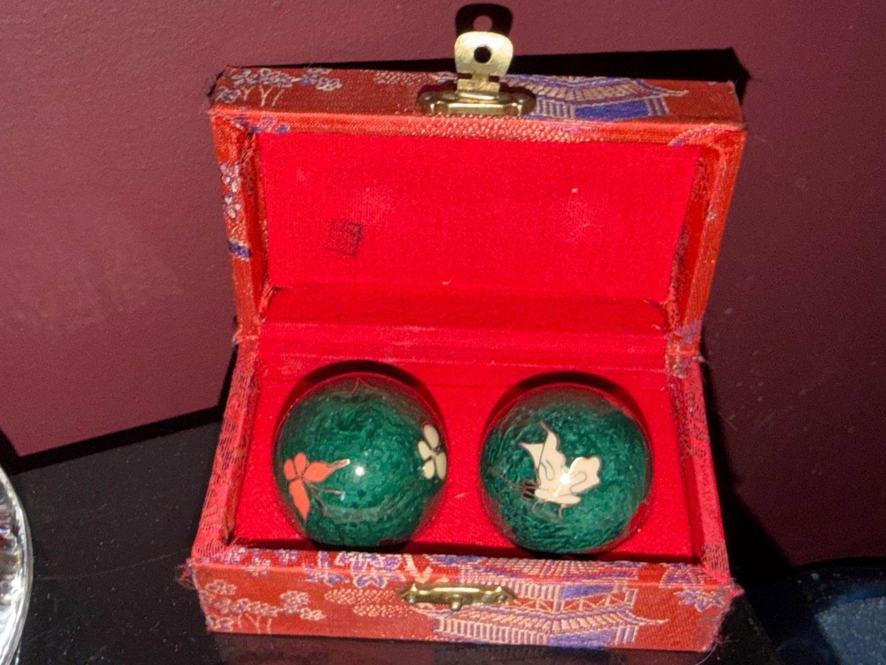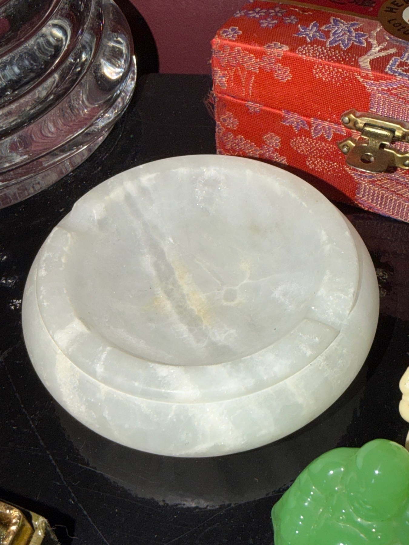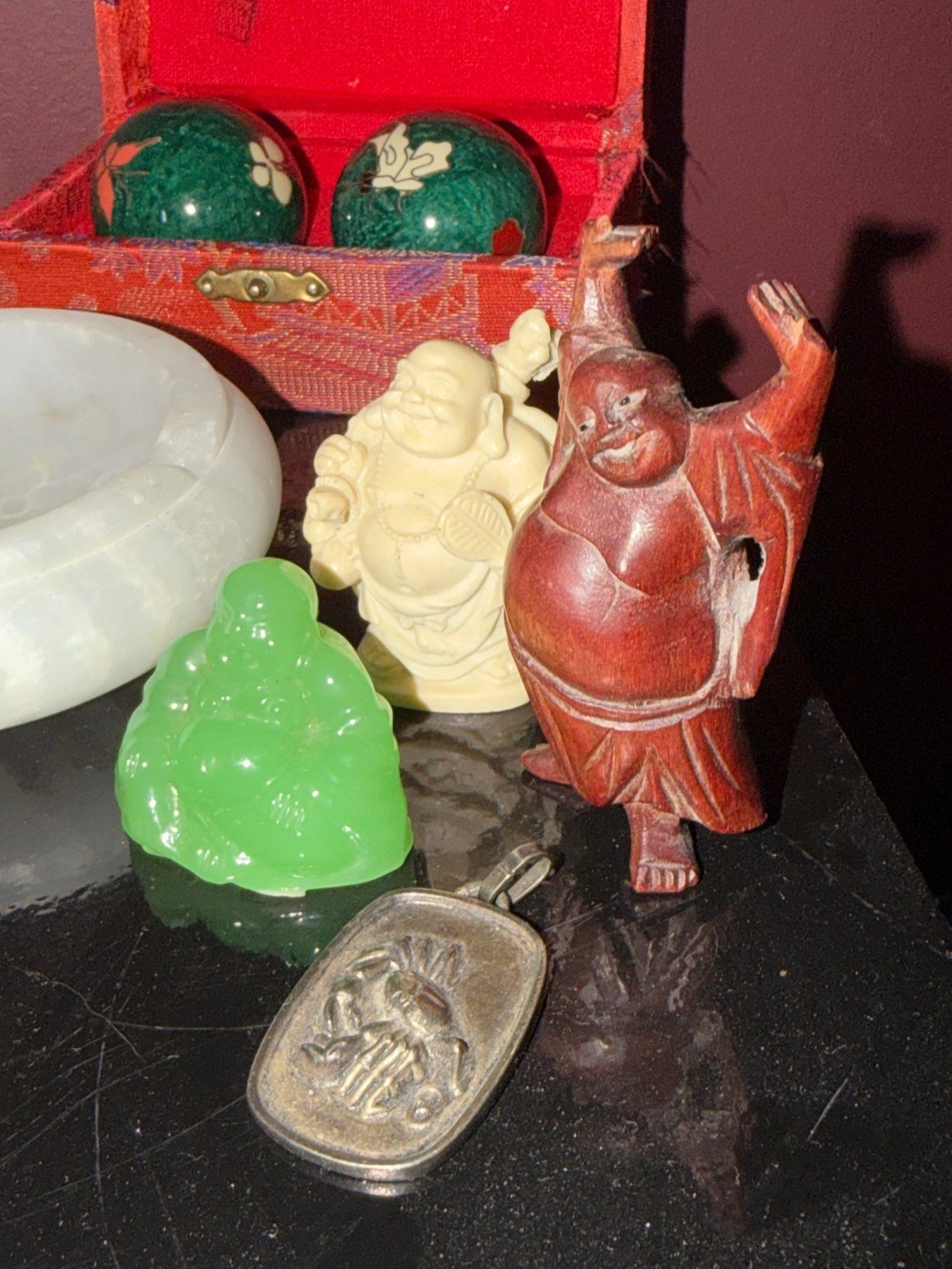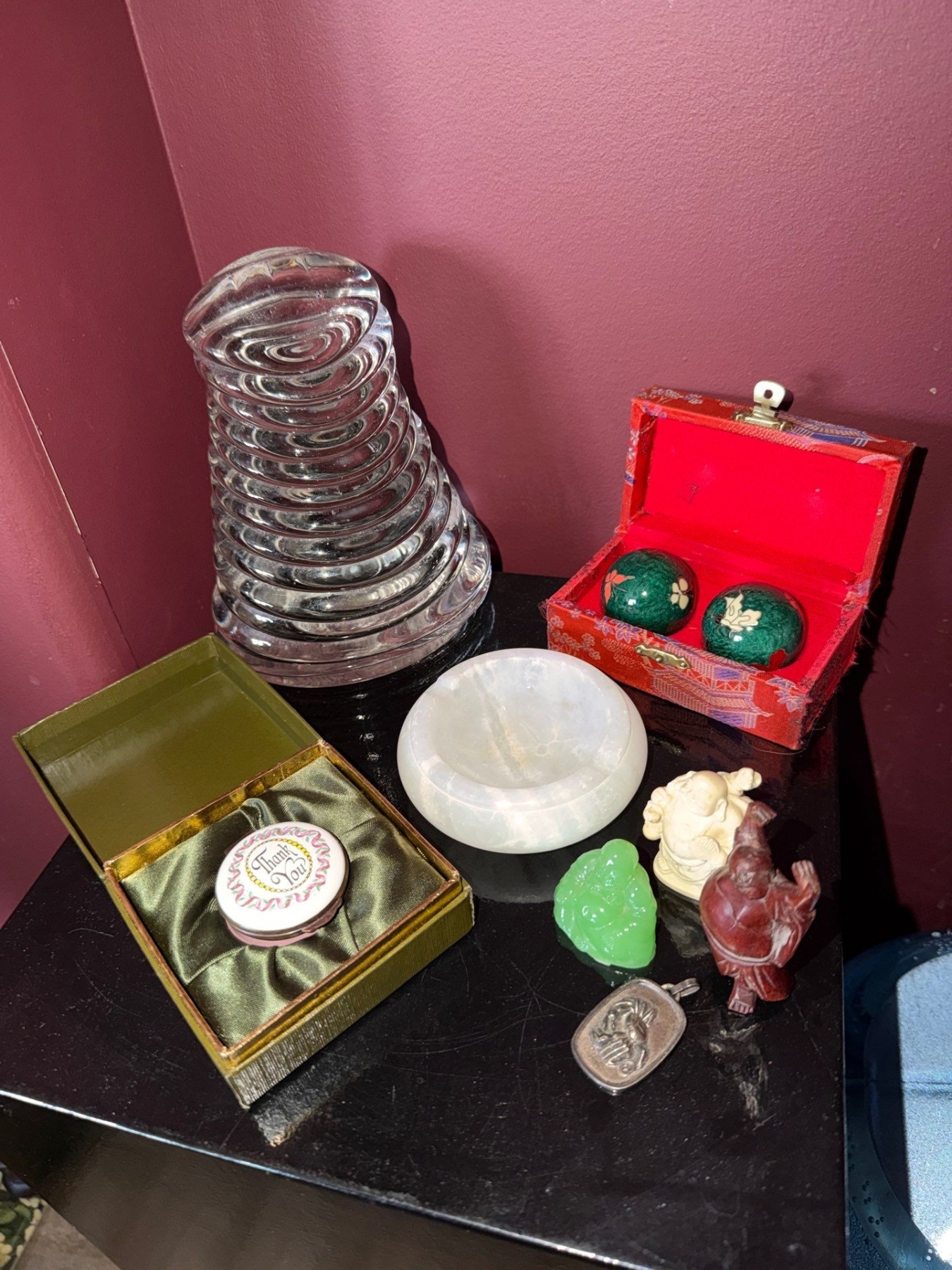 Lot 42 Vintage Pill Box w/ Art Glass Paper Weight Asain Harmony Balls Marble Ashtray Buddah Figurine & More