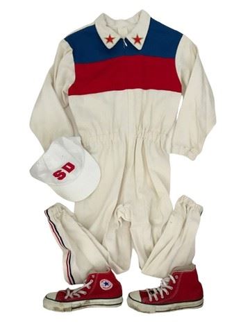 The Extreme Adventures of Super Dave (2000) - Little super Dave's (Michael Angarano) white with red and blue color block jumpsuit with red, white and blue stripe down the sides, red converse sneakers and white SD baseball cap.