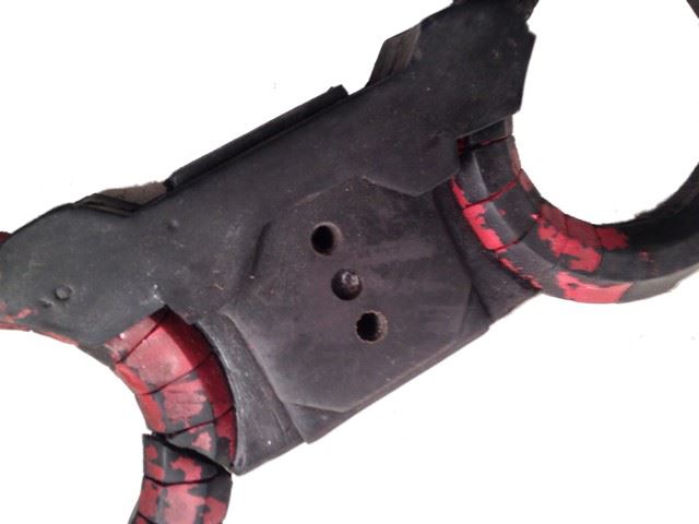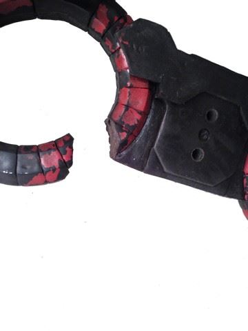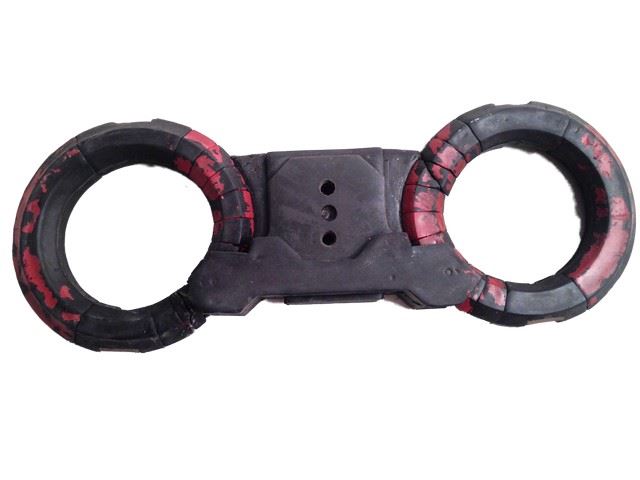 Umbrella Corporation screen used colonial red and canyon black manacles(handcuffs) both of the cuffs have a torn opening. (Non-functioning soft rubber) (Approx. 12" x 5")
