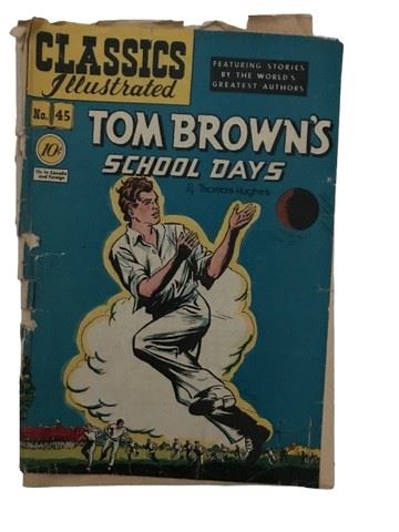#45 – Tom Brown’s School Days by Thomas Hughes Condition: Fair Torn and creased spine with additional creases along the bottom. A classic coming-of-age story set in Victorian England, this copy shows wear but retains its collectible appeal.