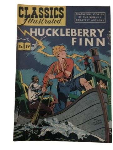 #19 – Huckleberry Finn by Mark Twain Condition: Fair to Good Twain’s iconic tale of freedom and friendship along the Mississippi, brought to life with expressive illustrations and period charm.