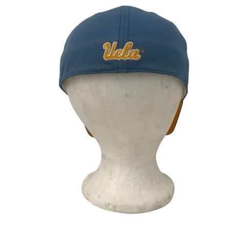 UCLA coaches signed blue UCLA Bruins baseball cap with gold embroidered lettering. Elastic; one size fits most. Gold underside of brim.