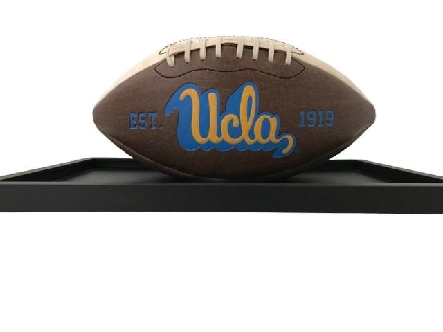 Brett Huntley autographed white and orange UCLA embossed and embroidered football featuring a vintage style, marked 1919 and signed “Brett Huntley #17”.