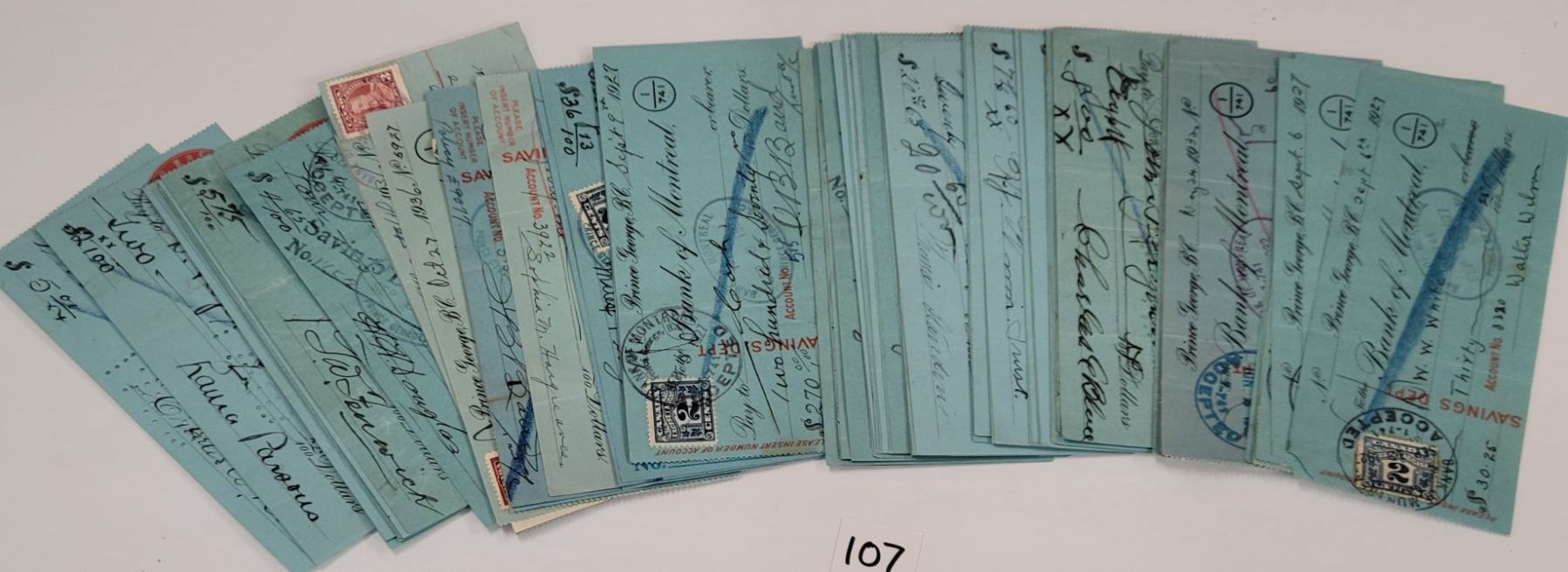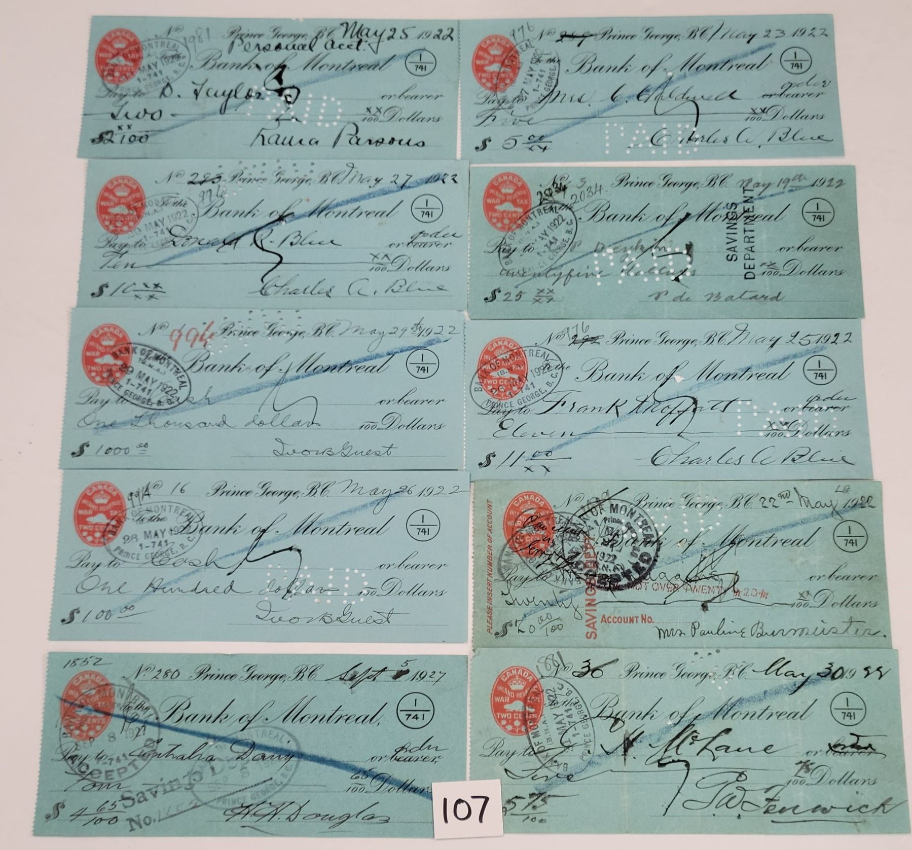 Lot 107 Prince George, British Columbia Canada Bank Of Montreal Checks, Notes Approx. 65