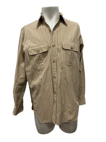 Unidentified Anto of Beverly Hills long sleeve, beige and brown with blue dotted lines striped dress shirt with the initials AC and the date August 1996 sewn into the label. Sony W is handwritten inside the tag.