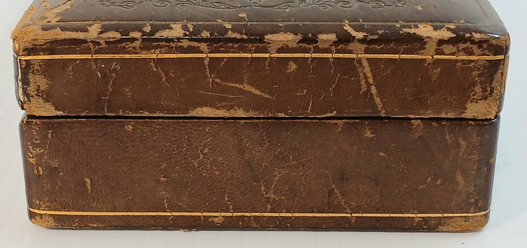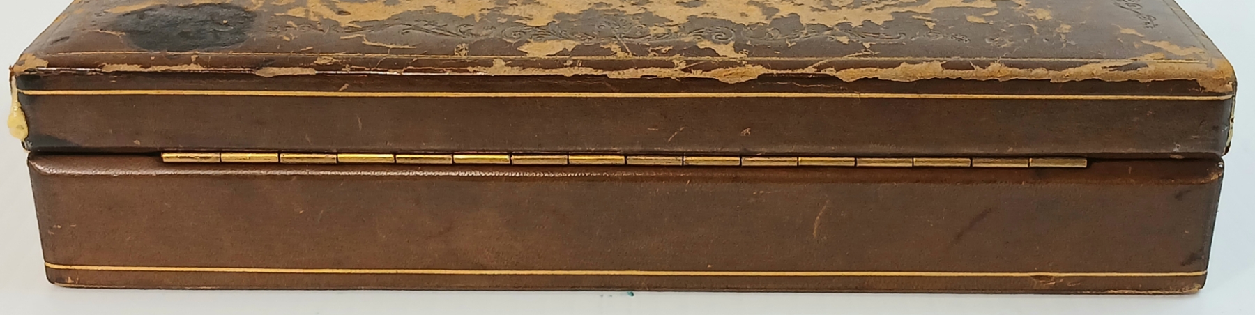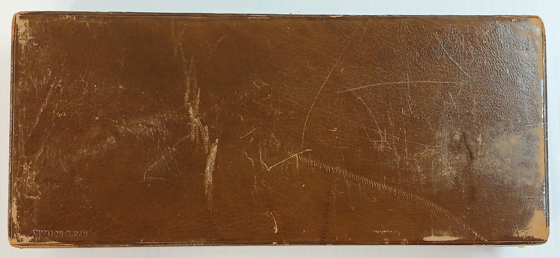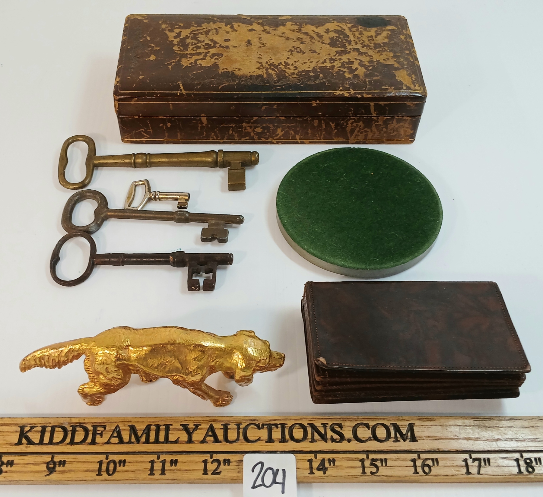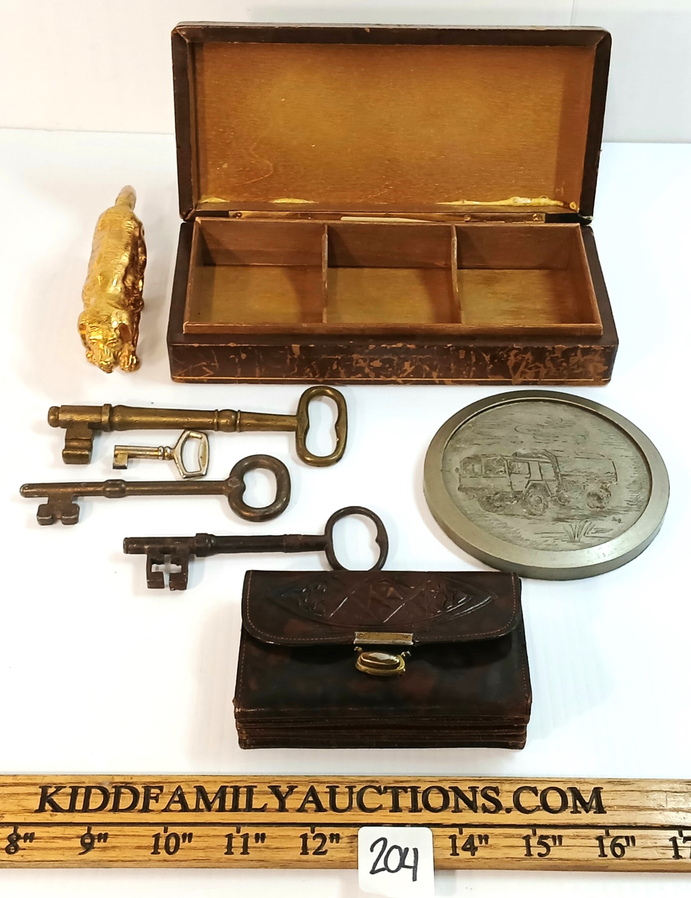 Lot 204 JOB LOT - ITALIAN TRINKET BOX, BRASS SETTER, LEATHER ACCORDION WALLET, KEYS & ENGRAVED COASTER