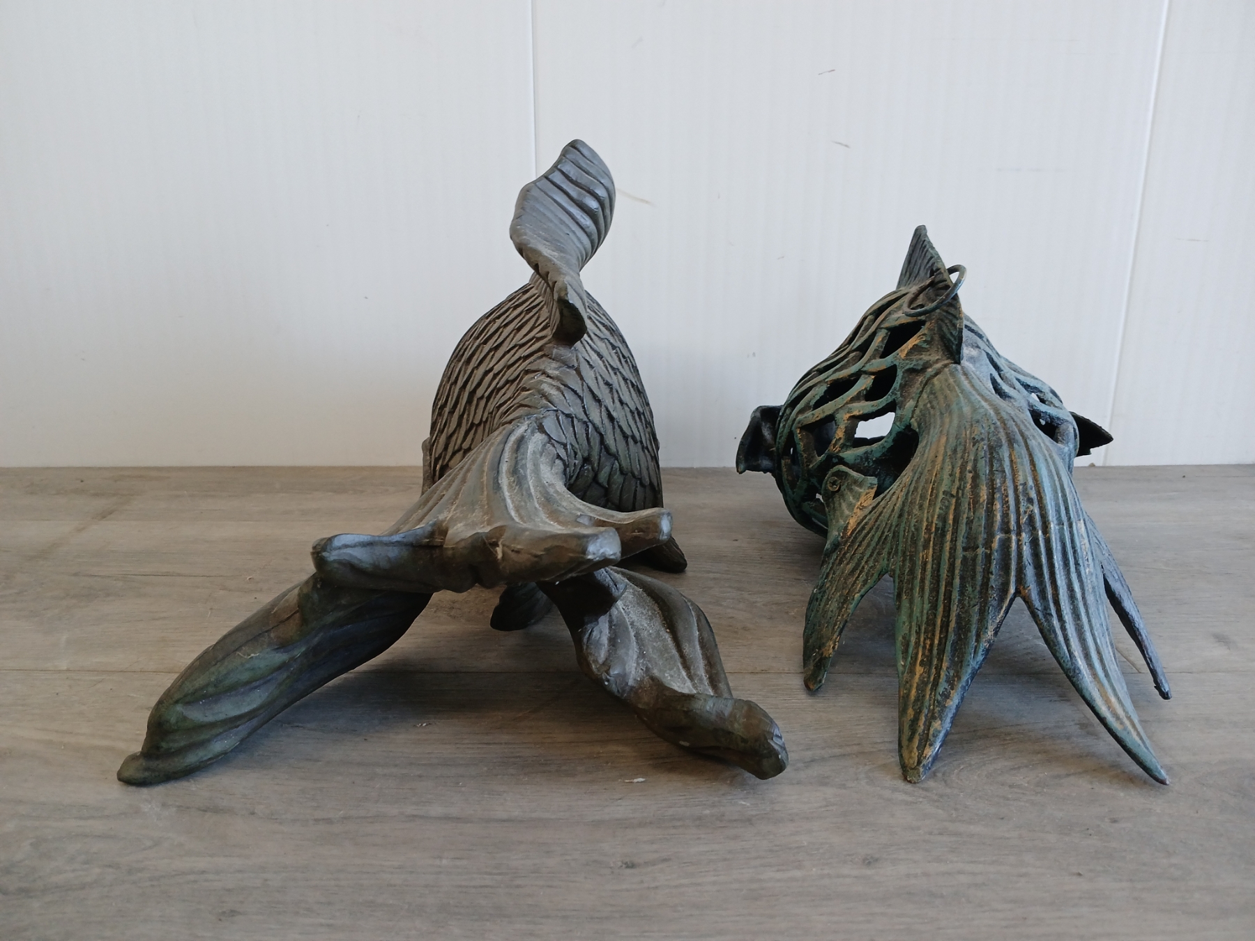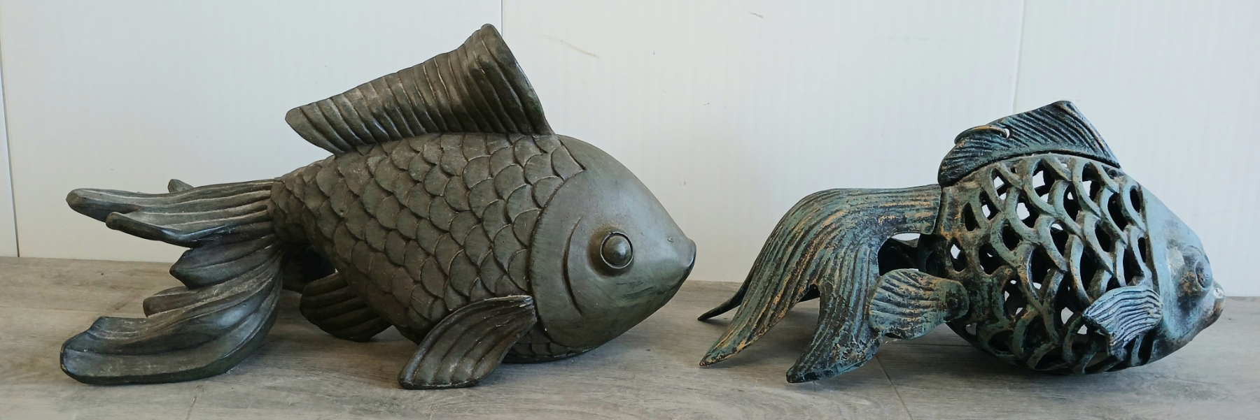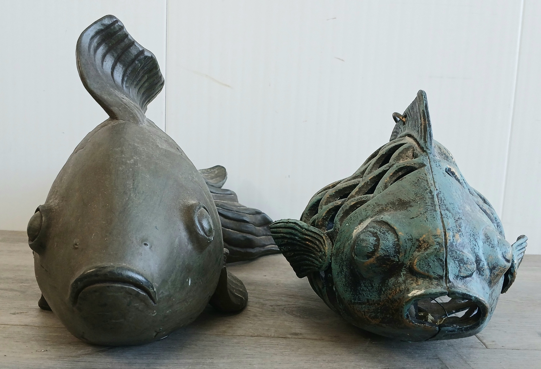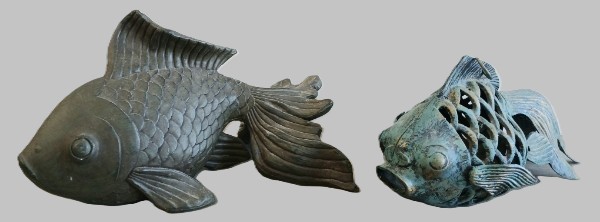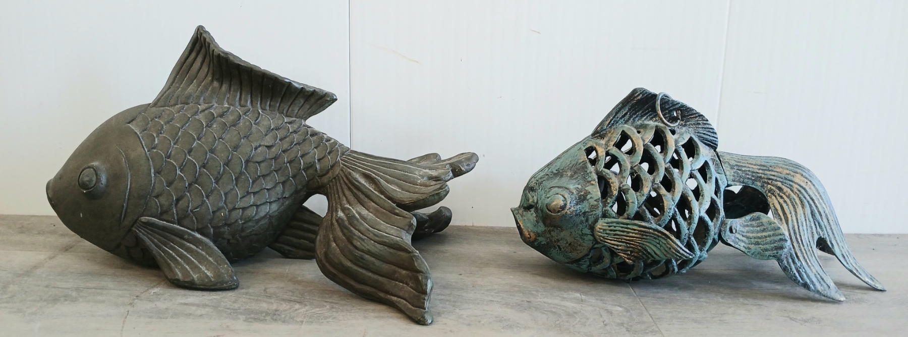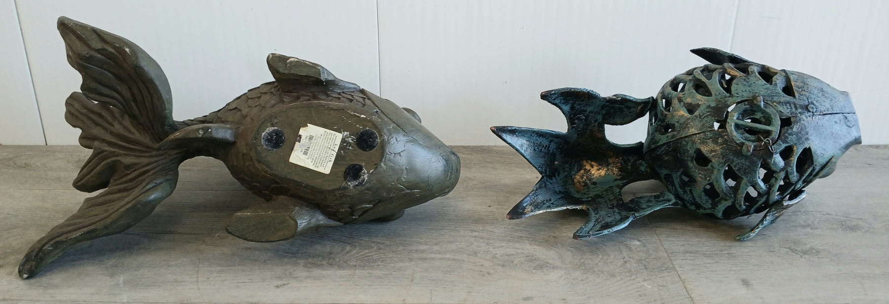 Lot 218 LOT OF 2 - METAL & PLASTER KOI FISH GARDEN STATUES - 21ST CENTURY