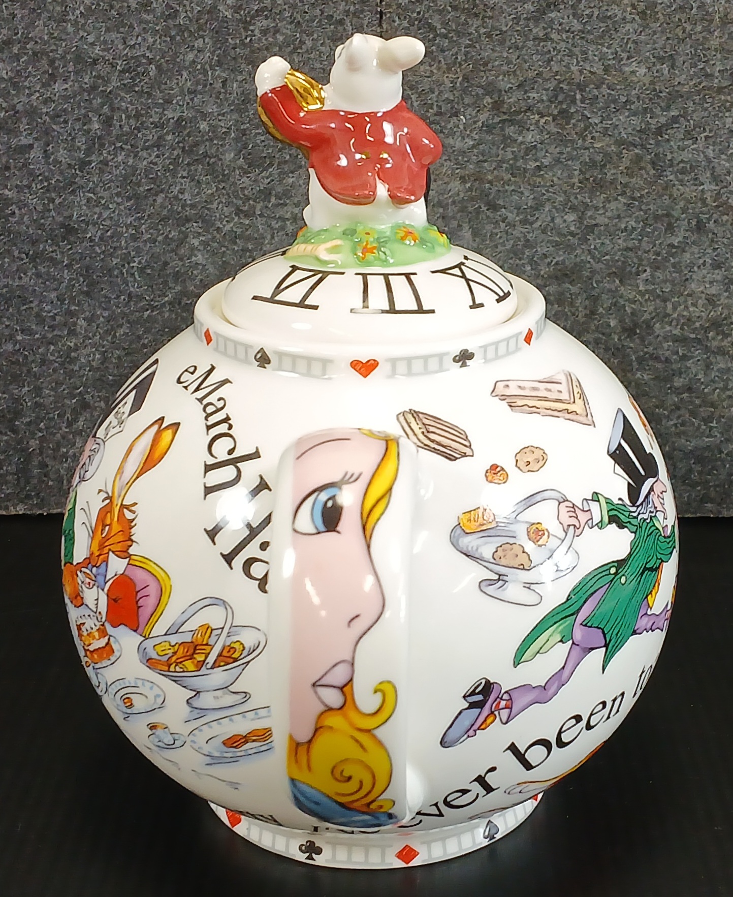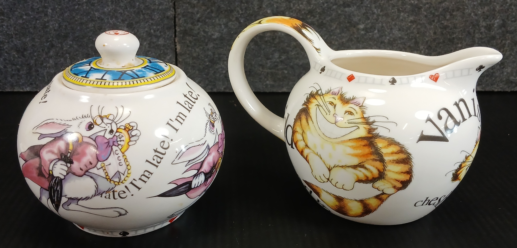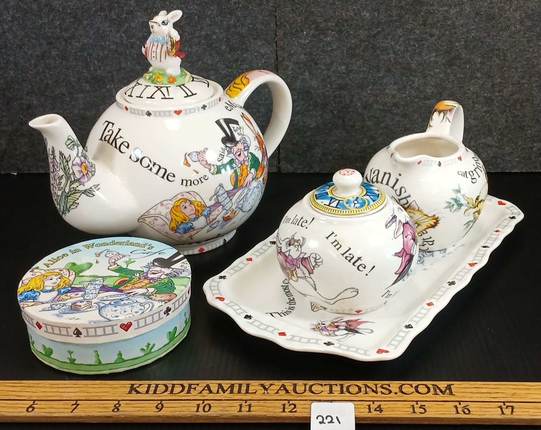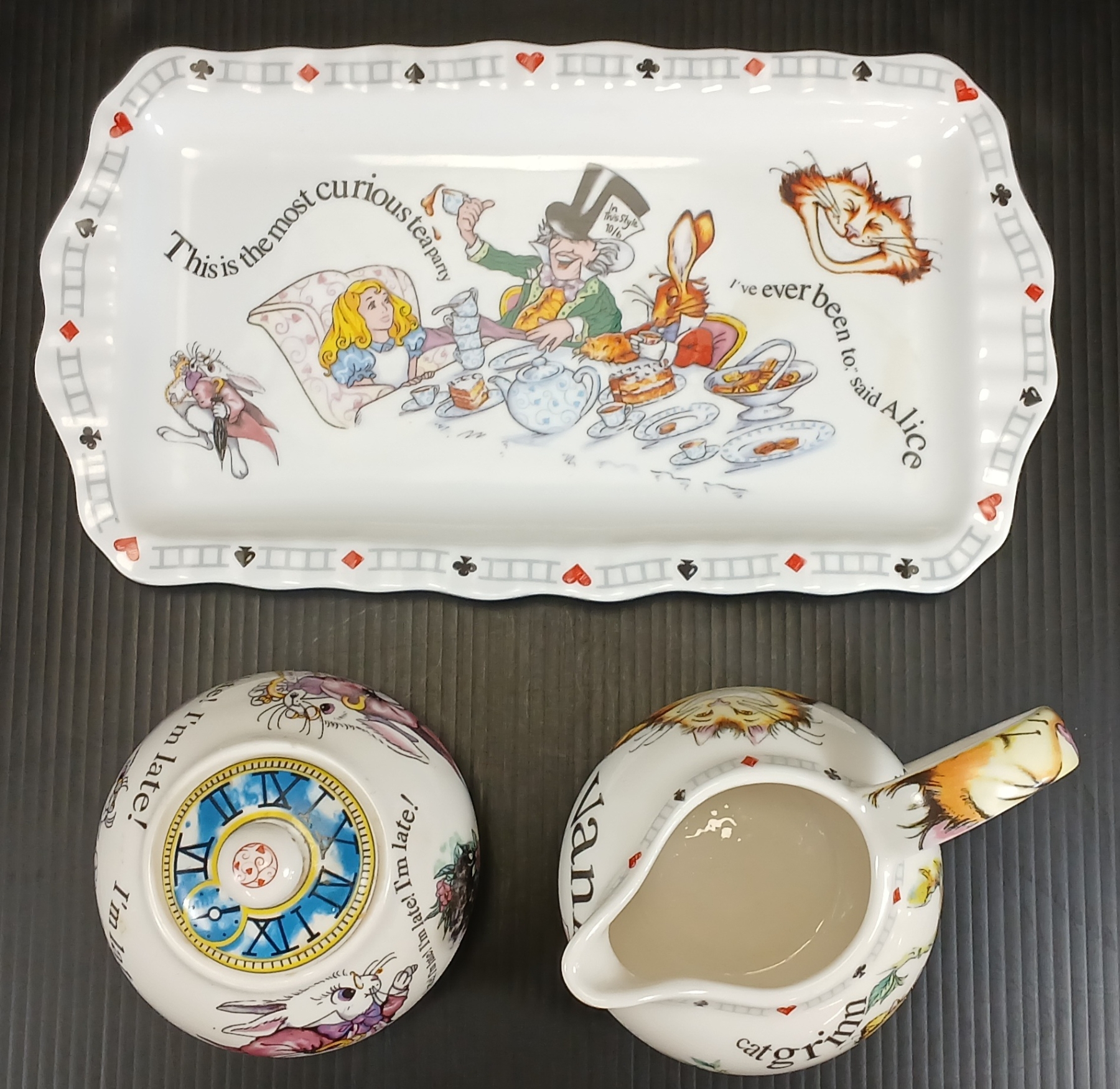 Lot 221 LOT OF 5 - ALICE IN WONDERLAND PORCELAIN TEAPOT, CREAM PITCHER, SUGAR BOWL, TRAY & COASTERS